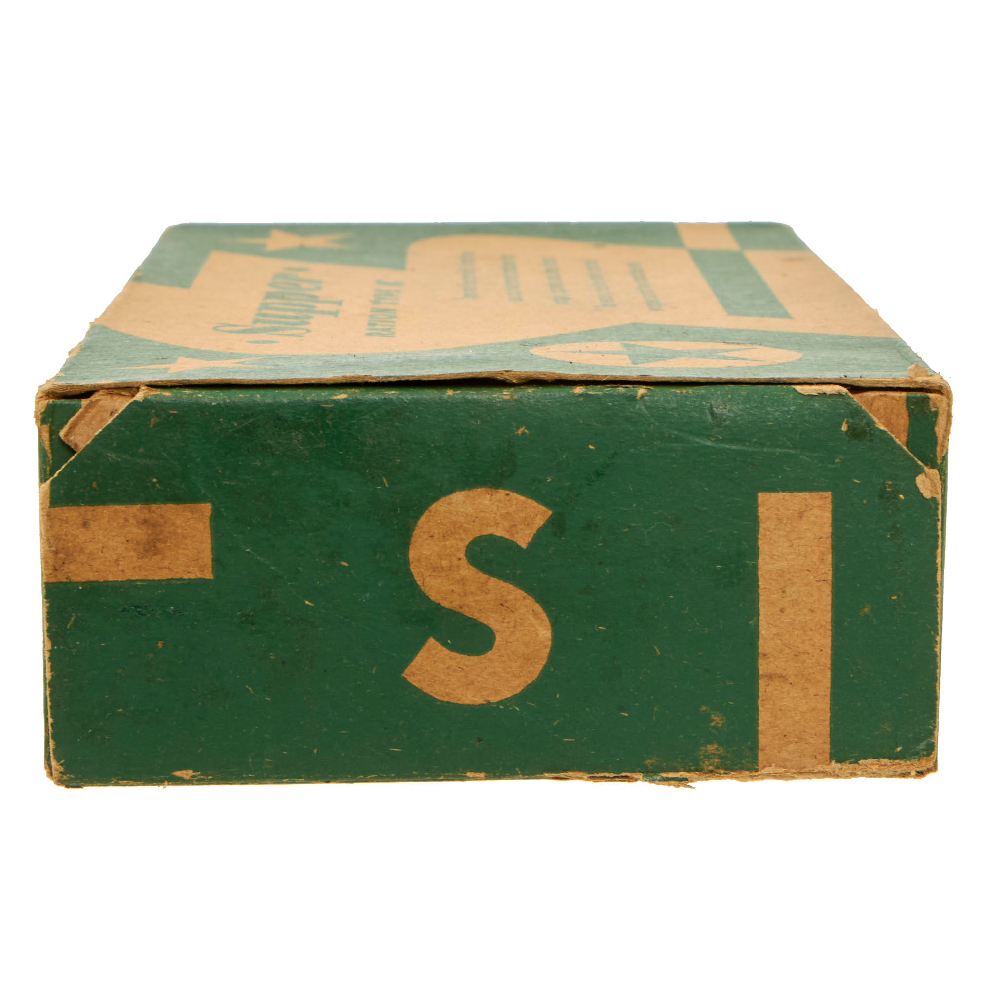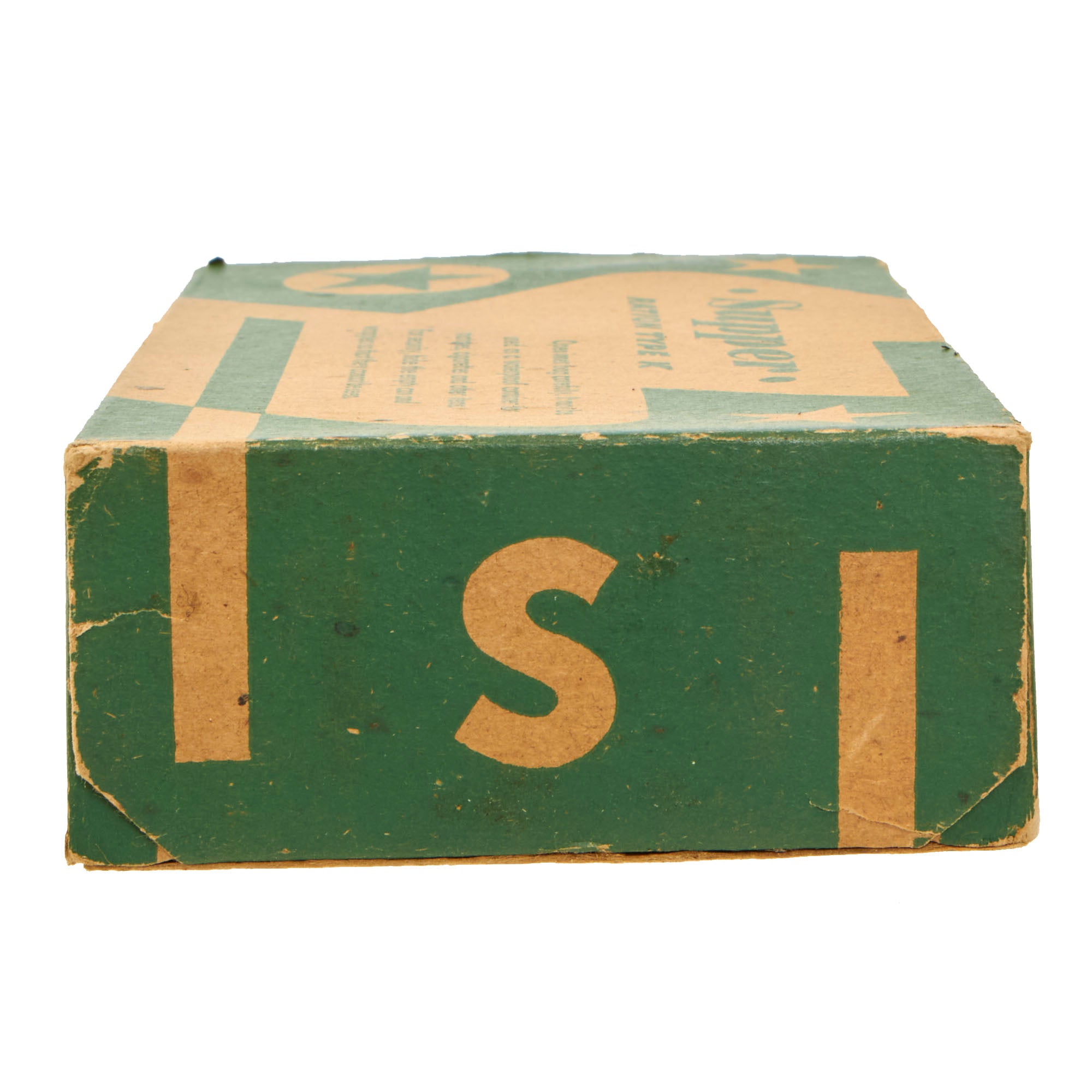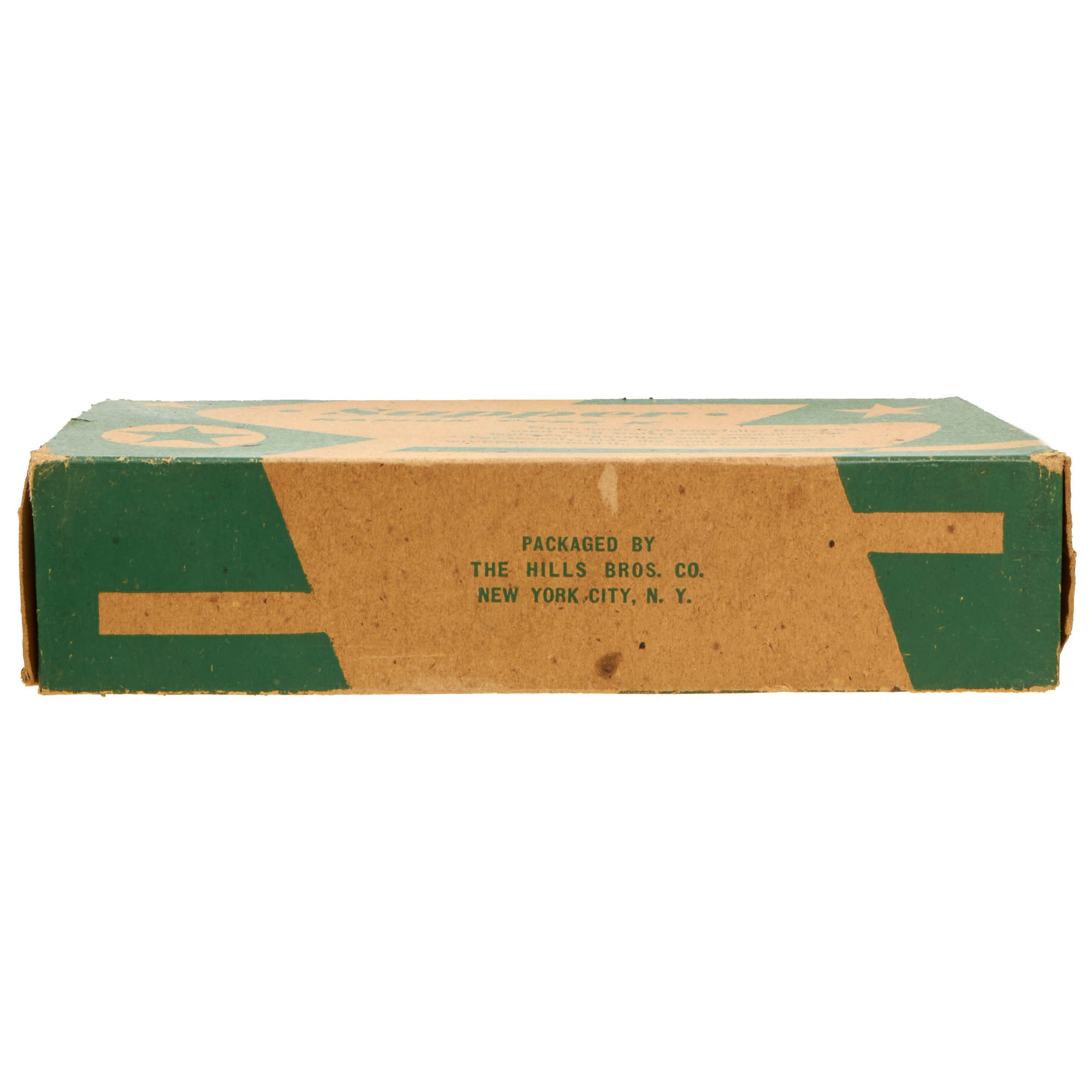 - Unopened Supper Ration Type K (Hills Bros. Co.): This is a very nice unissued SUPPER unit by Hills Bros. Co.. It is the later war "Morale Series", with the green design on the exterior. We did not open the packaging, but with a gentle squeeze we can feel the contents. Unfortunately the ends were torn open slightly but the waxed inner box appears to be still sealed.