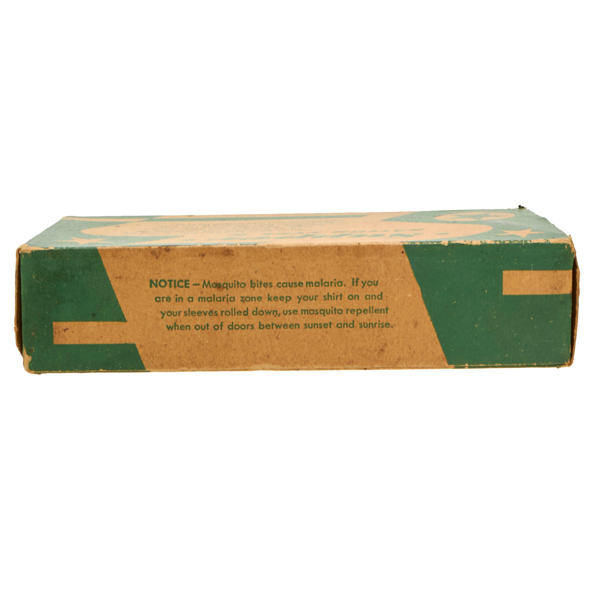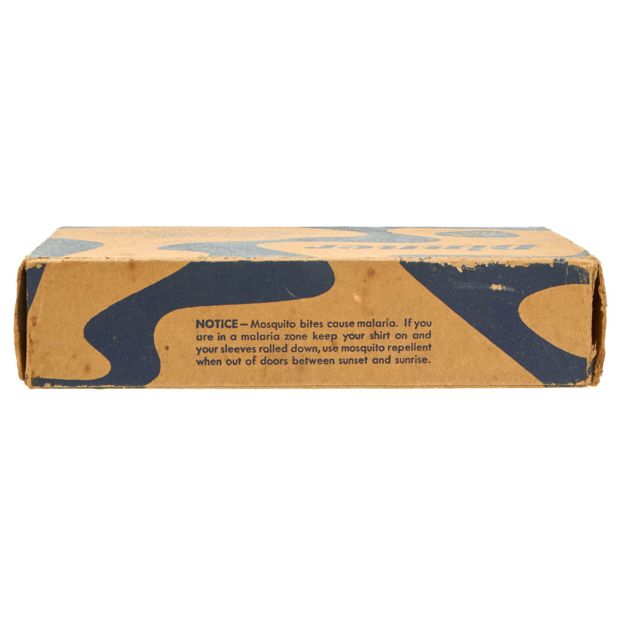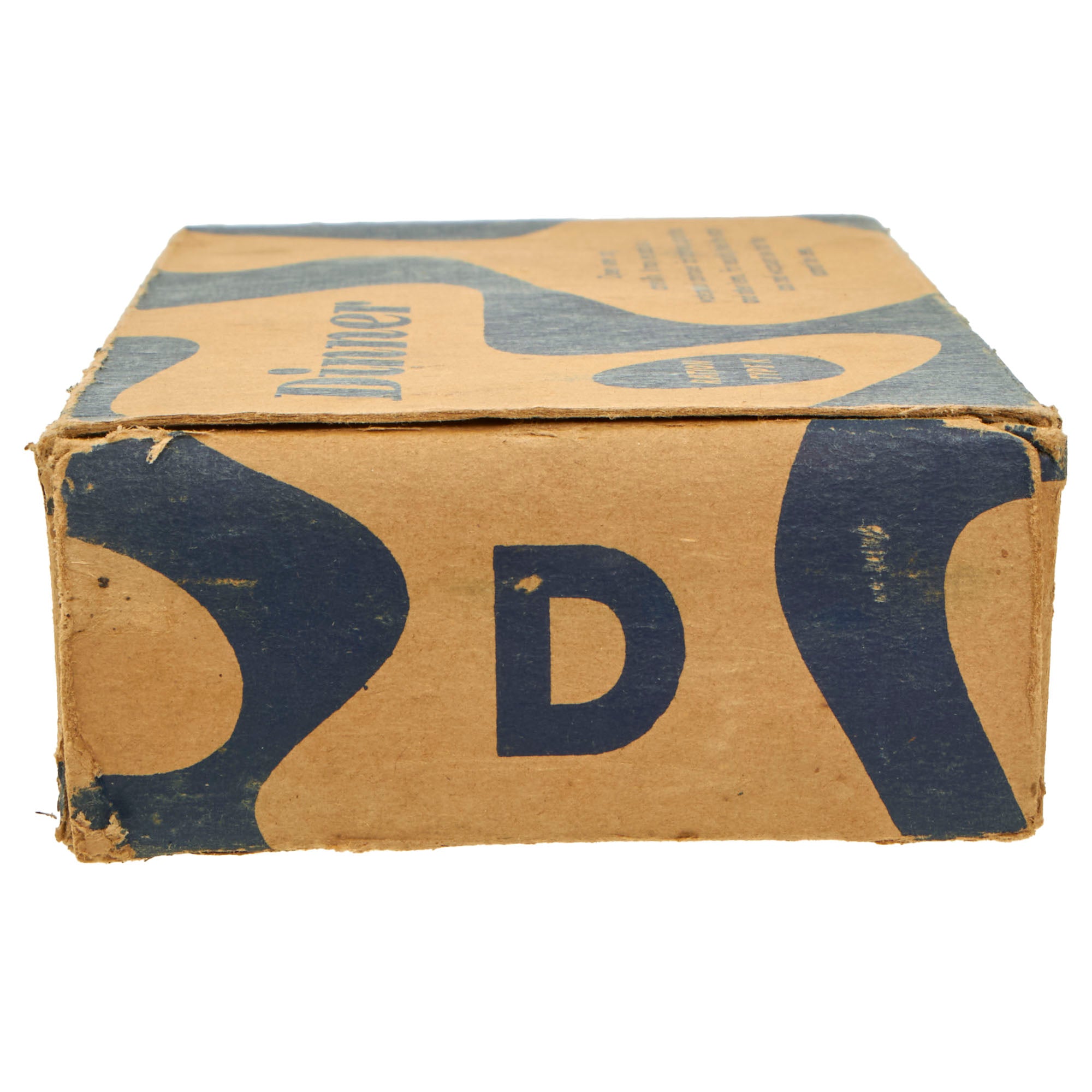- Unopened Supper Ration Type K (Hills Bros. Co.): This is a very nice unissued SUPPER unit by Hills Bros. Co.. It is the later war "Morale Series", with the green design on the exterior. We did not open the packaging, but with a gentle squeeze we can feel the contents. Unfortunately the ends were torn open slightly but the waxed inner box appears to be still sealed.