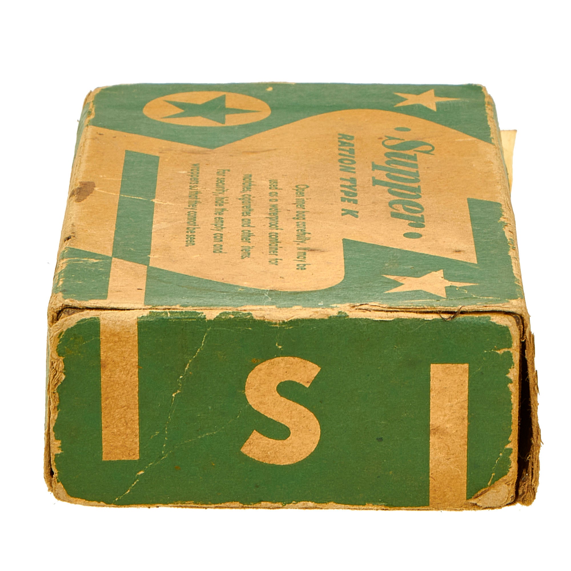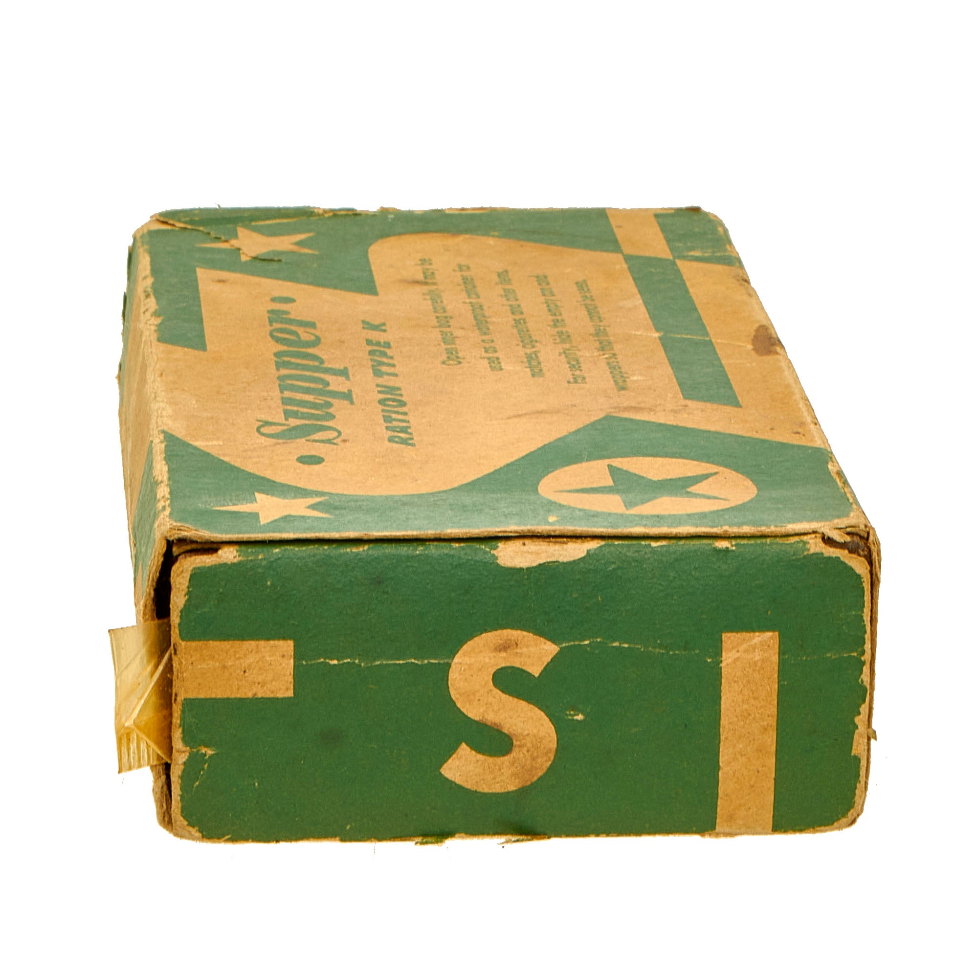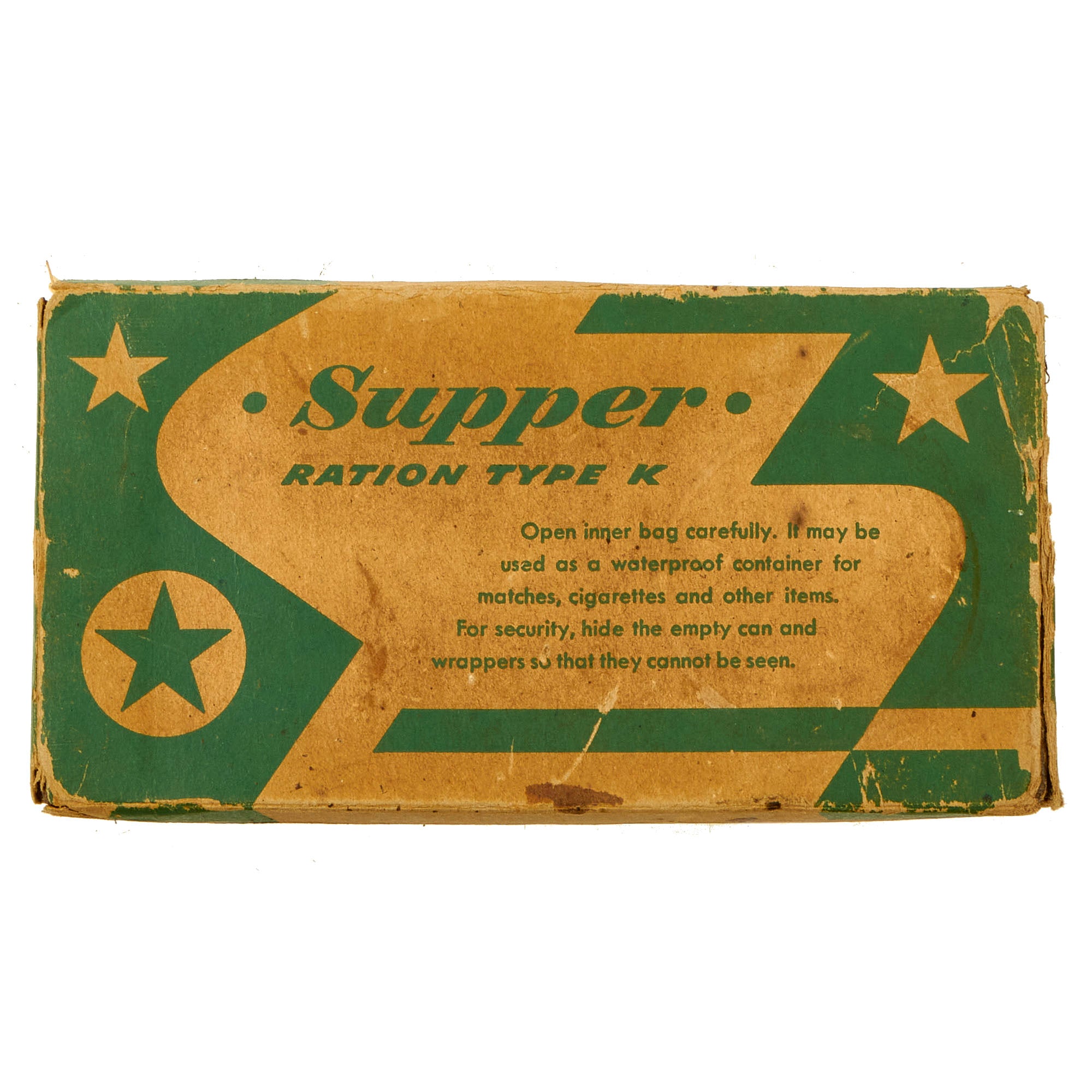 Original Items: Only One Available. The K-ration was an individual daily combat food ration which was introduced by the United States Army during World War II. It was originally intended as an individually packaged daily ration for issue to airborne troops, tank crews, motorcycle couriers, and other mobile forces for a short duration. The K-ration provided three separately boxed meal units: breakfast, dinner (lunch) and supper (dinner).