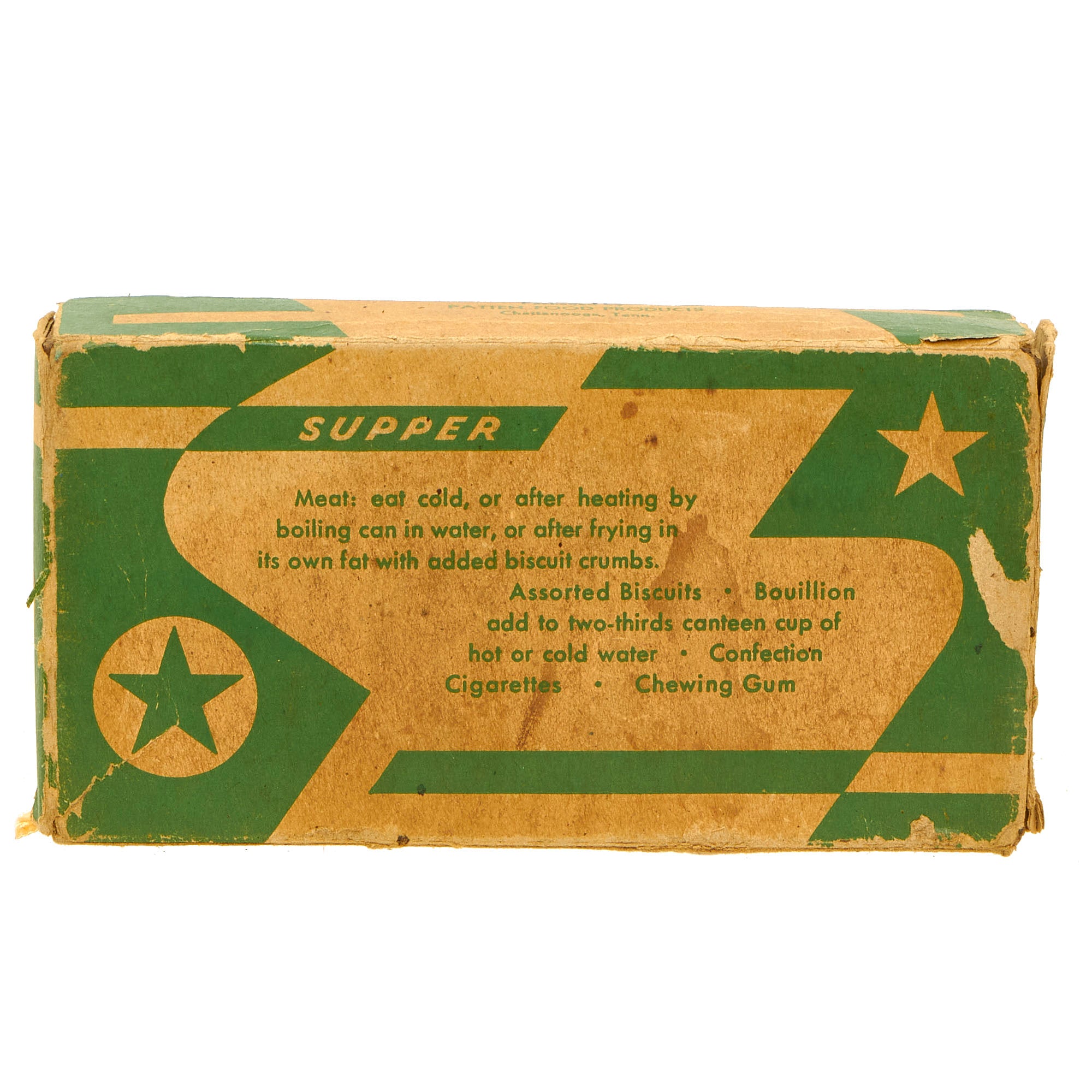 This is a very nice unissued SUPPER unit by PATTEN FOOD PRODUCTS of Chattanooga, Tenn. It is the later war "Morale Series", with the green design on the exterior. We did open this (previously) opened ration to check and confirm the contents. It appears that all original contents are present; The entree, cardboard sleeve, and key, Sealed pack of Cigarettes, book of matches, stick of Gum, and Cracker-Chocolate-Drink Mix Pack which is still sealed.