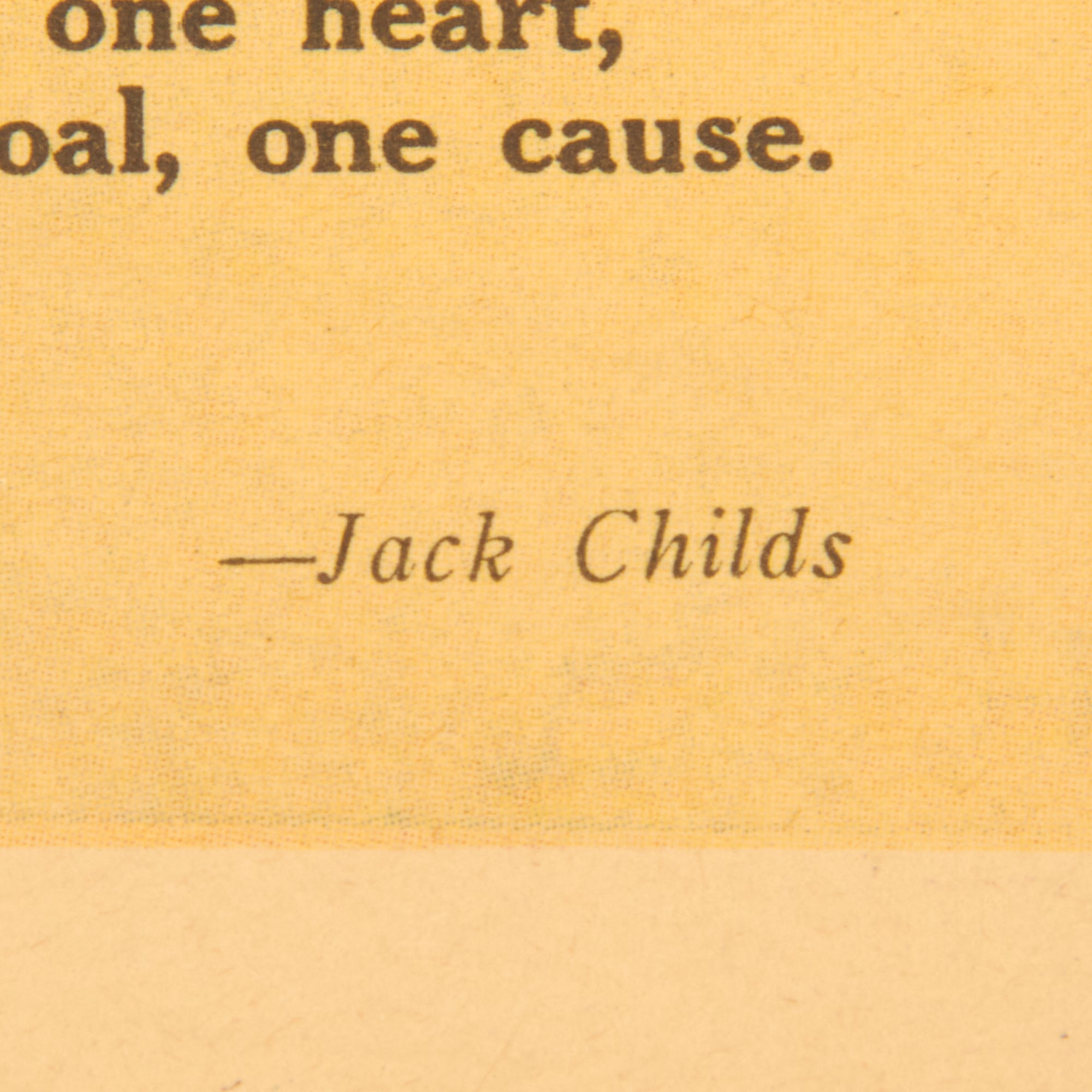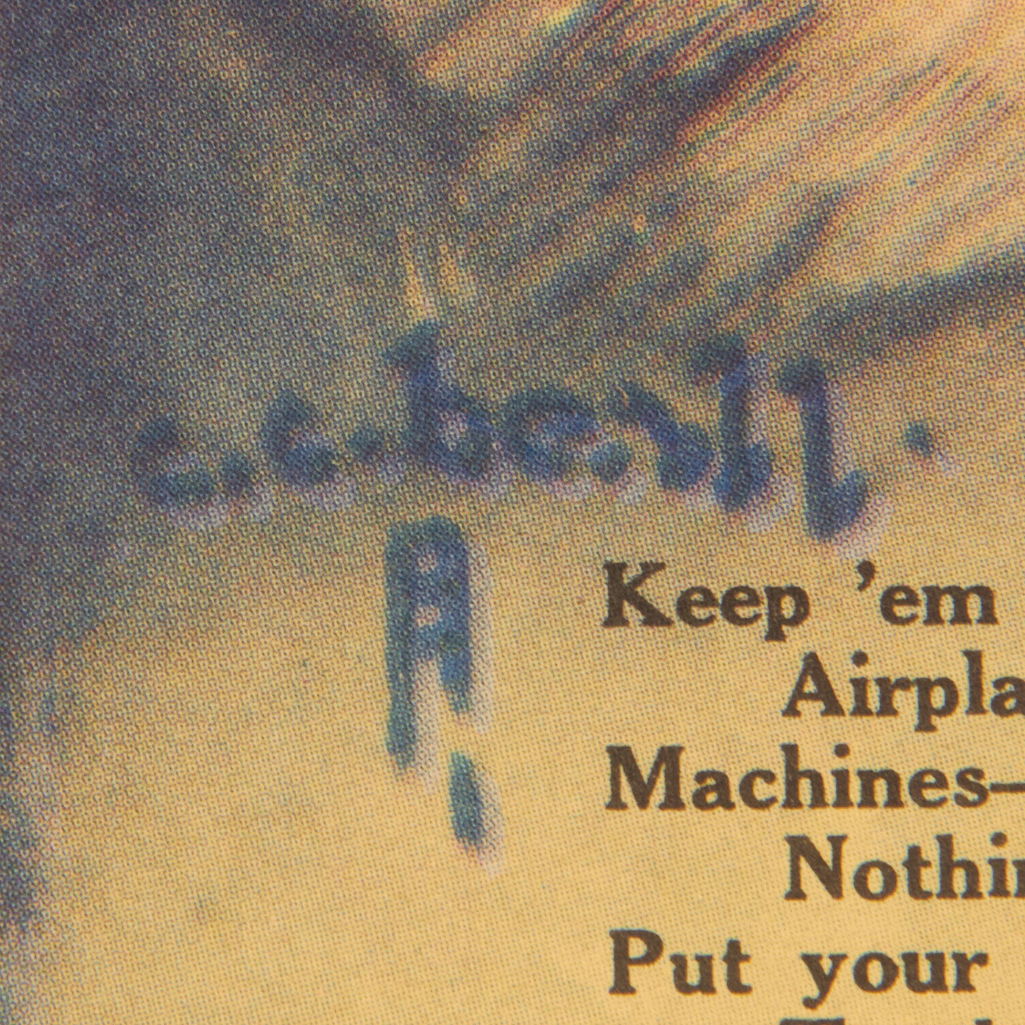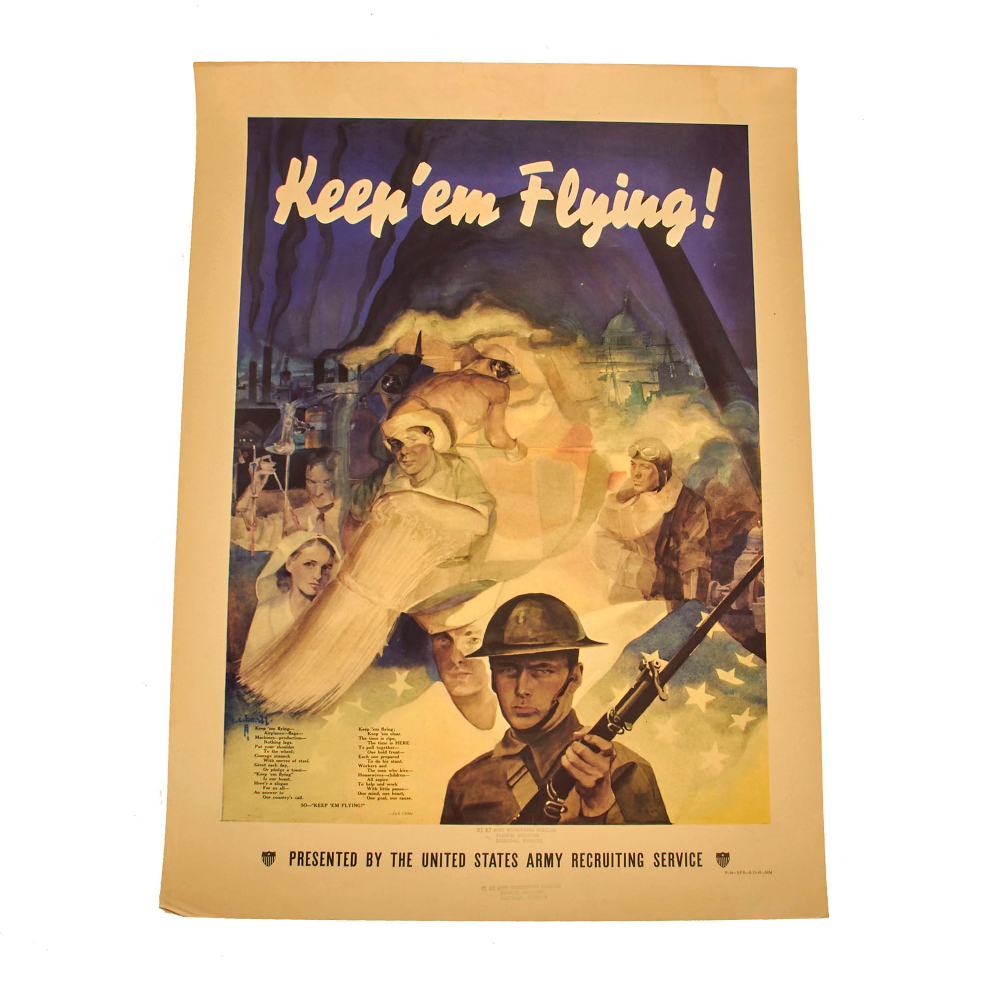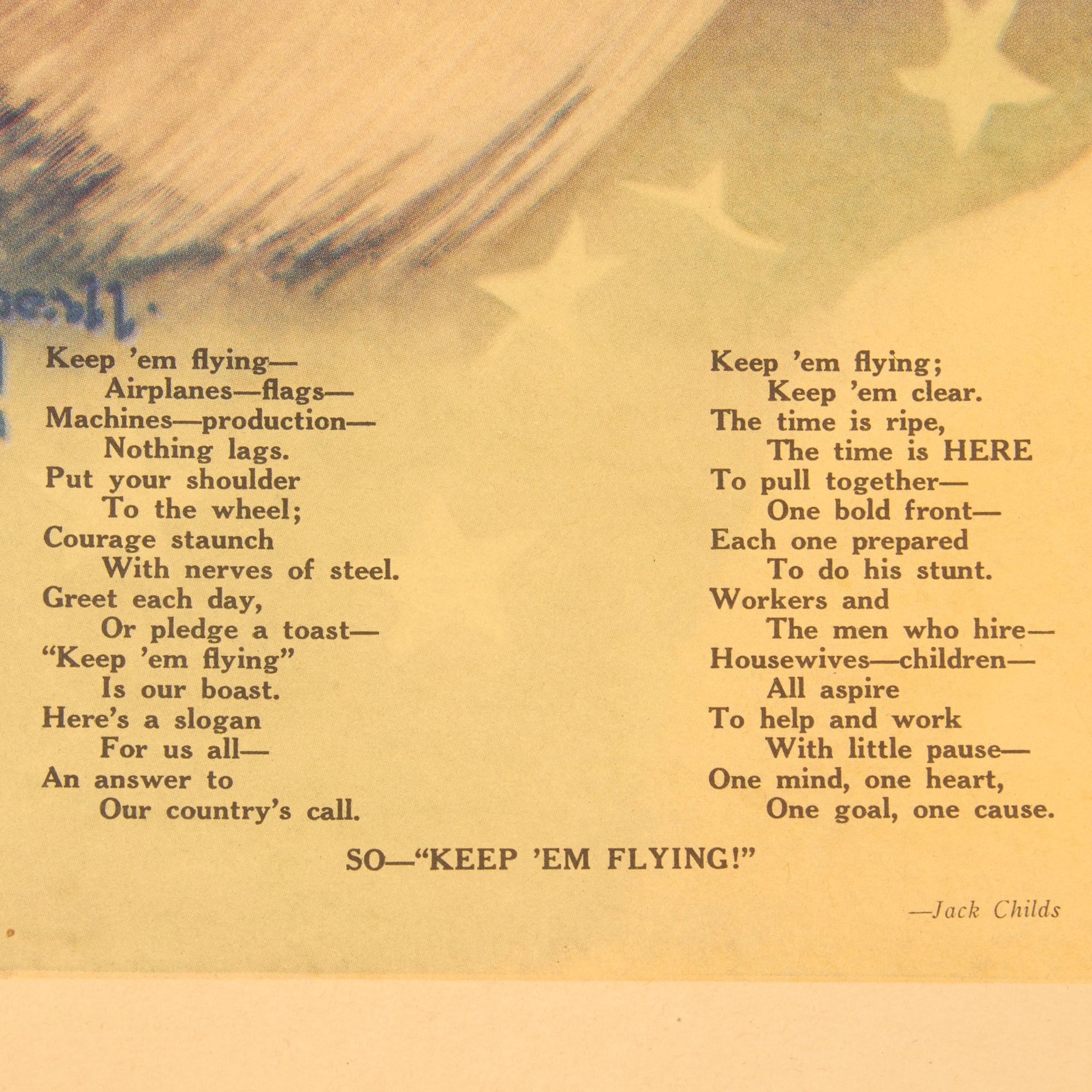 On the left there can be seen a factory worker, a scientist, a nurse, and a farmer holding a sheaf of wheat that morphs into Uncle Sam’s beard; on the right, an airman, a sailor, and a soldier holding a rifle with bayonet. Printed at the lower corner of the image is a patriotic poem by Jack Childs that concludes “So—‘Keep ‘em Flying!’”