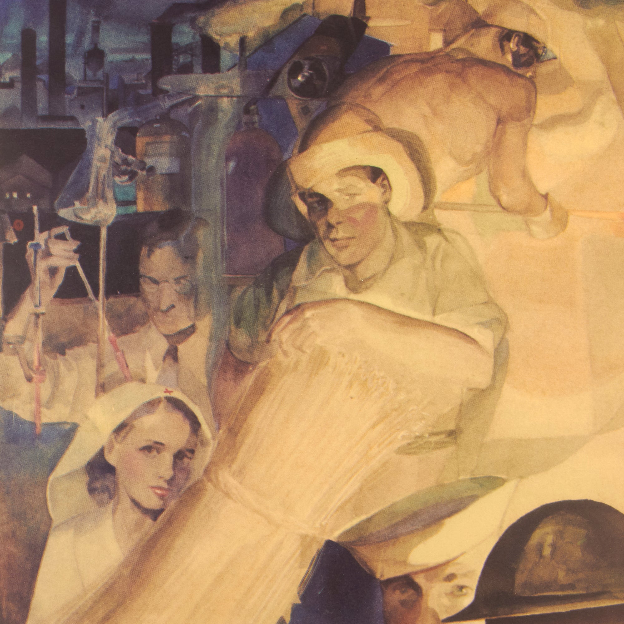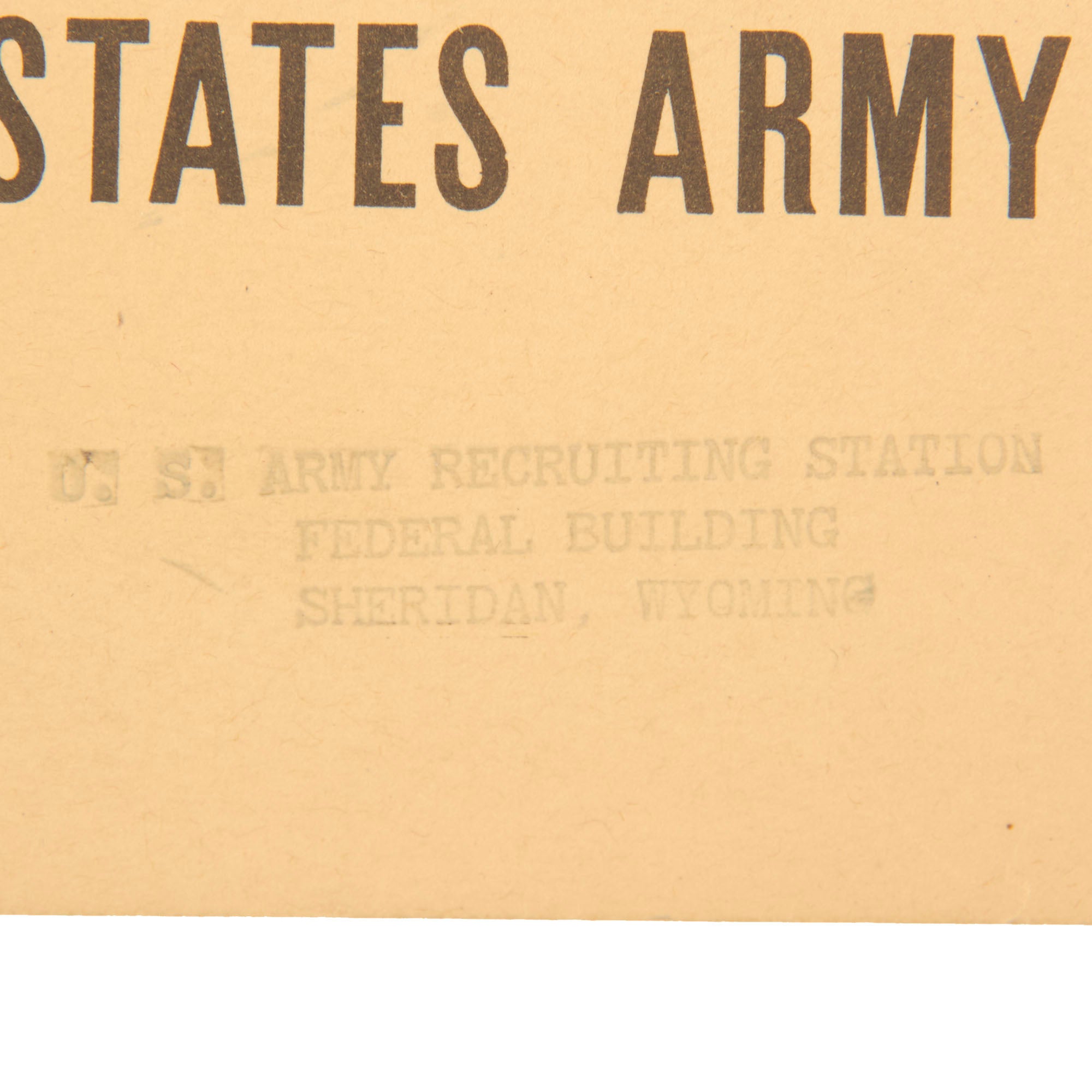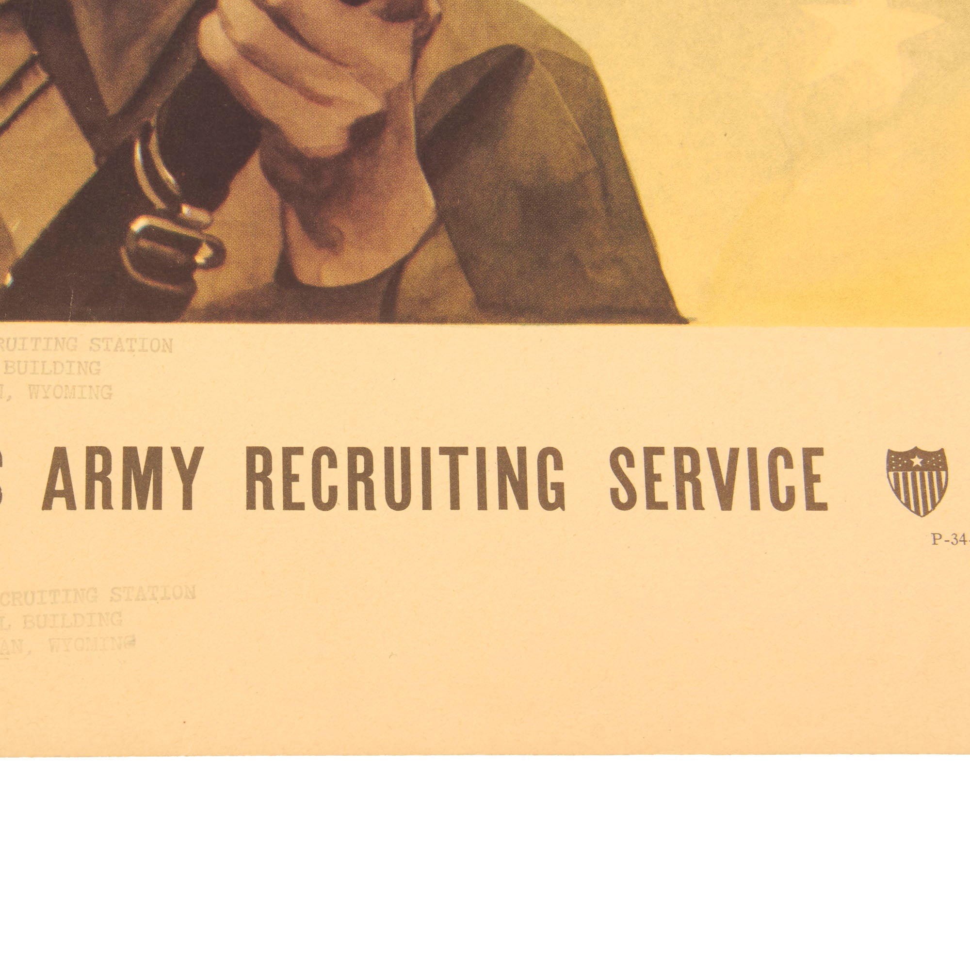 This lovely poster features artwork by American illustrator C.C. Beall, issued by the United States Army Recruiting Service. Beall is known for creating the artwork in one of the most infamous posters used during WWII, the 7th War Loan “Now All Together” of the Iwo Jima flag raising. Beall did work for many of the leading periodicals of the twentieth century. His watercolor style was in a type of bold contrasting reflections, which was popular at the time. Some Meredith magazines that he produced paintings and colored drawings for included Collier's, Vanity Fair, Cosmopolitan, Woman's Home Companion, Saturday Evening Post, American Family Circle, and This Week. He also painted covers for Elks Magazine and Reader's Digest books.