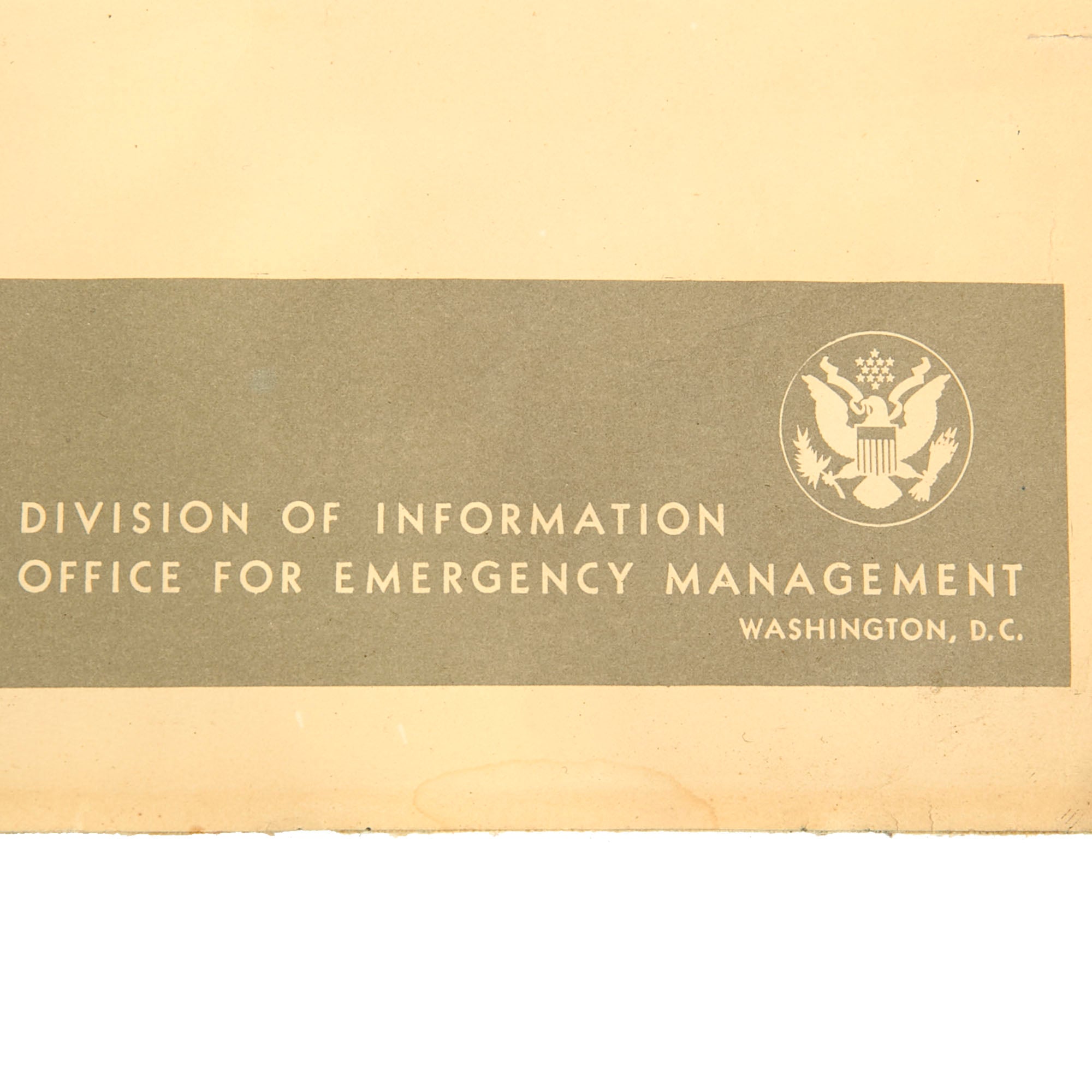 This lovely poster was designed by Leo Lionni in 1941, for the Division of Information, Office of Emergency Management. Offered in good condition, all colors are vibrant and easily discernible. It has some toning and edge wear & staining but the poster is linen-backed, meaning it is well-preserved. It measures roughly 29½ x 40”.