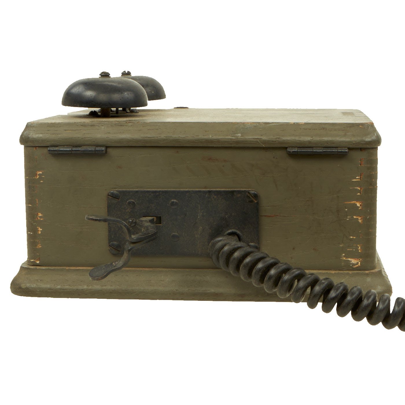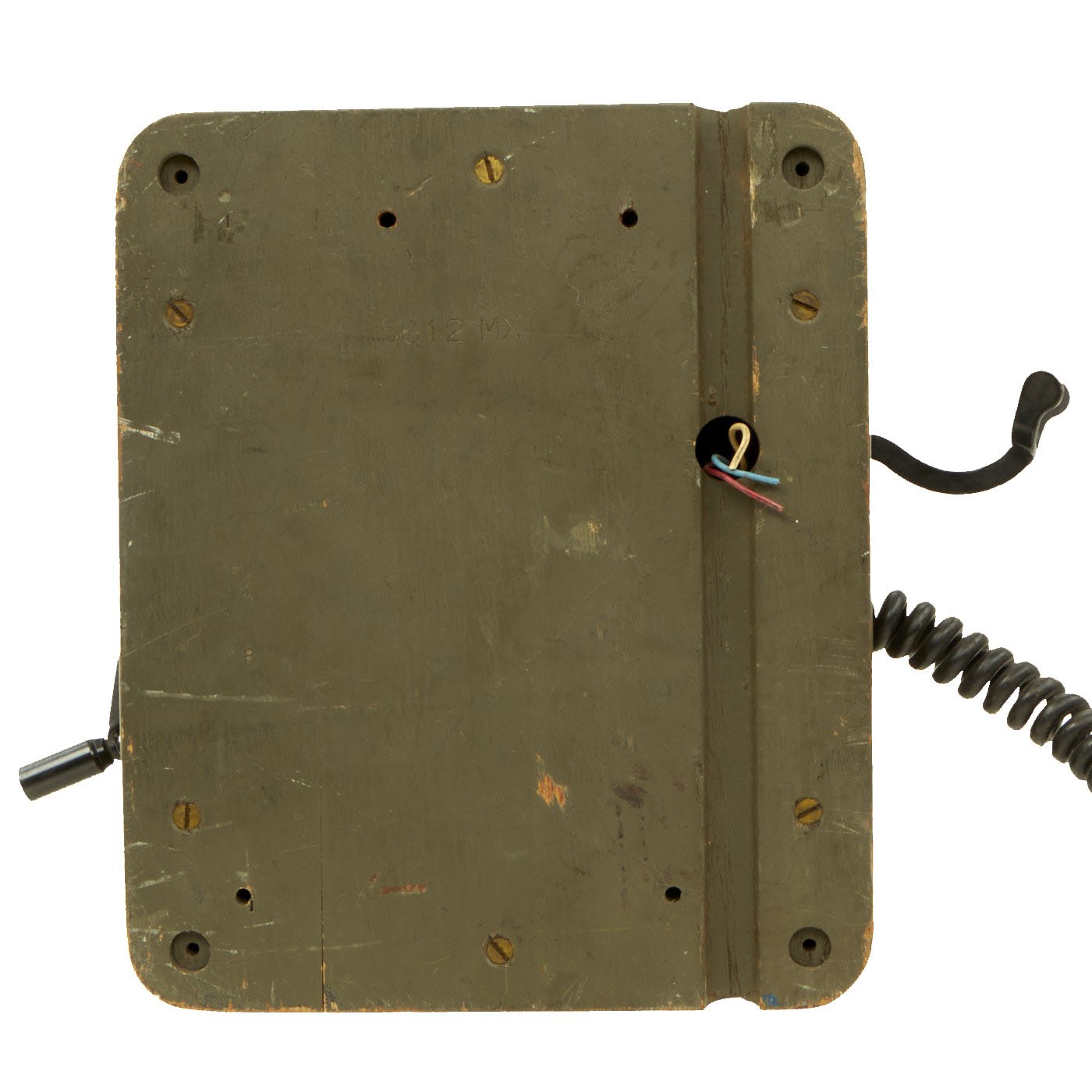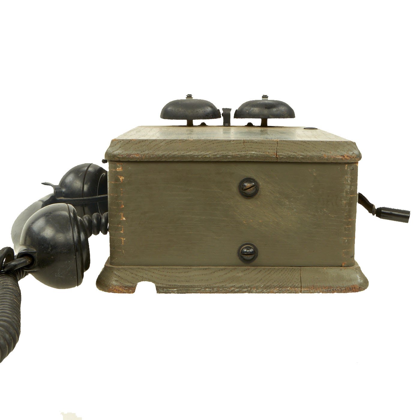 Original Item: Only One Available. World War Two or earlier US Army Signal Corps Kellogg Switchboard Supply Company 5812-MX Wall Phone Box. Grey, wood box. Complete with headset, hook for headset, crank on side, Heavy-duty Bakelite handset, Dual ringer bells, Metal crank and cradle, Cabinet opens to reveal internal works, Built by the Kellogg Switchboard & Supply Co. of Chicago, Cabinet measures 9.5 x 7.5 x 4.5", 17 lbs.