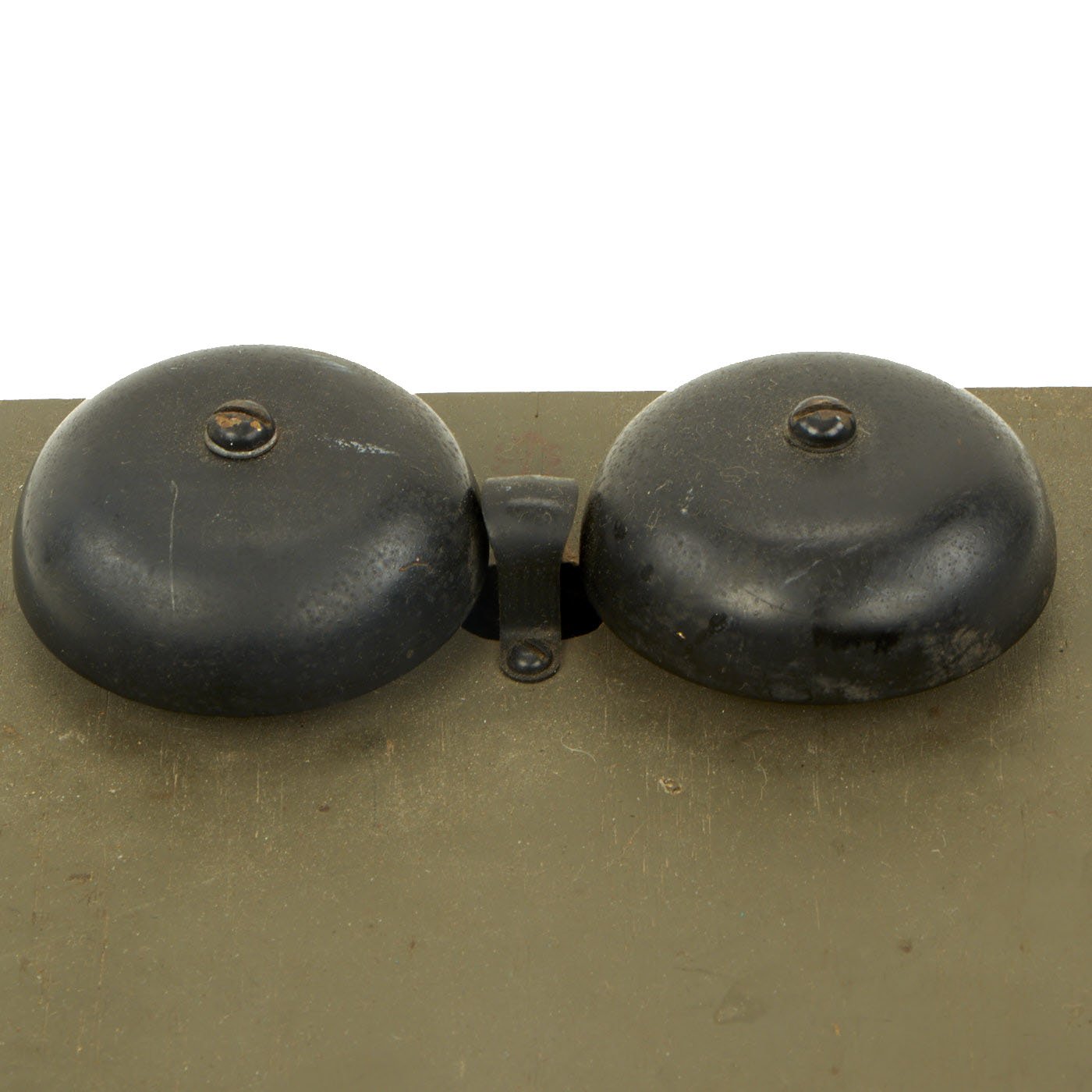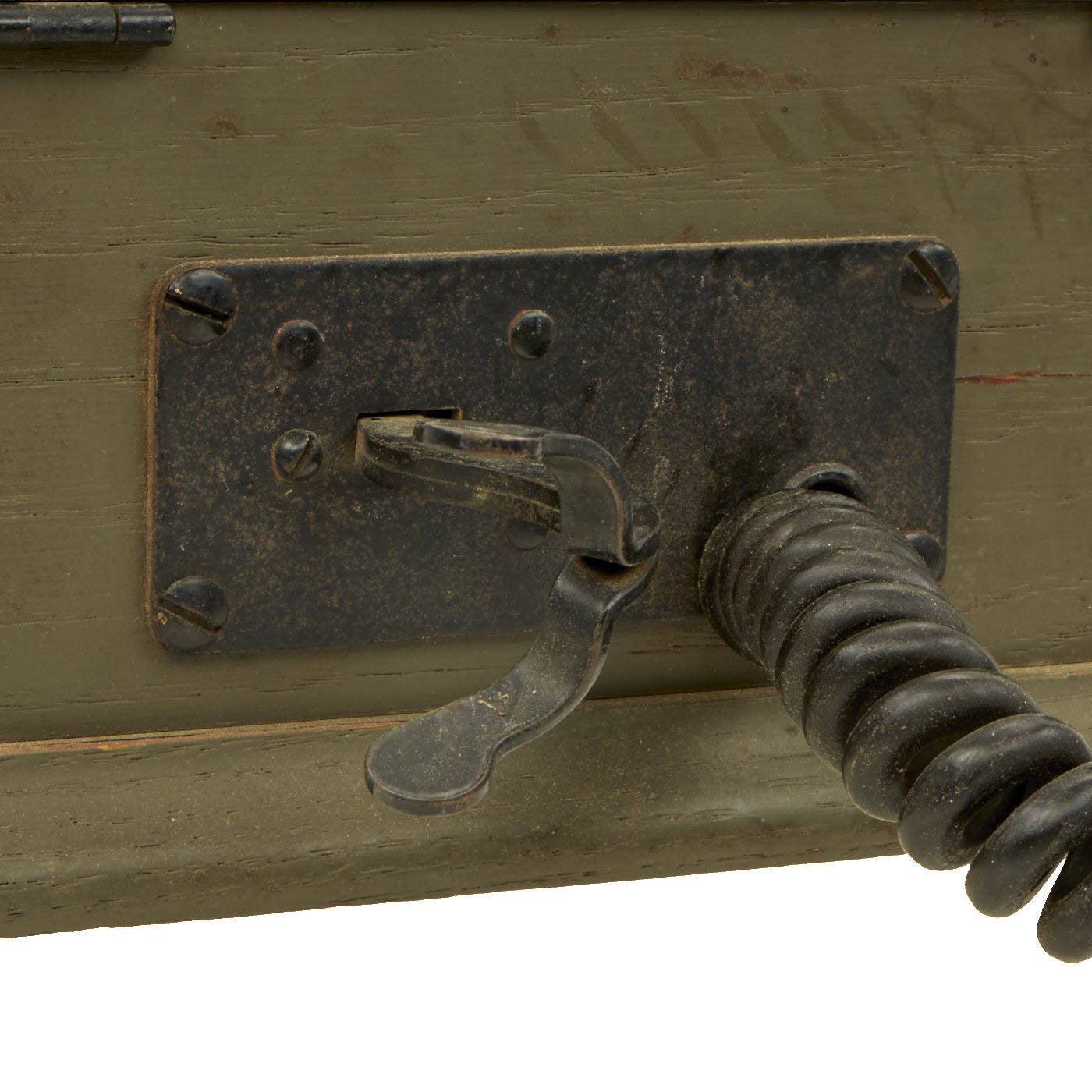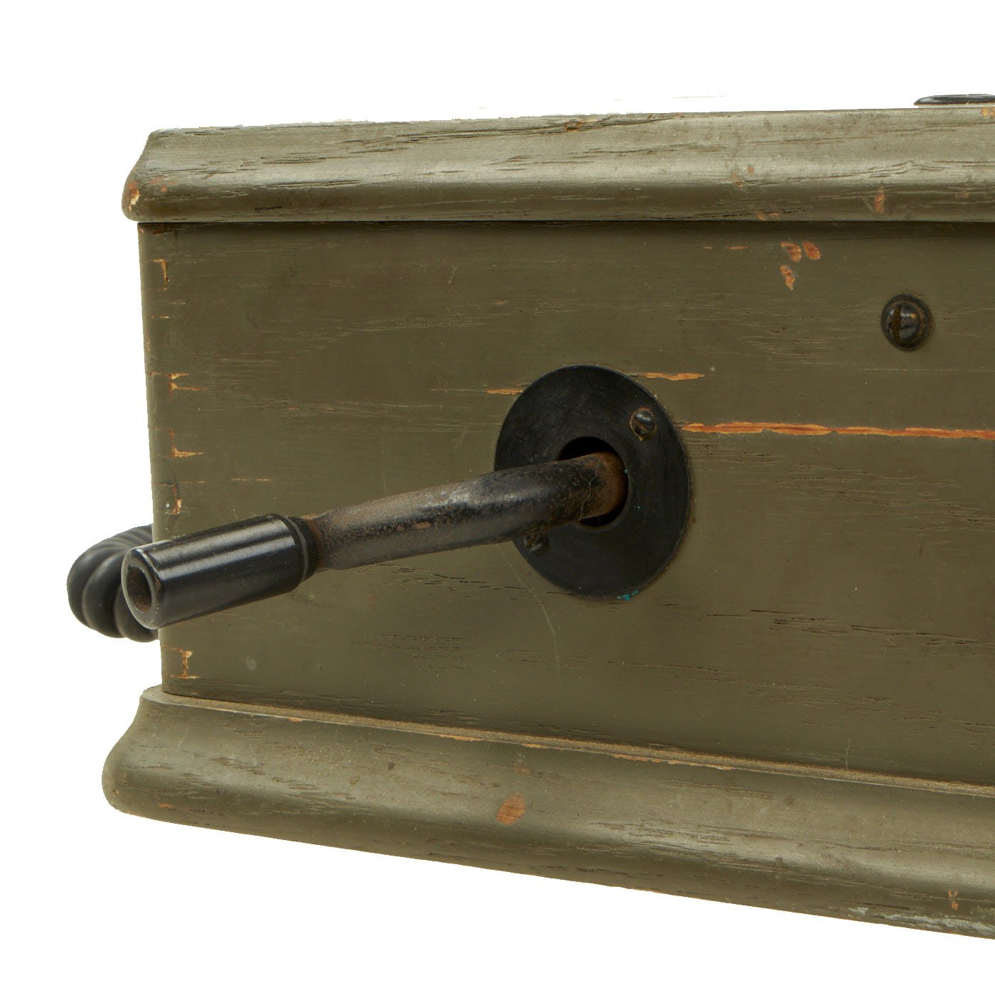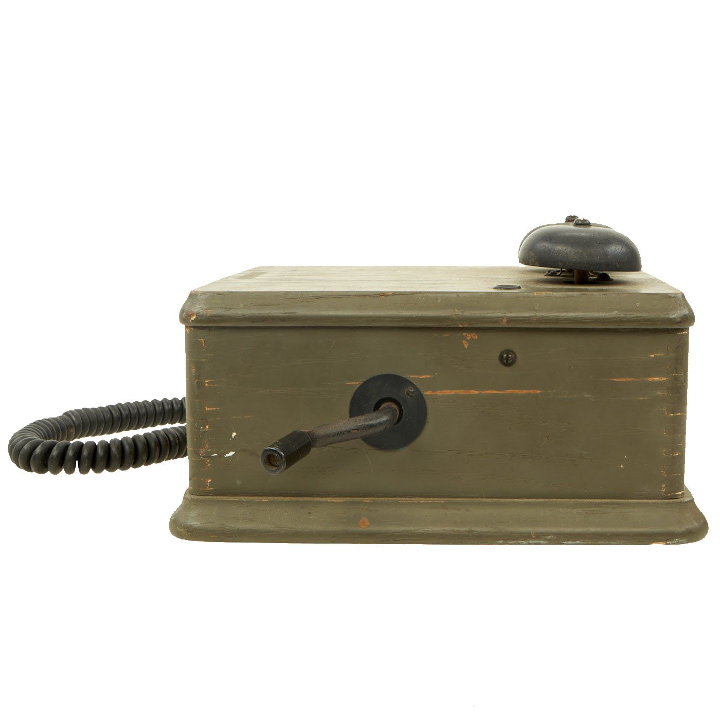 Original Item: Only One Available. World War Two or earlier US Army Signal Corps Kellogg Switchboard Supply Company 5812-MX Wall Phone Box. Grey, wood box. Complete with headset, hook for headset, crank on side, Heavy-duty Bakelite handset, Dual ringer bells, Metal crank and cradle, Cabinet opens to reveal internal works, Built by the Kellogg Switchboard & Supply Co. of Chicago, Cabinet measures 9.5 x 7.5 x 4.5", 17 lbs.
