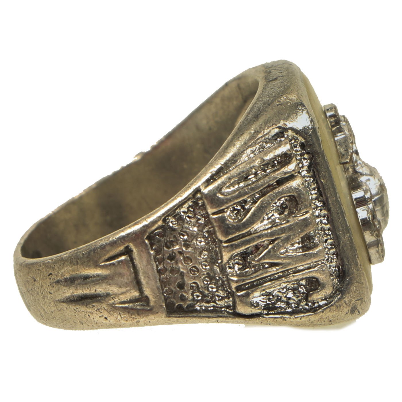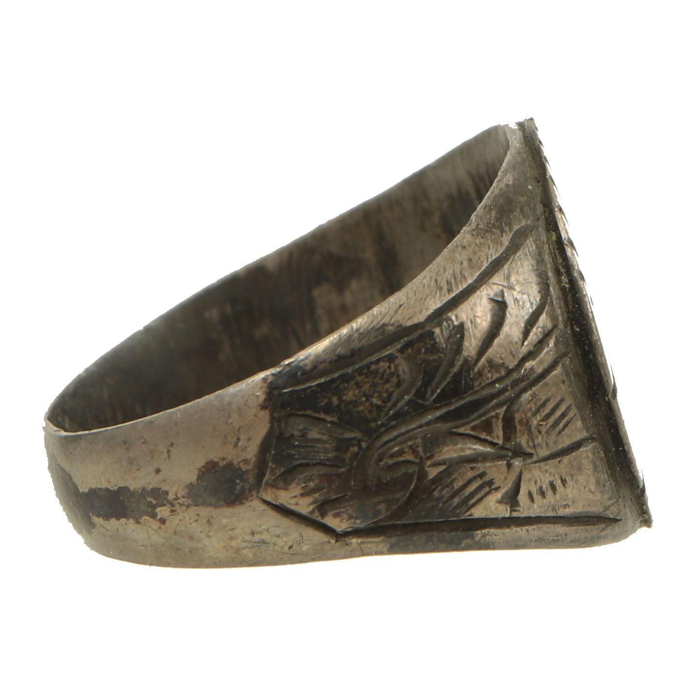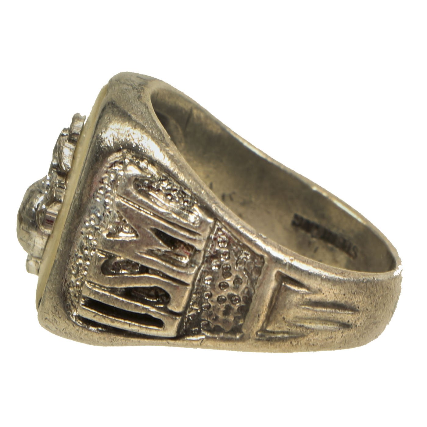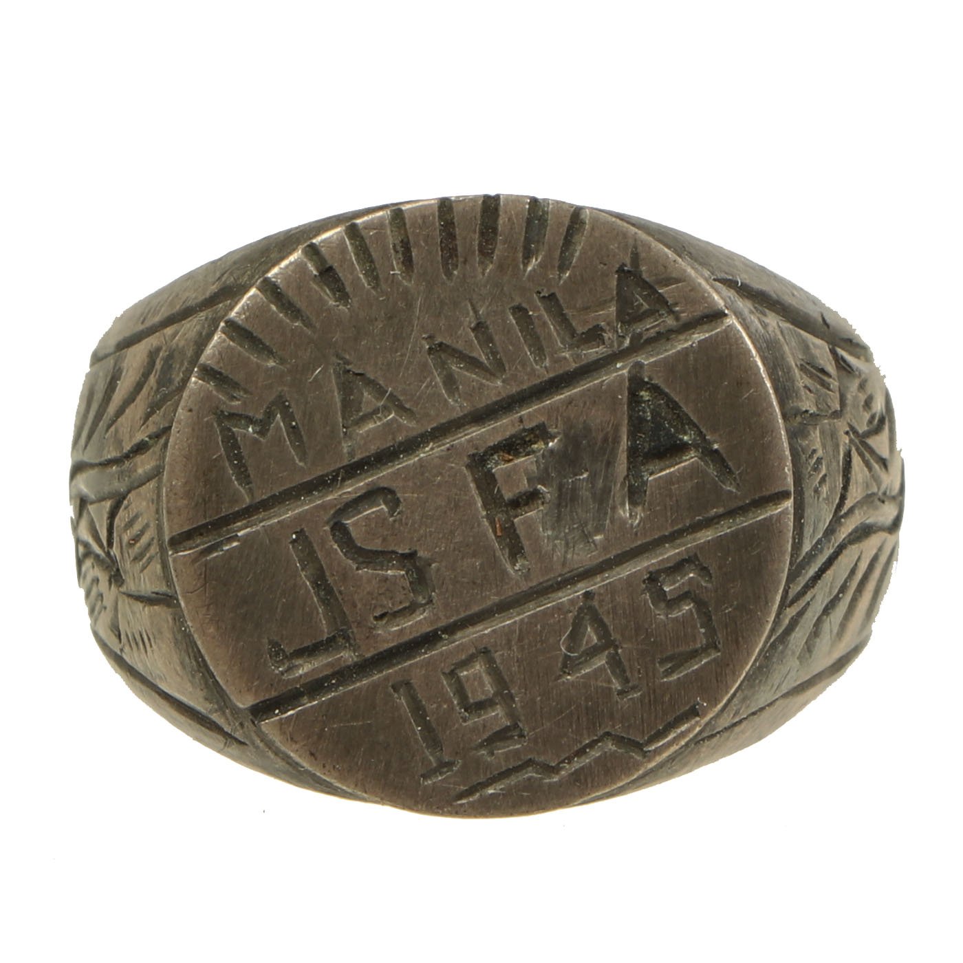 - Plated Alloy ring with floral engraving and MANILA / JS FA / 1945 engraved across the center. Approximately 20mm in diameter