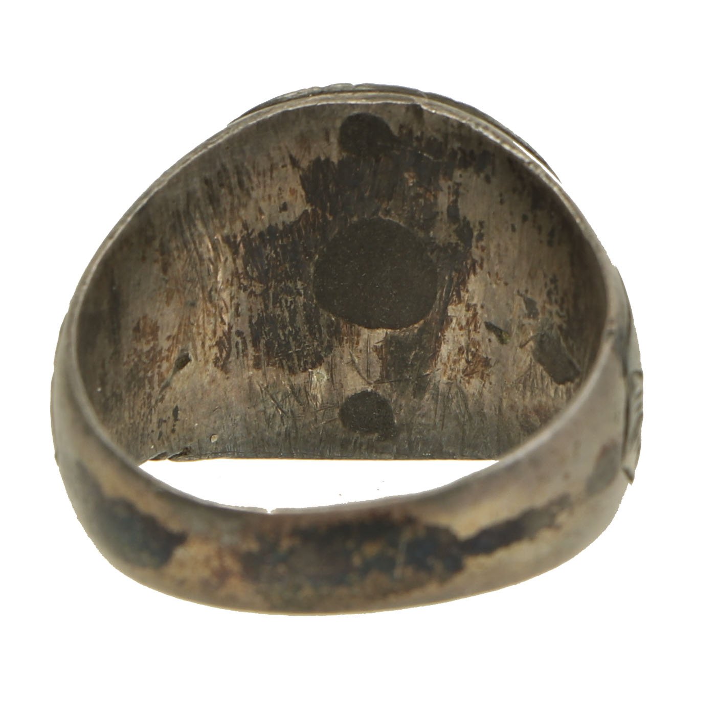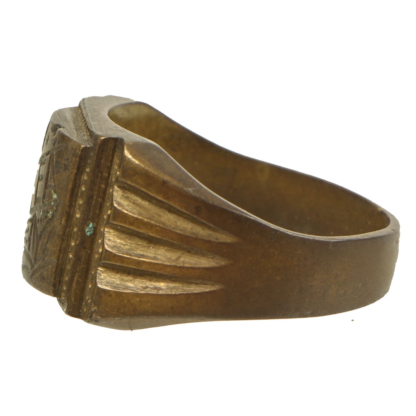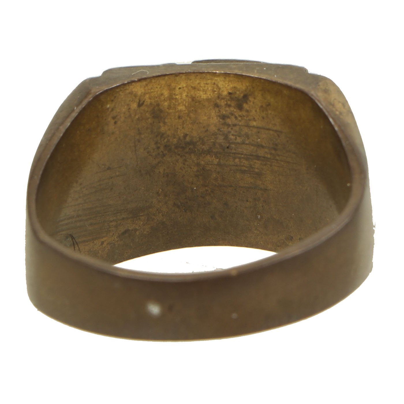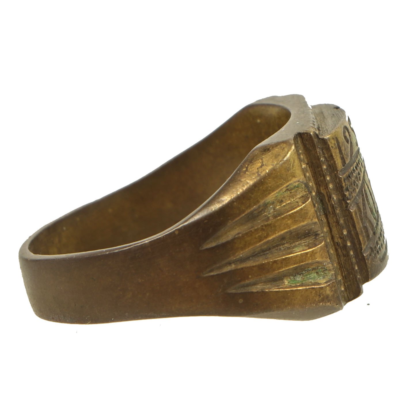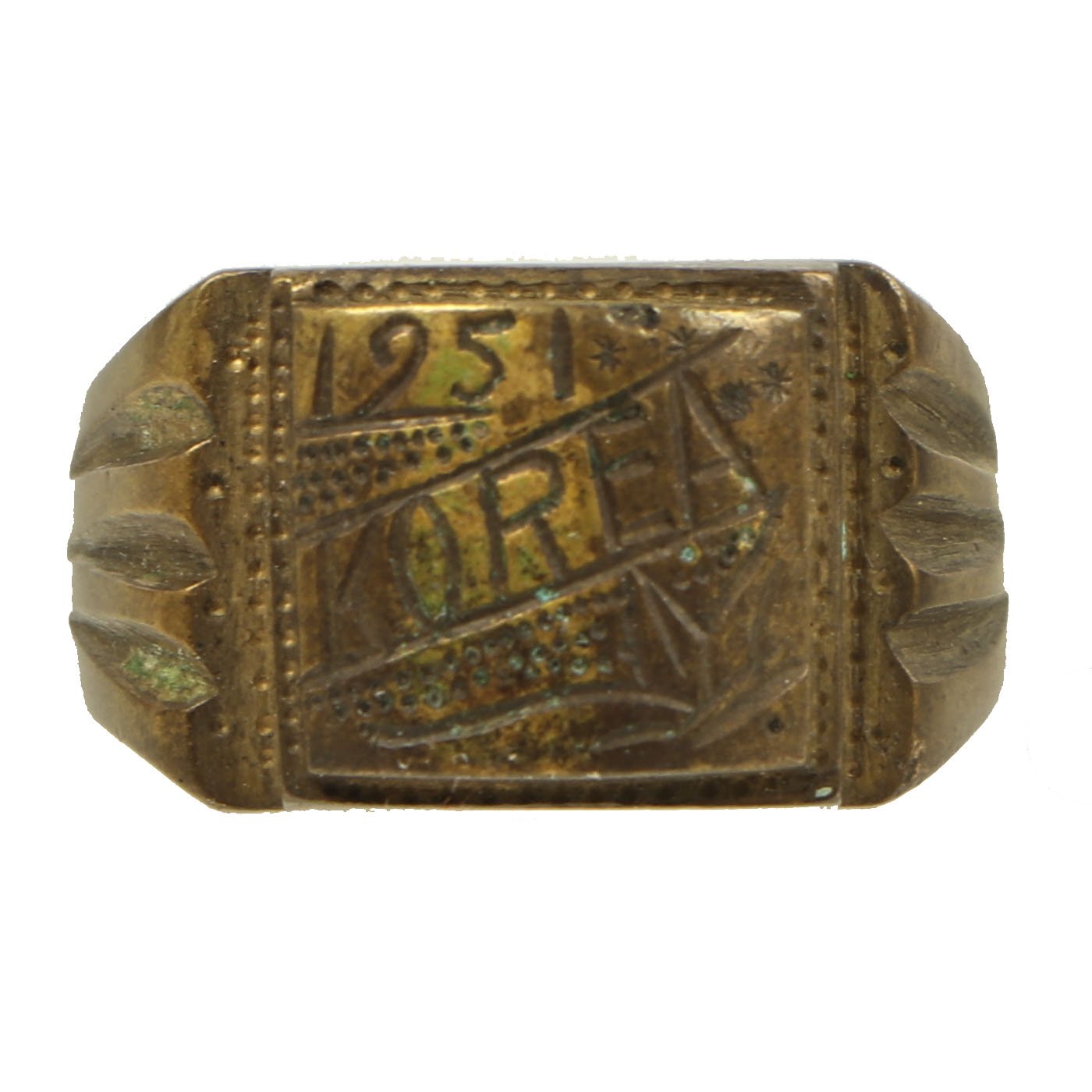 - Brass ring with a decoratively engraved center panel reading 1951 / KOREA. Approximately 21mm in diameter