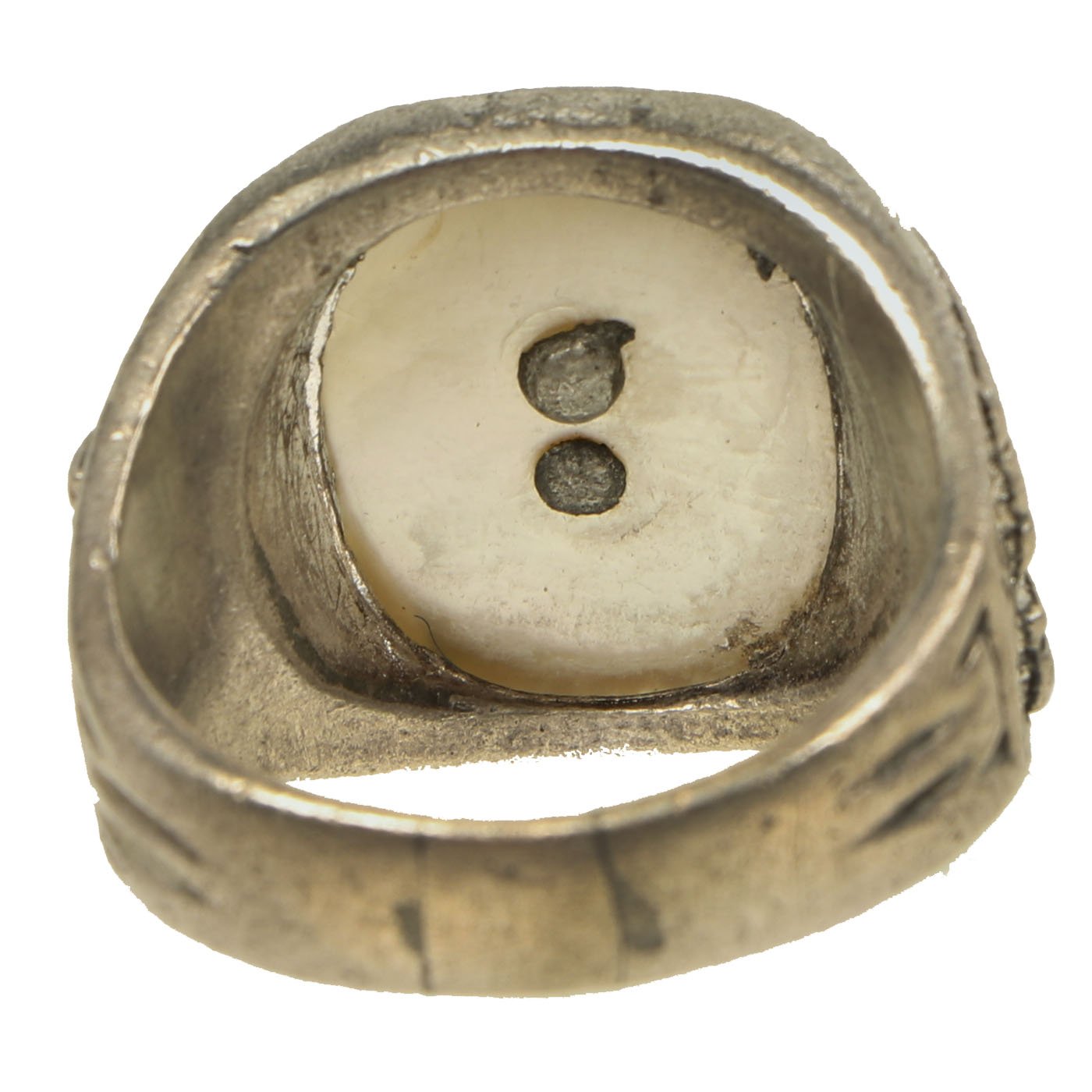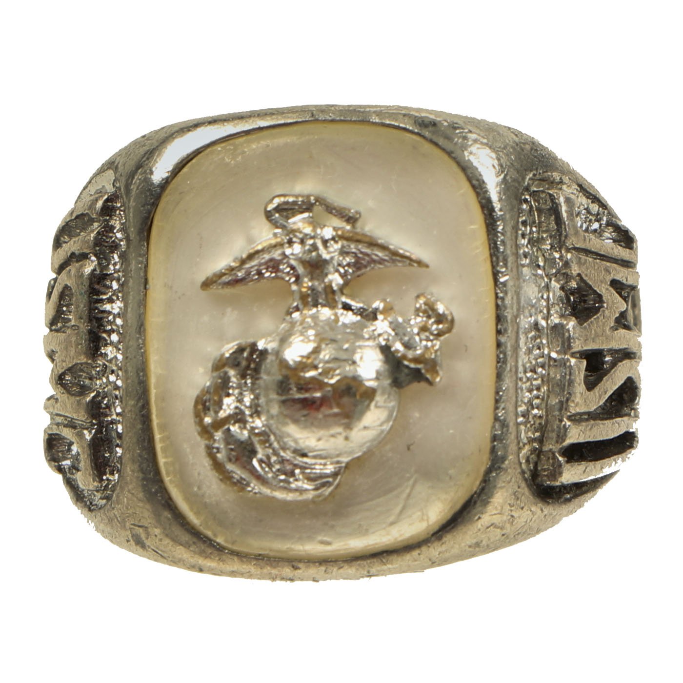 - White Metal USMC marked ring with a mother of pearl inlay bearing an EGA to center. Approximately 21mm in diameter.