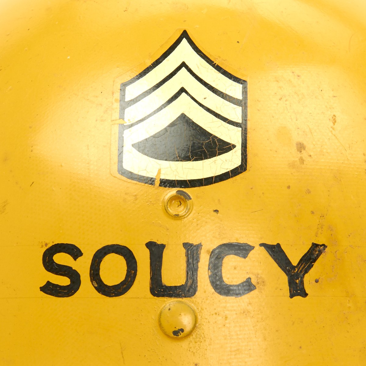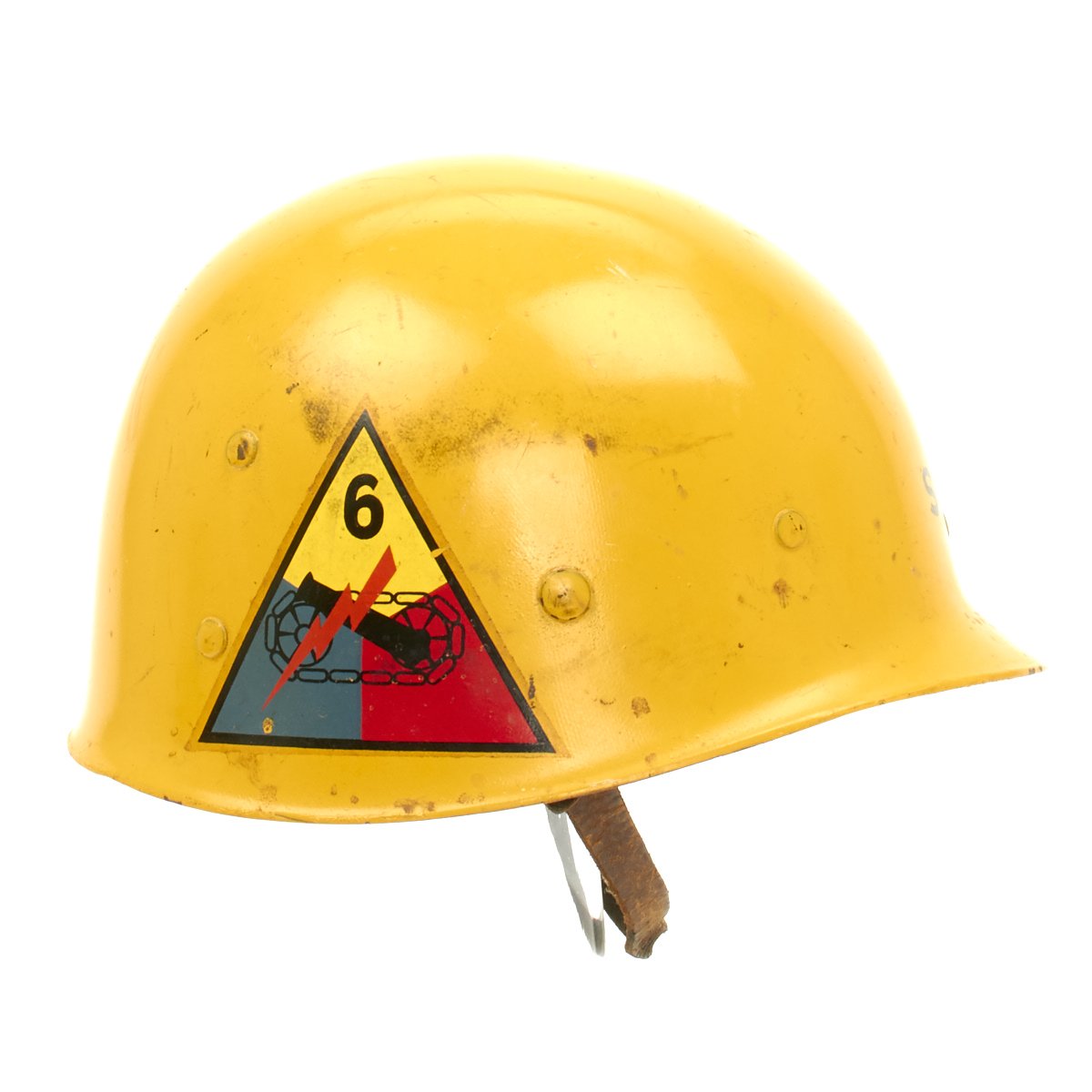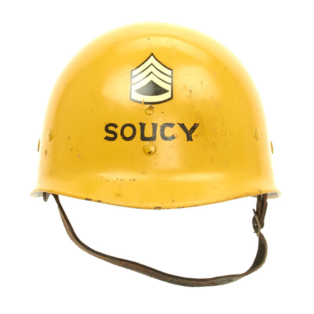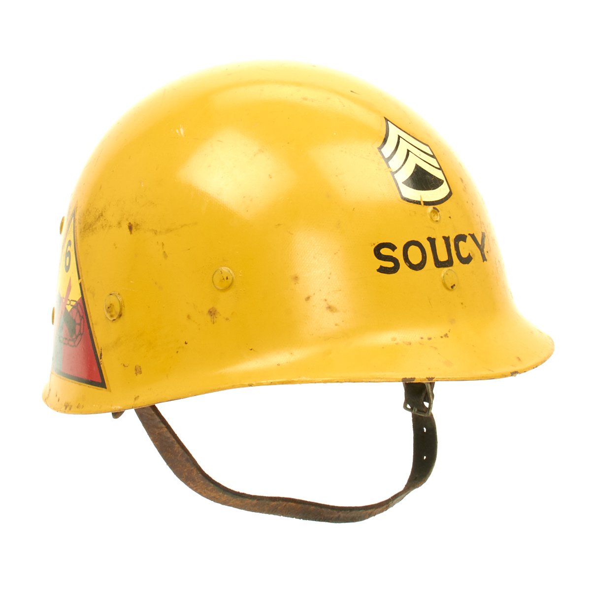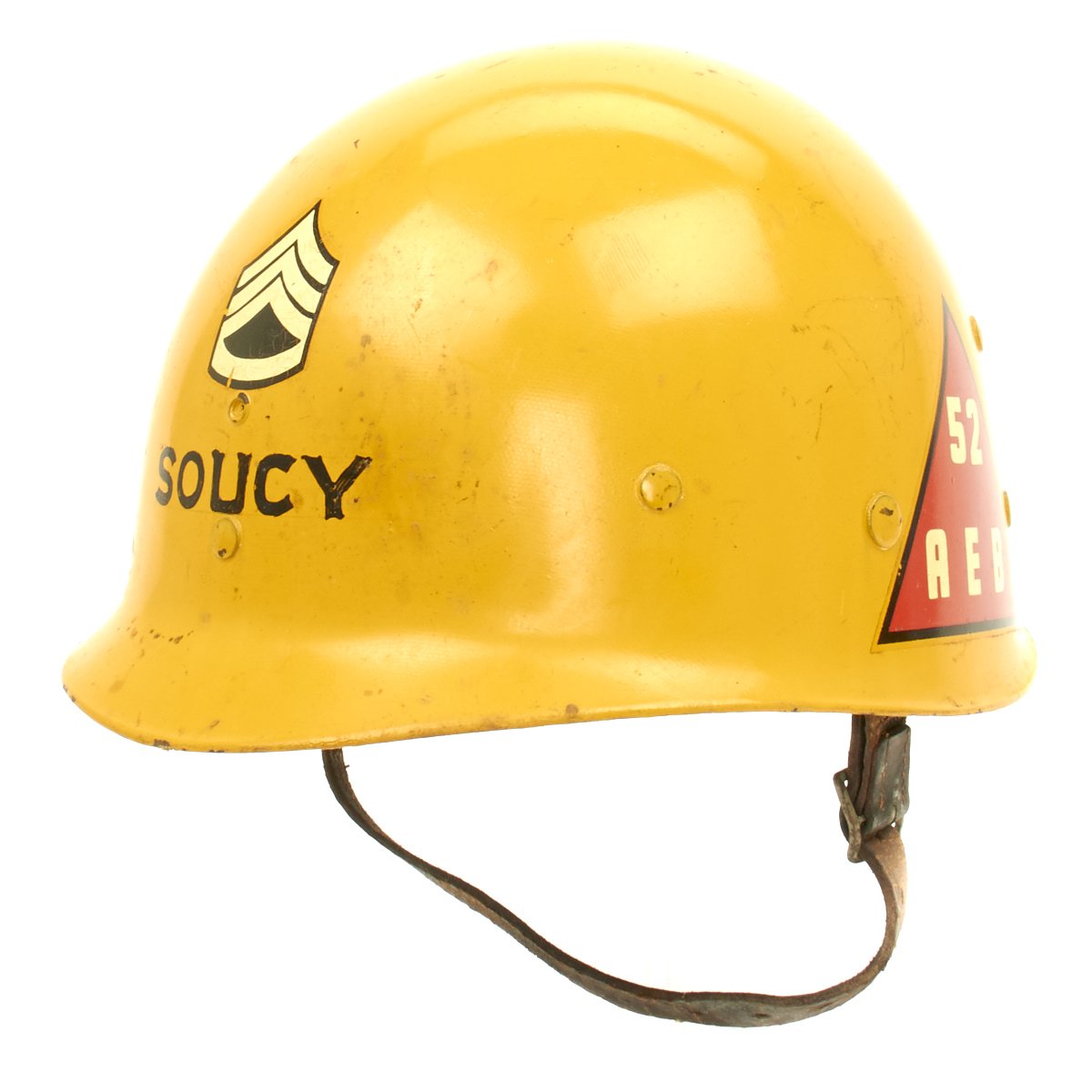 The outside of the liner is painted orange/yellow and features the name SOUCY below Staff Sergeant (E-6) chevrons. According to the vet's son he was a drill sergeant during the Korean War. The helmet liner also features the 6th Armored Division insignia on one side and on the other the 52nd Armored Engineer Battalion.