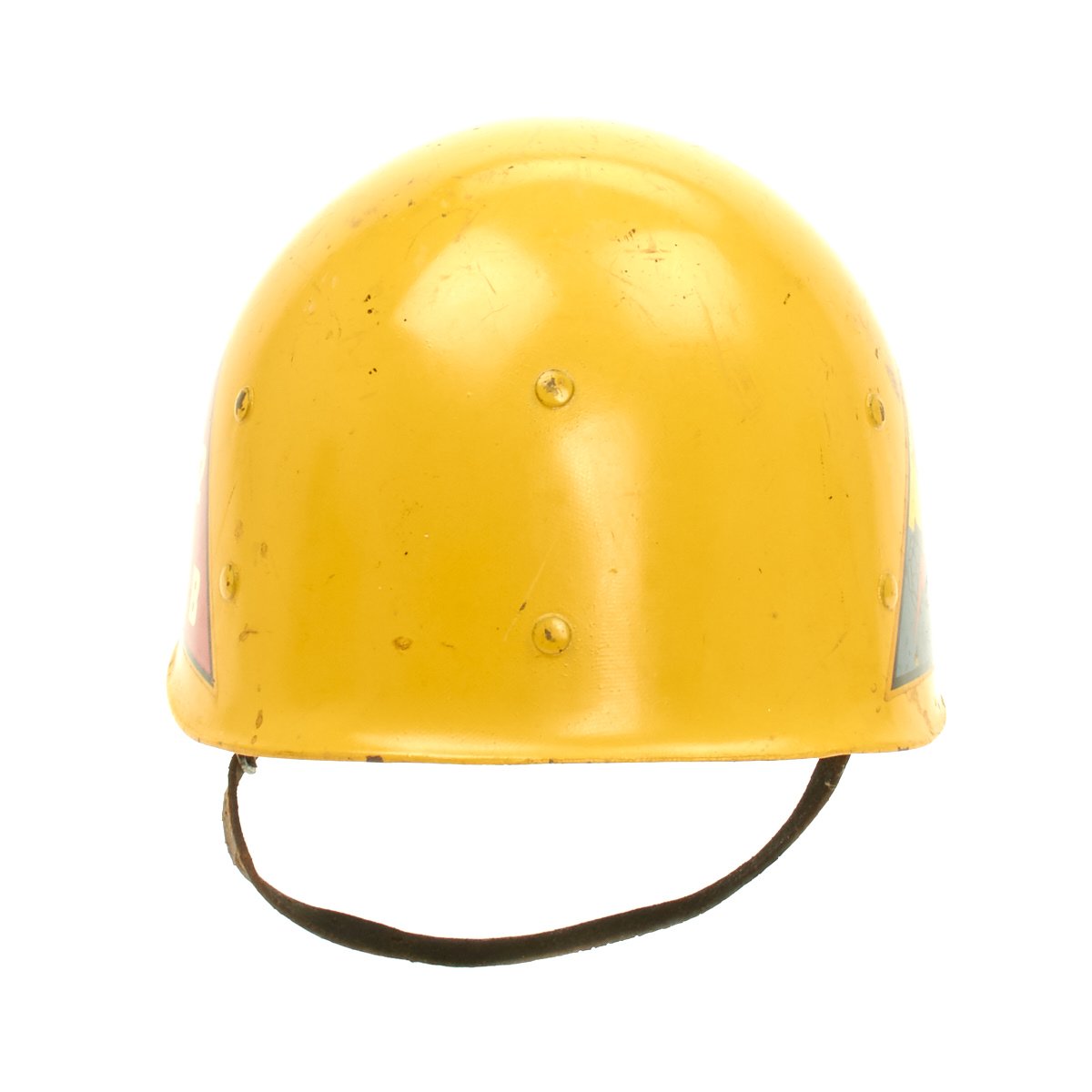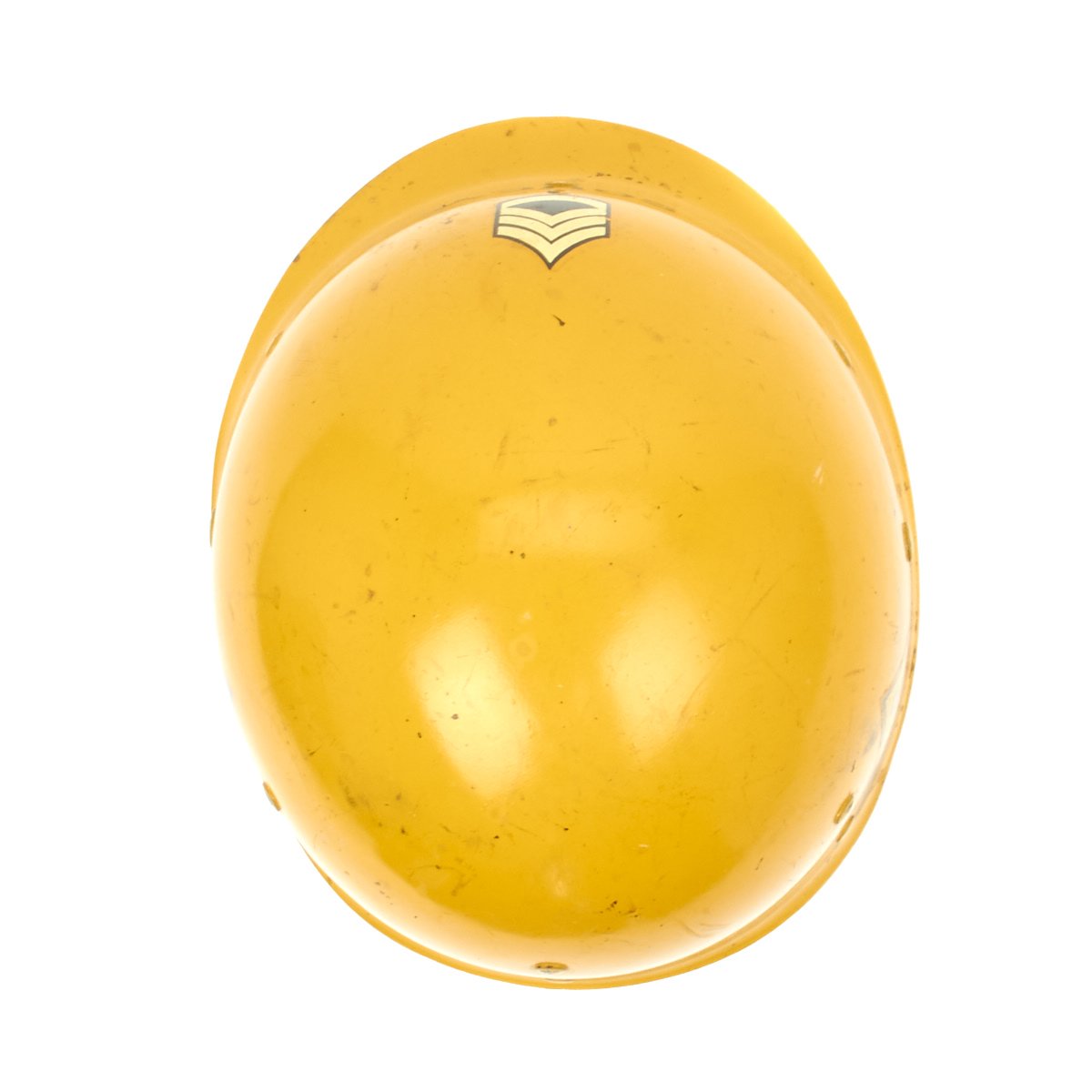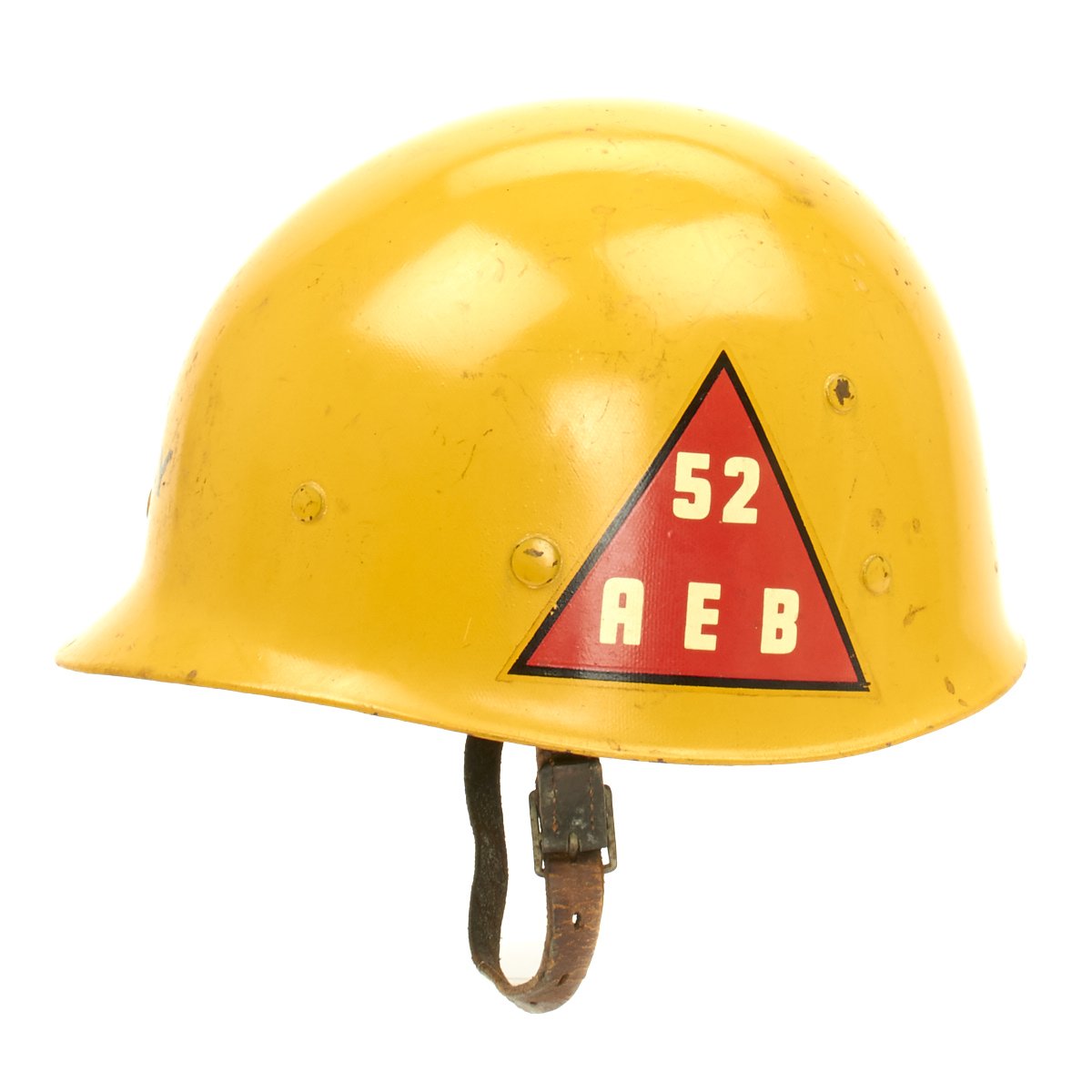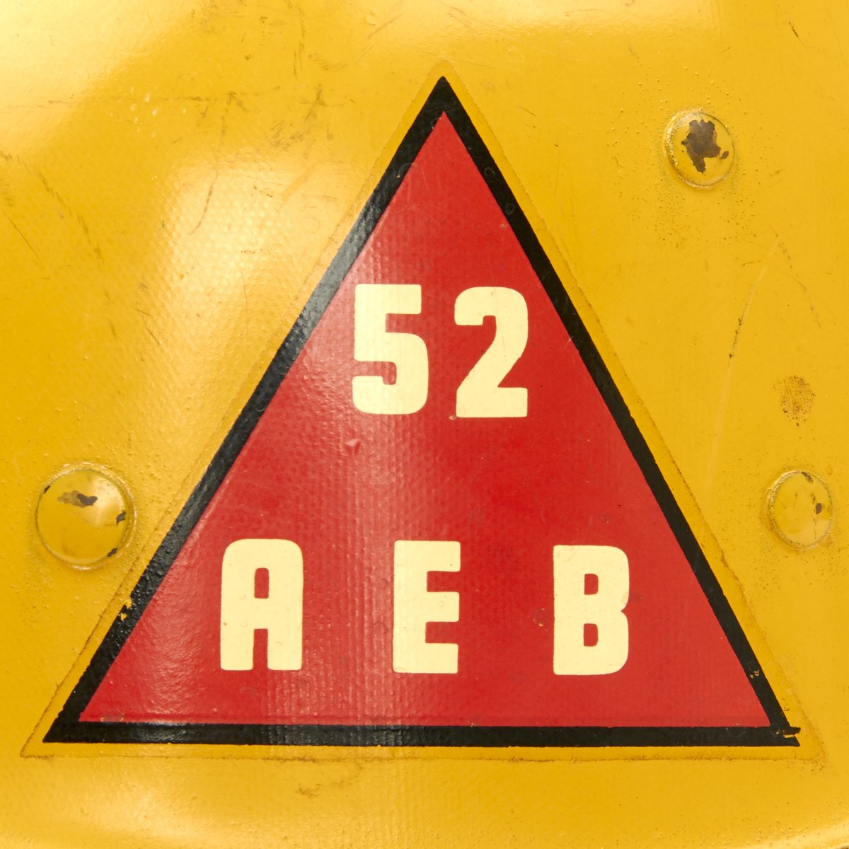 The outside of the liner is painted orange/yellow and features the name SOUCY below Staff Sergeant (E-6) chevrons. According to the vet's son he was a drill sergeant during the Korean War. The helmet liner also features the 6th Armored Division insignia on one side and on the other the 52nd Armored Engineer Battalion.