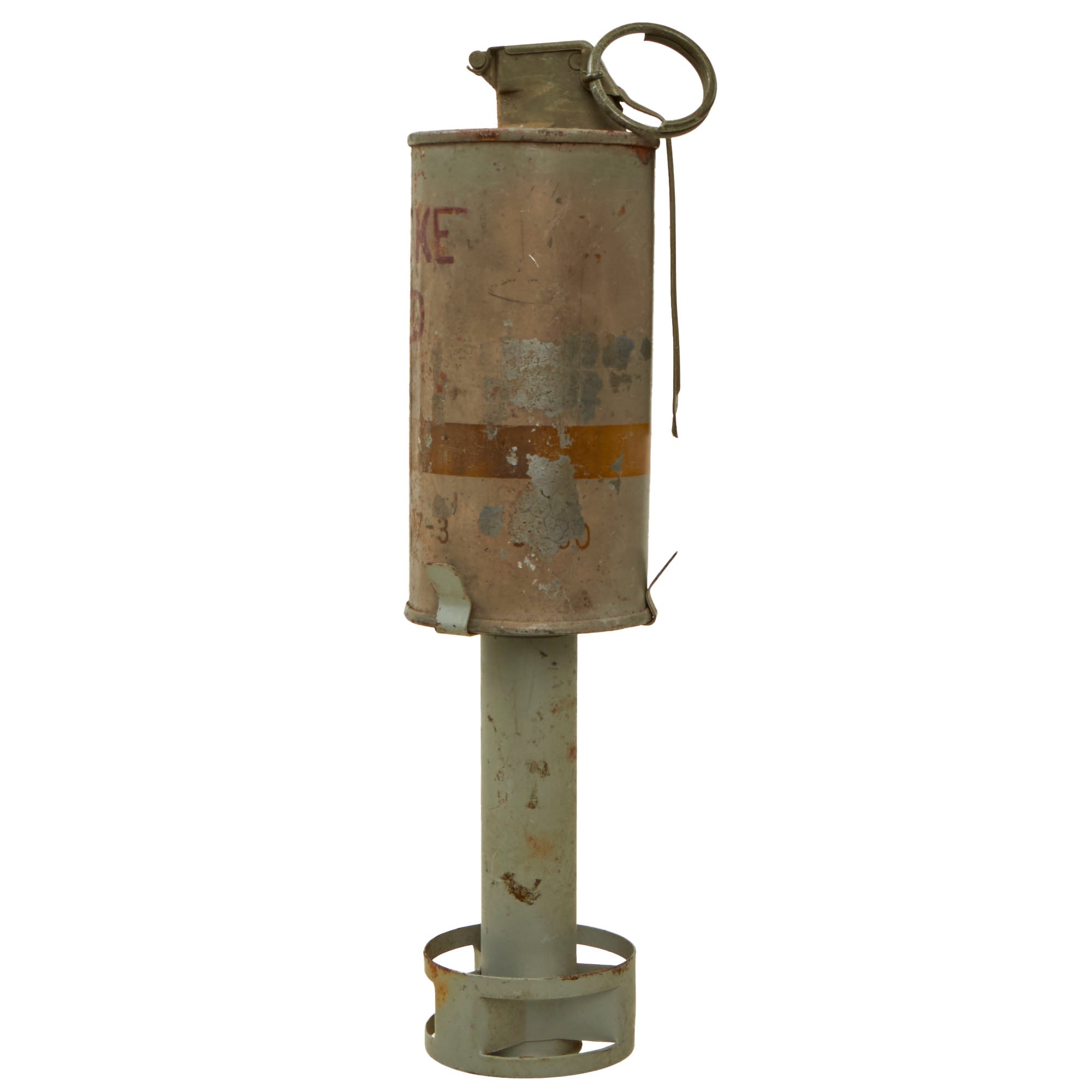 Original Item: Only One Available. This is a lovely, unused example of an M18 smoke grenade for the color red. Although it is unused, all contents were removed and the fuse was rendered inert. This example comes mounted to a grenade launcher adapter. All markings are visible and the original paint is retained nicely, making this a wonderful offering!