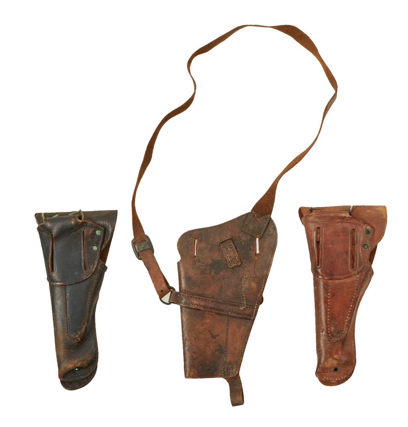 Original Items: Only One Set Available. This is a set of three Word War Two & Korean War era leather holsters for the .45 cal 1911 Pistol. Each is U.S. marked indicating military issue. Included in the set is an M3 shoulder holster and two 1916 hip holsters, one of which is black and has had MRT treatment, so it is definitely Korean war era. The other two look to be WWII Production. Maker markings and dates are very faint or not visible on all holster. All leather is supple a nice matured dark brown, the color they take after years of age and service. No major damage to the leather, all stitches still intact, all brass parts still present. Just perfect for a high grade WWII issue 1911 .45 pistol.