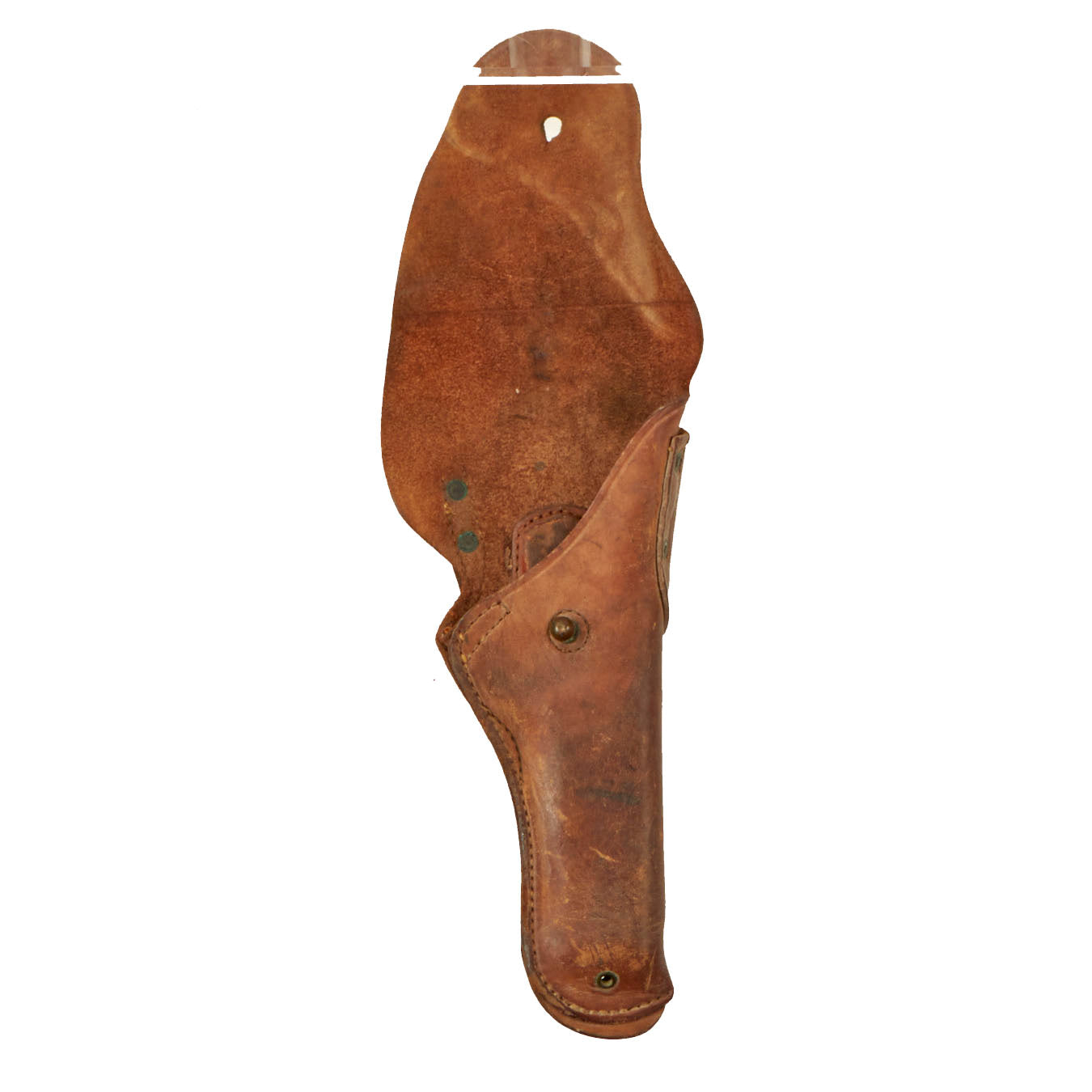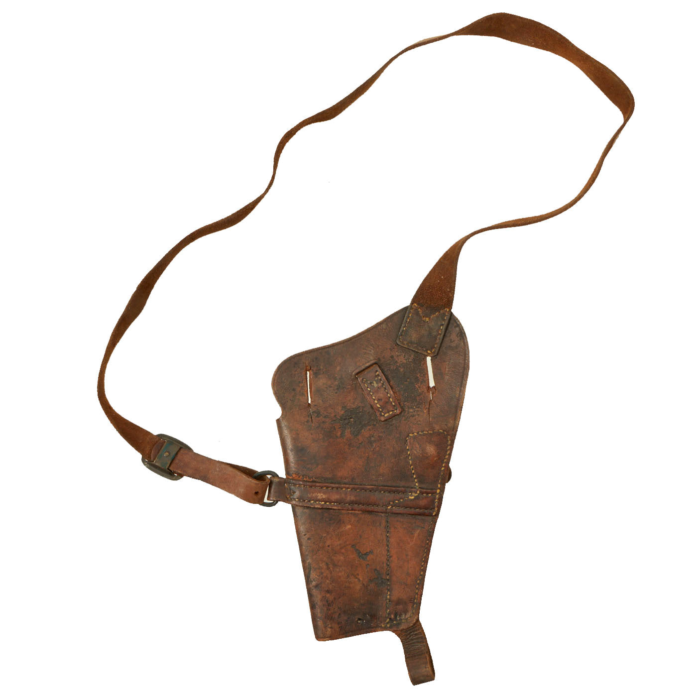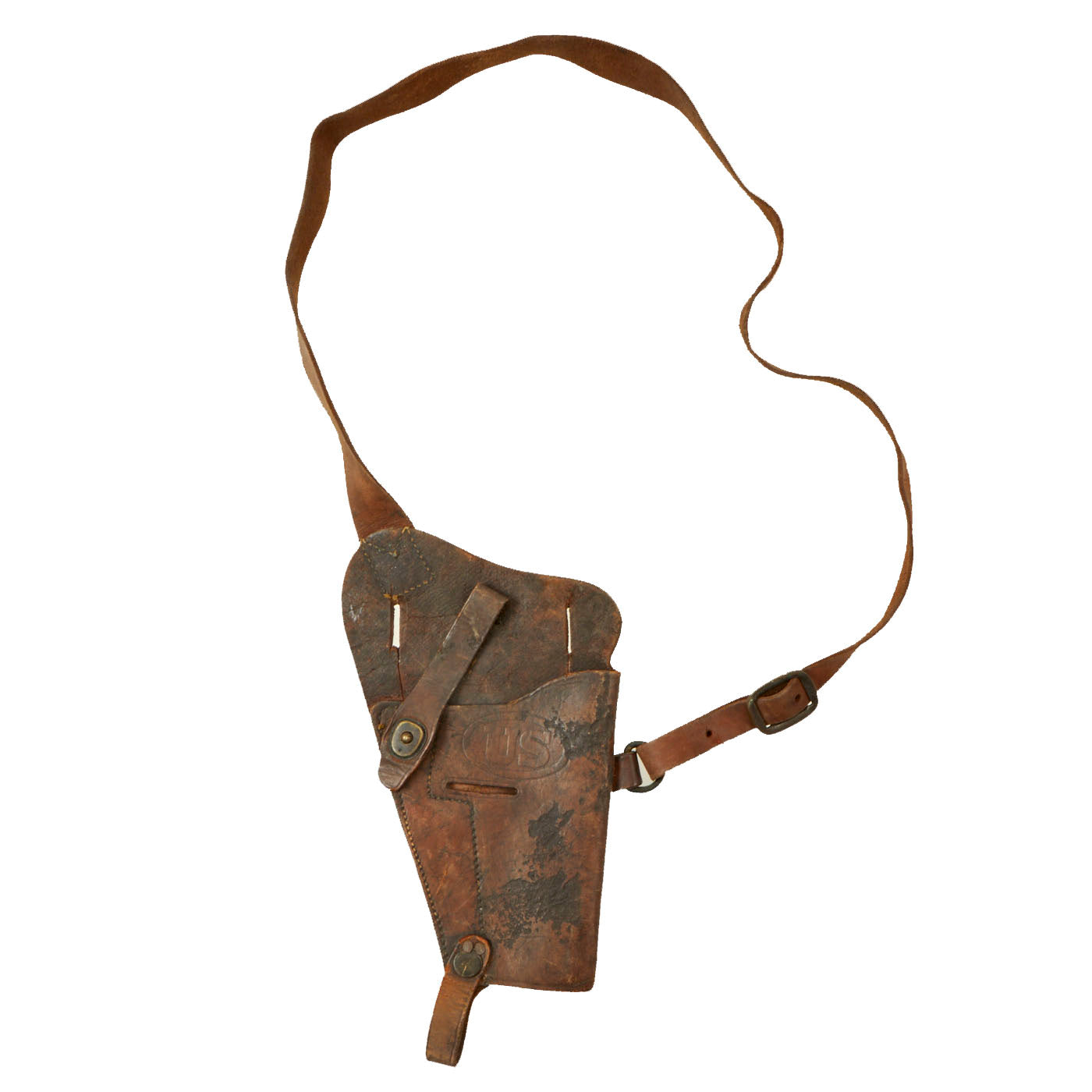 A leather shoulder holster for the .45 pistol, designated as the “M3,” was adopted in 1942 for use by aviators, tankers and others who preferred carrying the pistol over the hip holster. An improved shoulder holster design was standardized in 1944 as the M7. The pistol was secured in the shoulder holster by means of leather strap with a snap fastener. The shoulder holsters were also embossed with a large “U.S” on the front, with the identity of the manufacturer and year of production on the back.