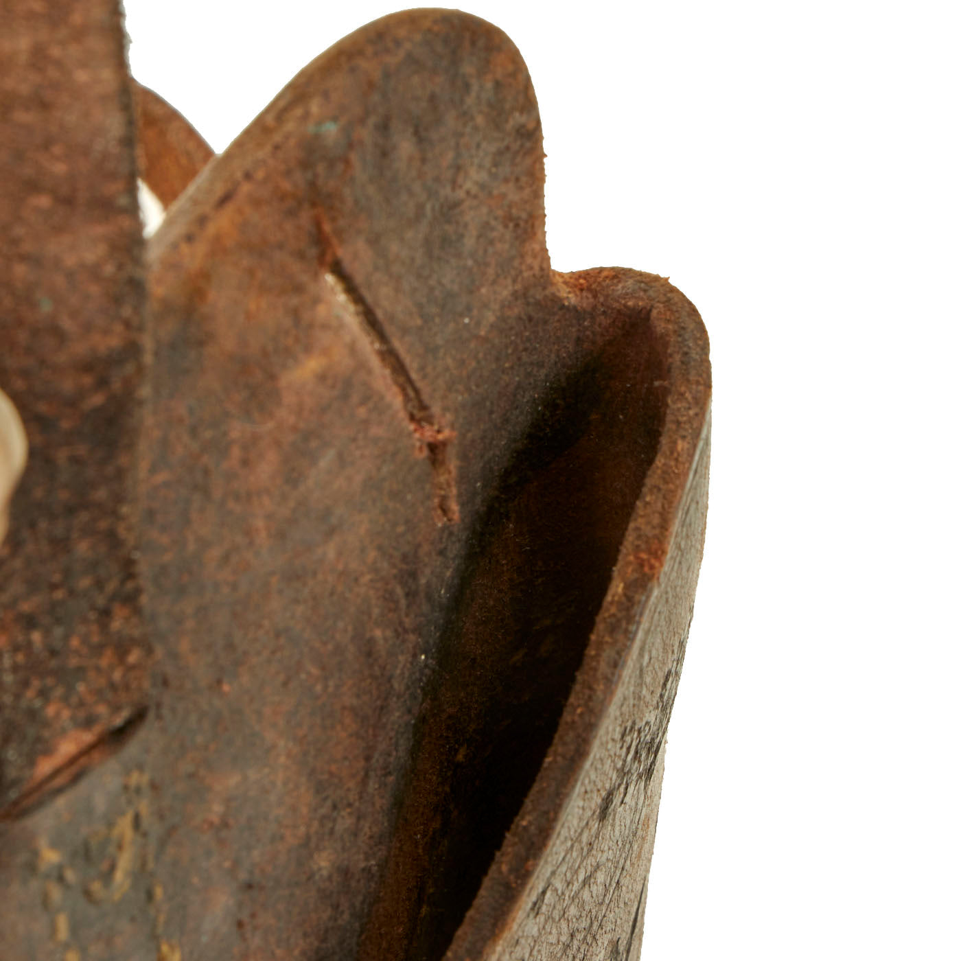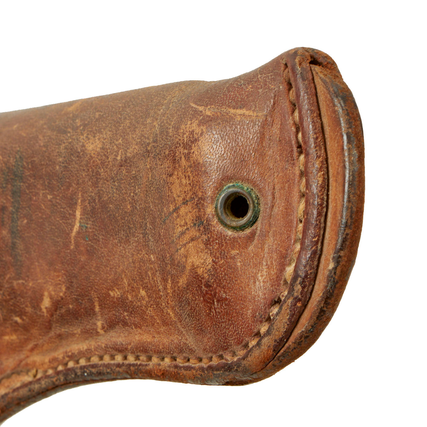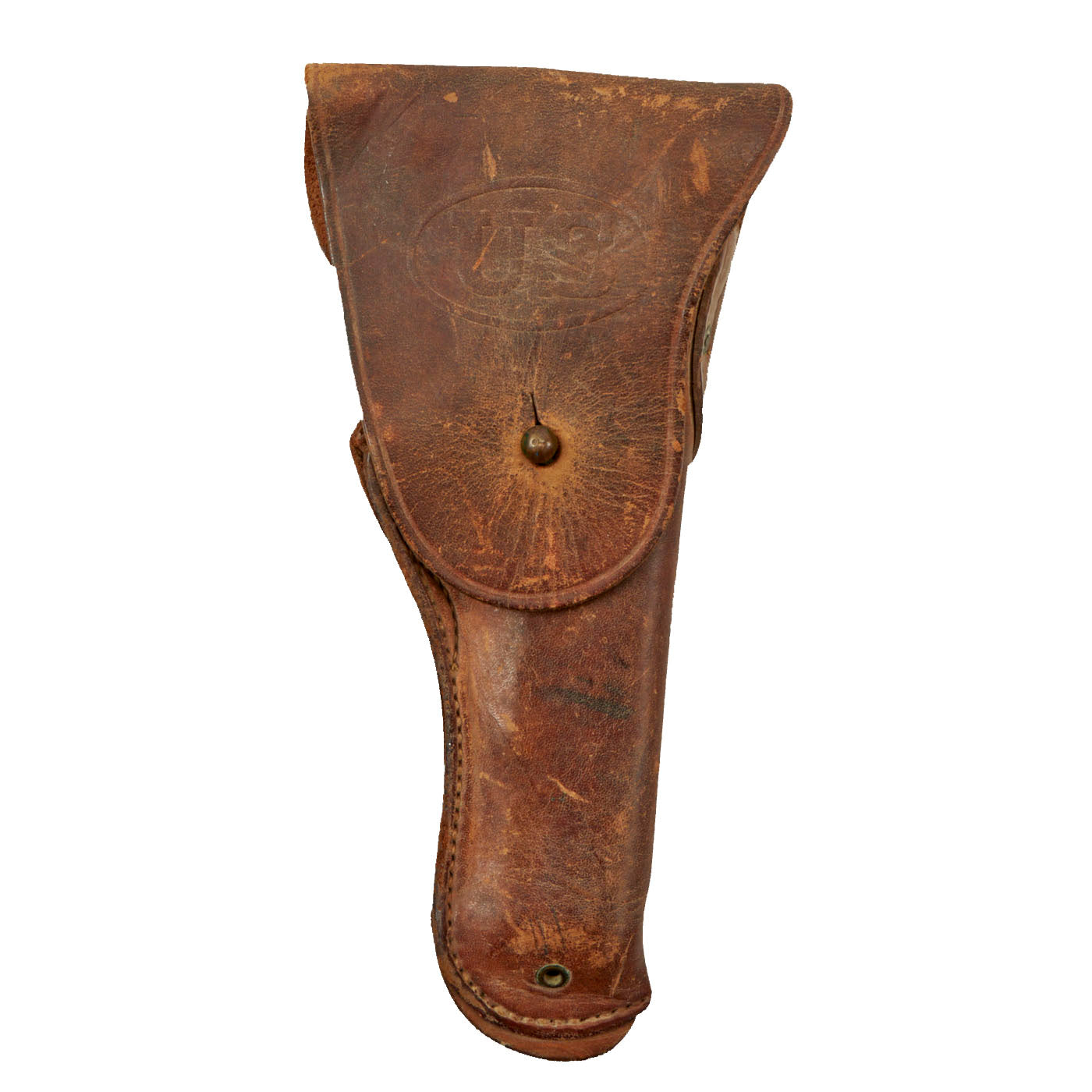 A leather shoulder holster for the .45 pistol, designated as the “M3,” was adopted in 1942 for use by aviators, tankers and others who preferred carrying the pistol over the hip holster. An improved shoulder holster design was standardized in 1944 as the M7. The pistol was secured in the shoulder holster by means of leather strap with a snap fastener. The shoulder holsters were also embossed with a large “U.S” on the front, with the identity of the manufacturer and year of production on the back.