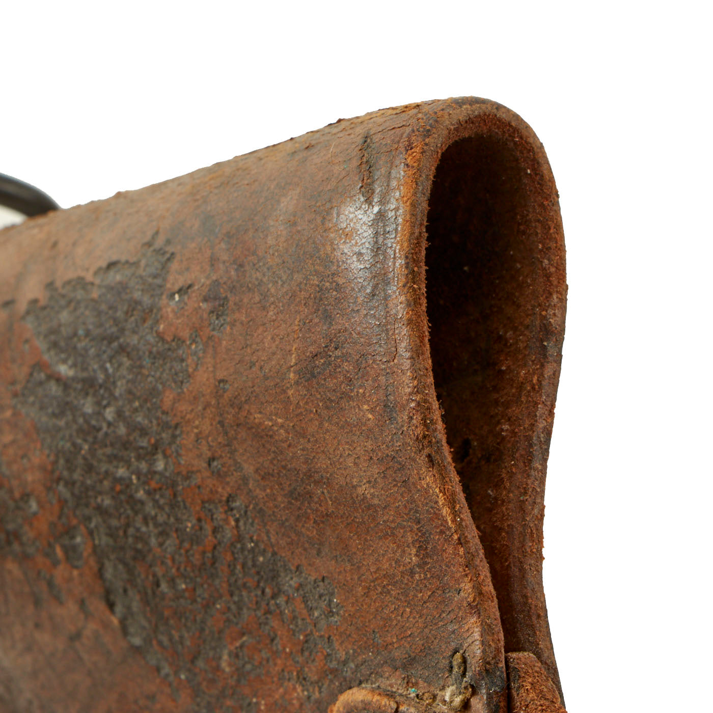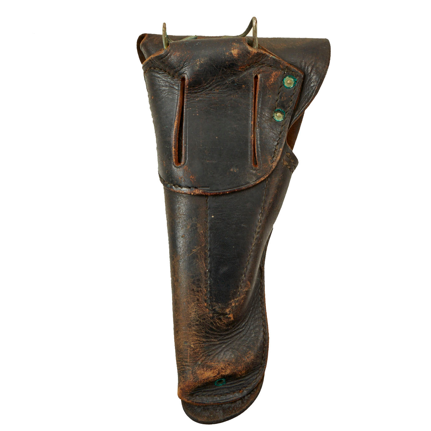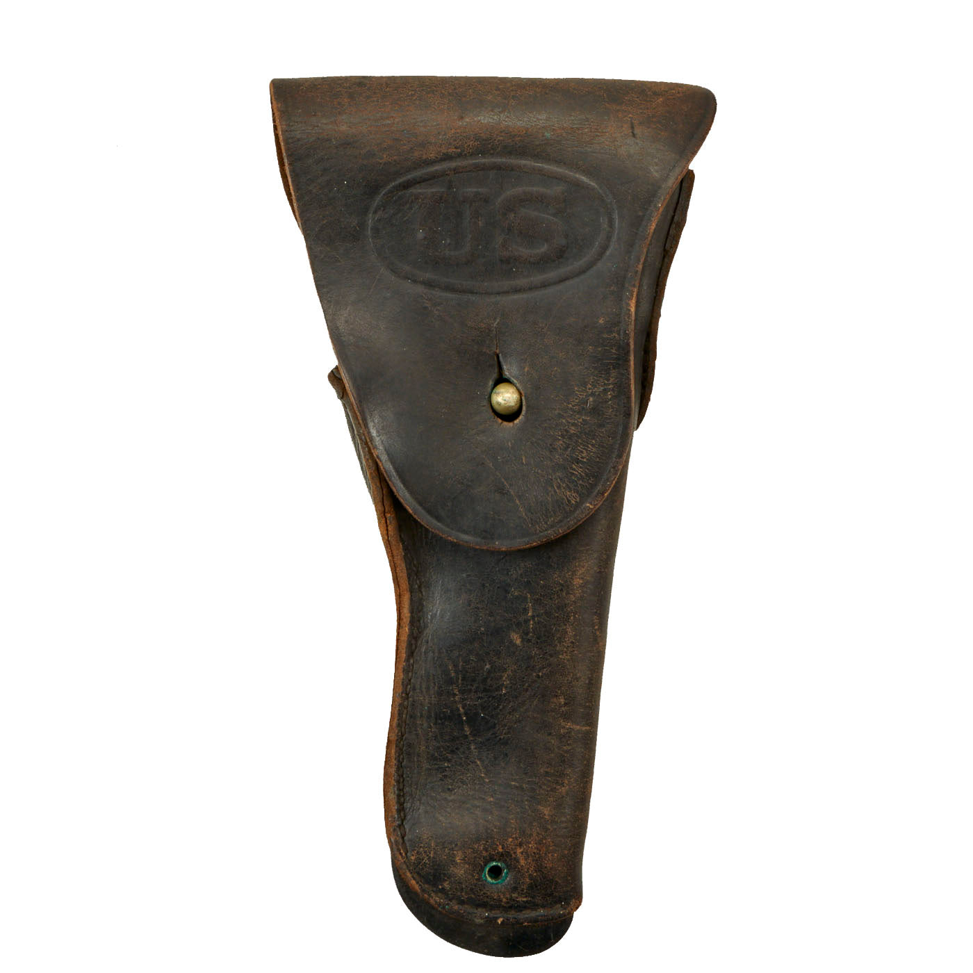 A leather hip holster, the Model of 1912, was standardized soon after the M1911’s adoption. This holster had a swivel attachment to make it better adapted to cavalry use. Just before America’s entry into World War I, the Model of 1916 holster was adopted, which differed from the M1912 primarily in the deletion of the swivel feature. Both were fitted with wire hooks that attached to the grommets on the bottom of the standard webbed pistol belt or cartridge belt. There were sufficient numbers of World War I-vintage M1916 holsters to meet the demand until the U.S. became actively involved in World War II. The M1916 holster was put back into production and almost 3 million were made by 18 different commercial firms between 1941 and 1945. These holsters were embossed with a large “U.S.” on the cover flap, with the name of the maker and year of production on back.