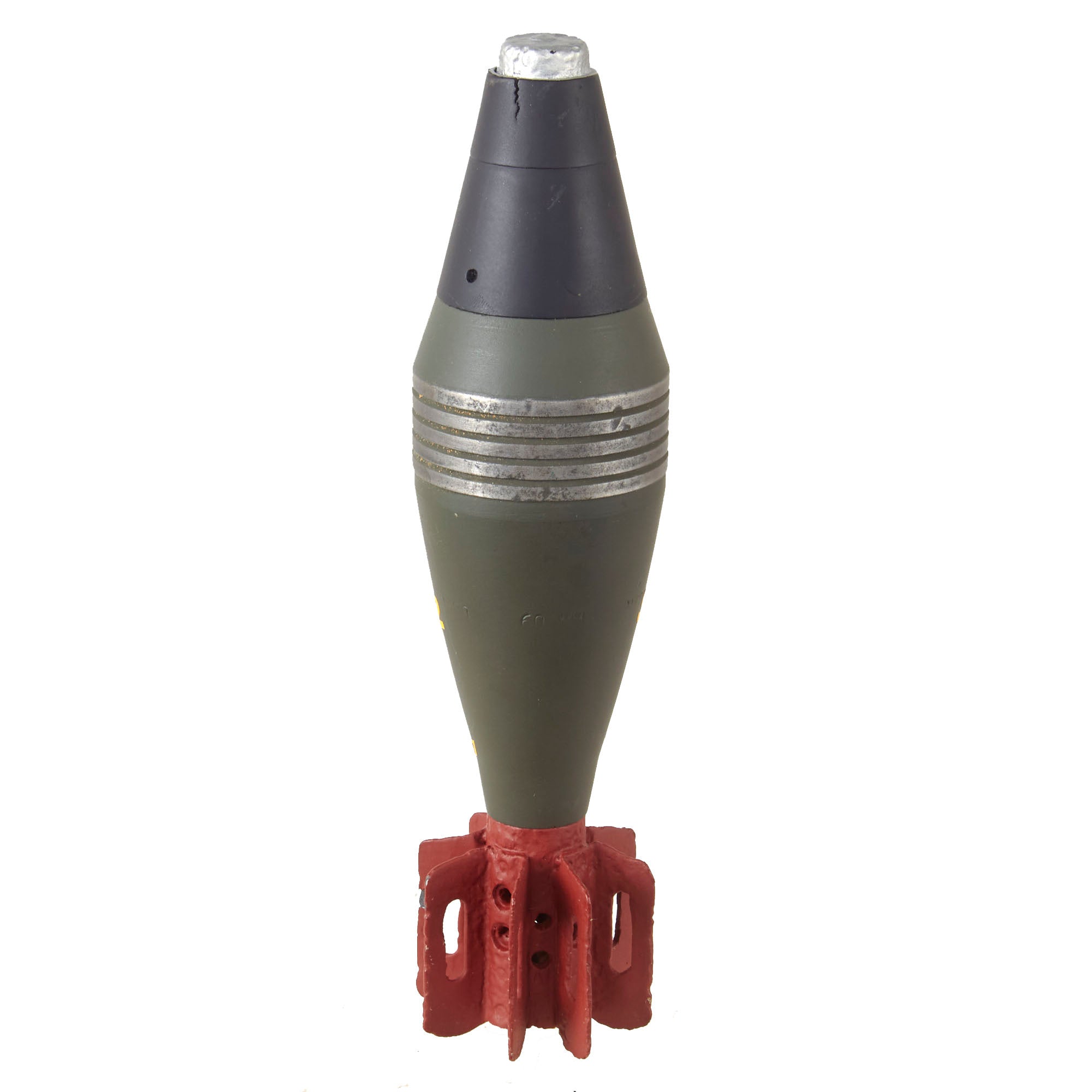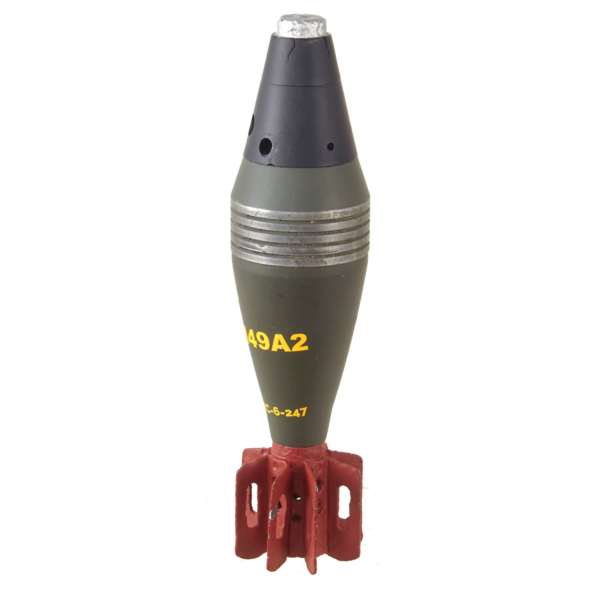 This is a very interesting M49A2 mortar round which is put together from a mix of relic and non-relic parts which were then repainted and restored for display. The fuze is still removable for inspection of the interior. The button is painted silver and is seized.