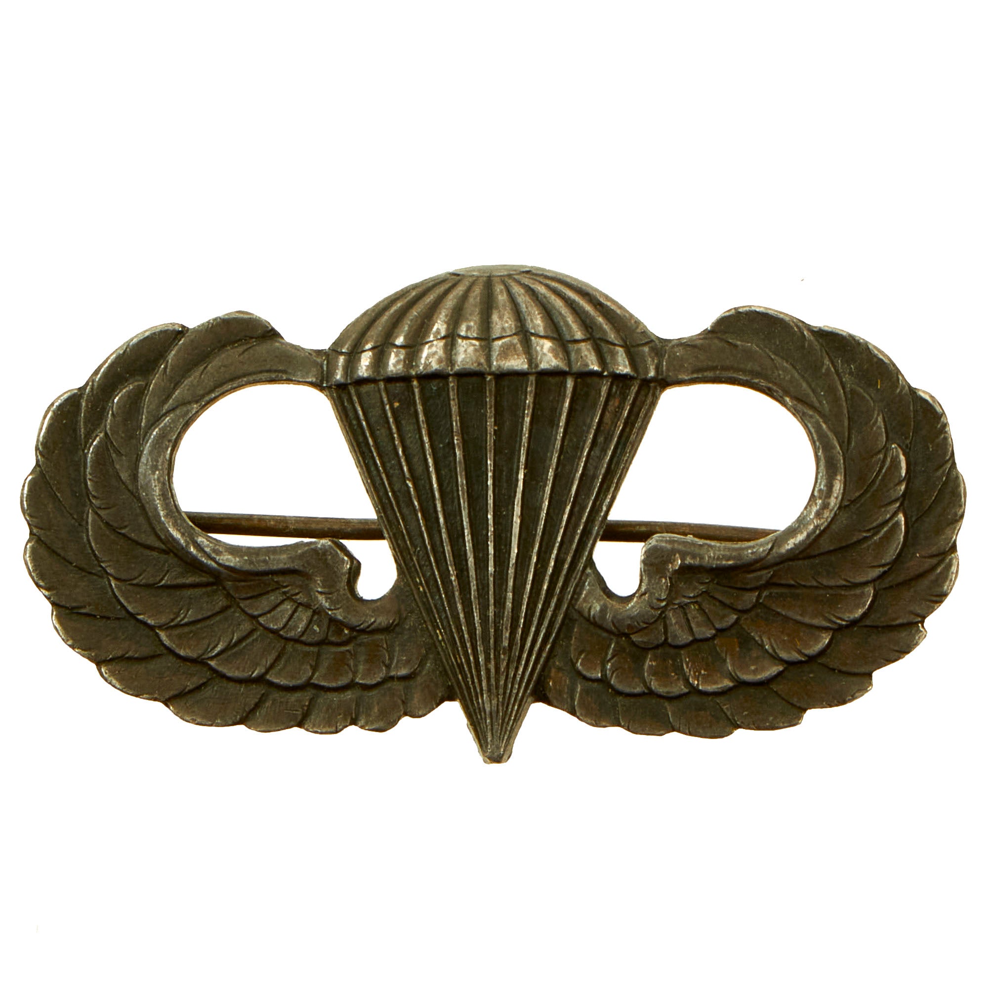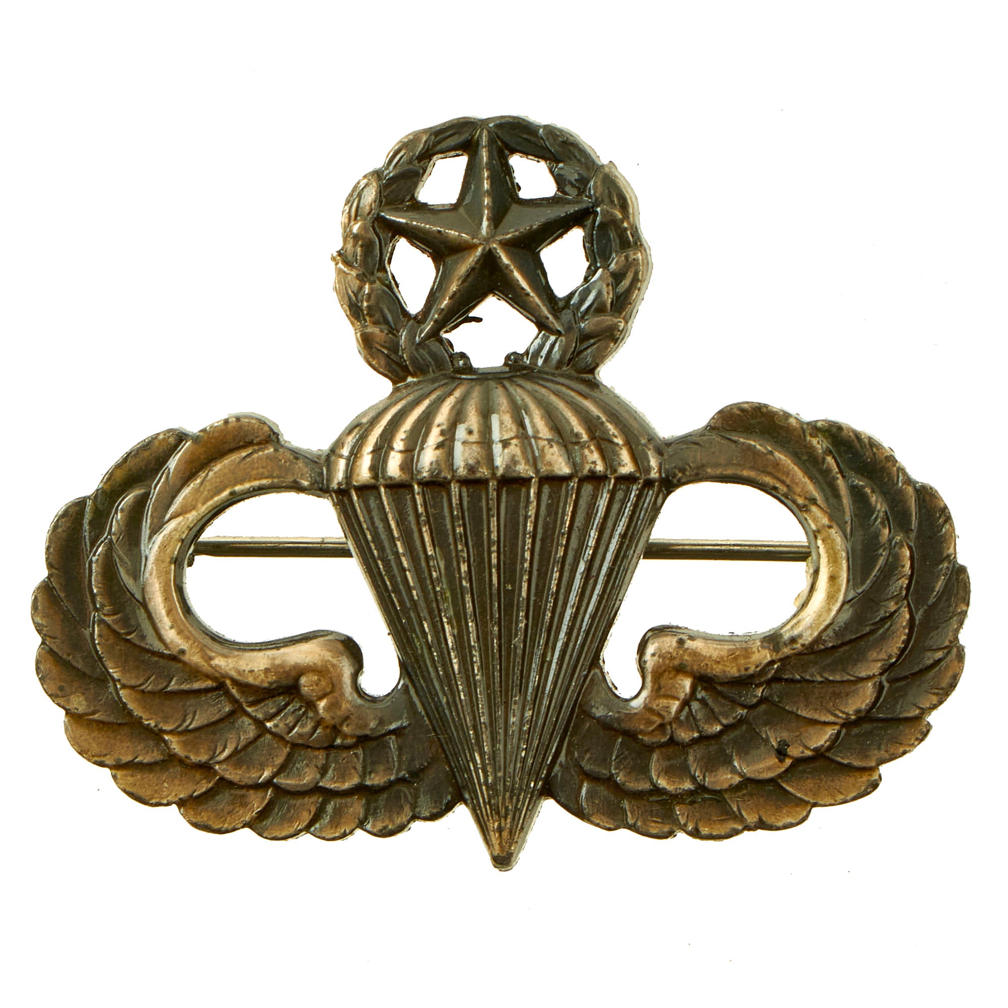 The master parachutist badge is 1+1⁄2 inches (38 mm) wide at the widest part of the wings and 1+13⁄64 inches (31 mm) from the top of the wreath to the bottom of the parachute where the risers meet in a point.