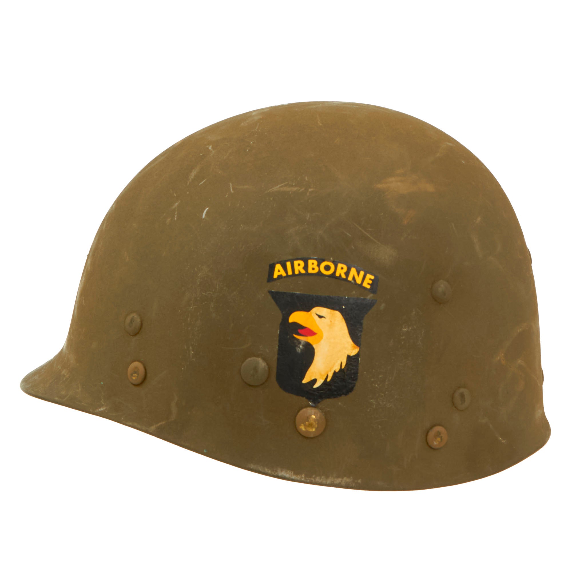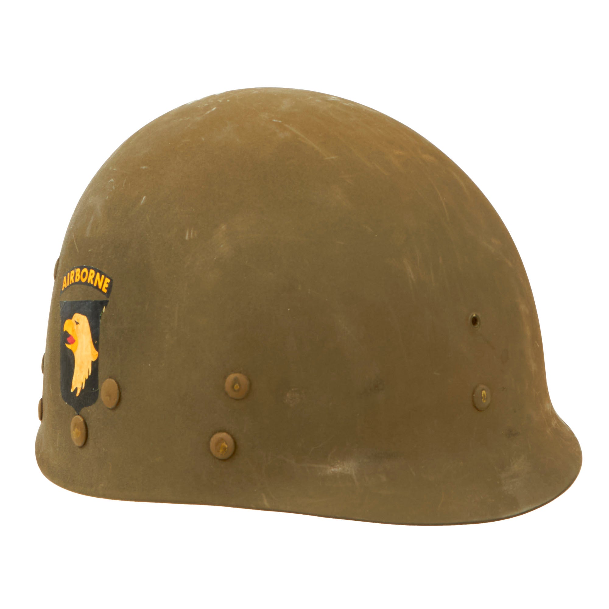 Original Item: Only One Available. This is a genuine World War Two issue M1 Helmet liner by MSA, which was then modified at arsenal to be a paratrooper liner. This process included adding a "female" snap to both sides of the liner, which would interface with the shell chin strap, which on paratrooper models had an extension with a "male" snap on it. Also, 4 of the rivets retaining the "A" washers were removed, which allowed the canvas "A-Yoke" straps that attached to the chin strap to be installed.