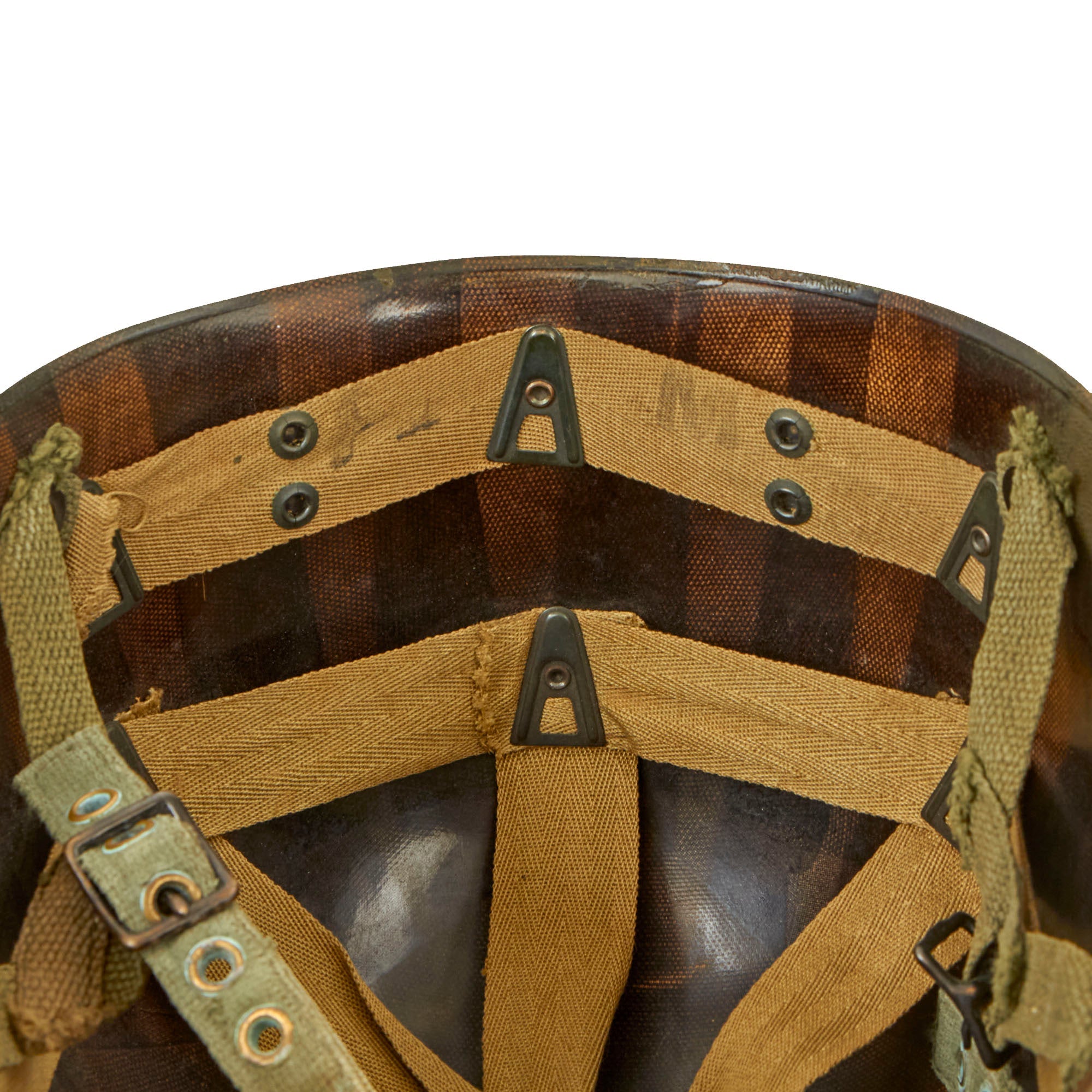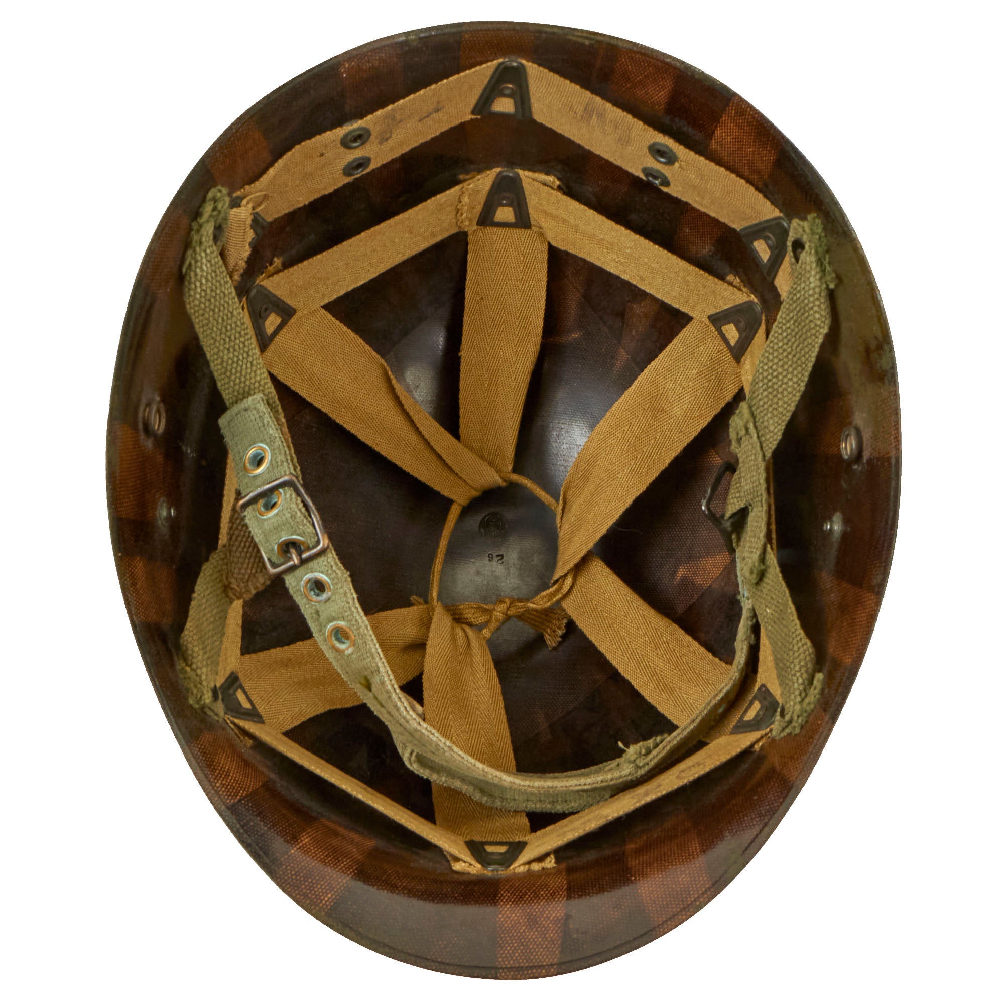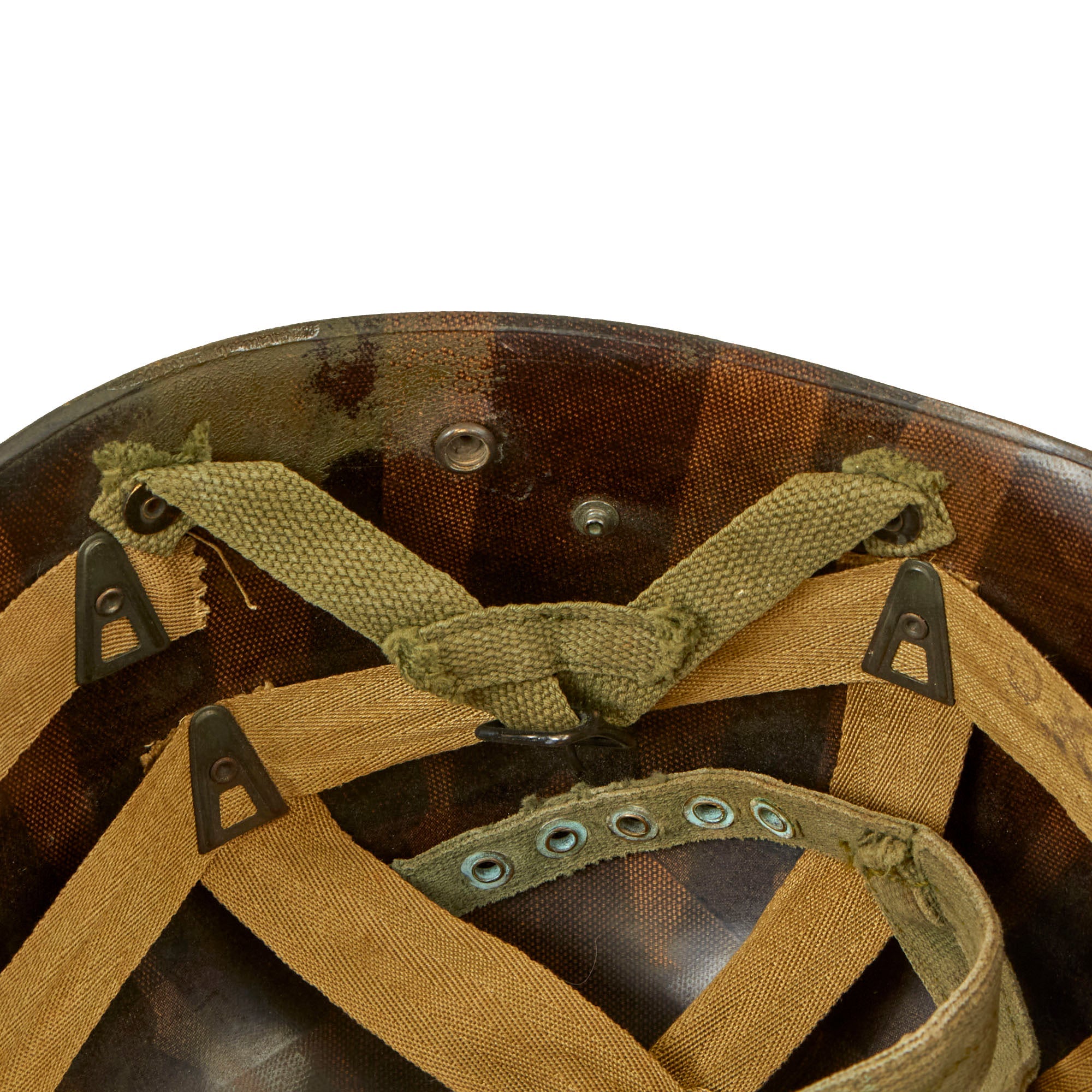 A true US WWII M-1 helmet liner can usually be identified through the frontal eyelet hole. Other correct WW2 features include cotton herringbone twill (HBT) cloth suspension in early ear OD Green #3. This HBT suspension is held tightly within the M-1 helmet liner by rivets and a series of triangular "A" washers. The three upper suspension bands are joined together with a shoestring. This way the wearer could adjust the fit. The original sweatband is missing, most likely removed long ago due to deterioration.