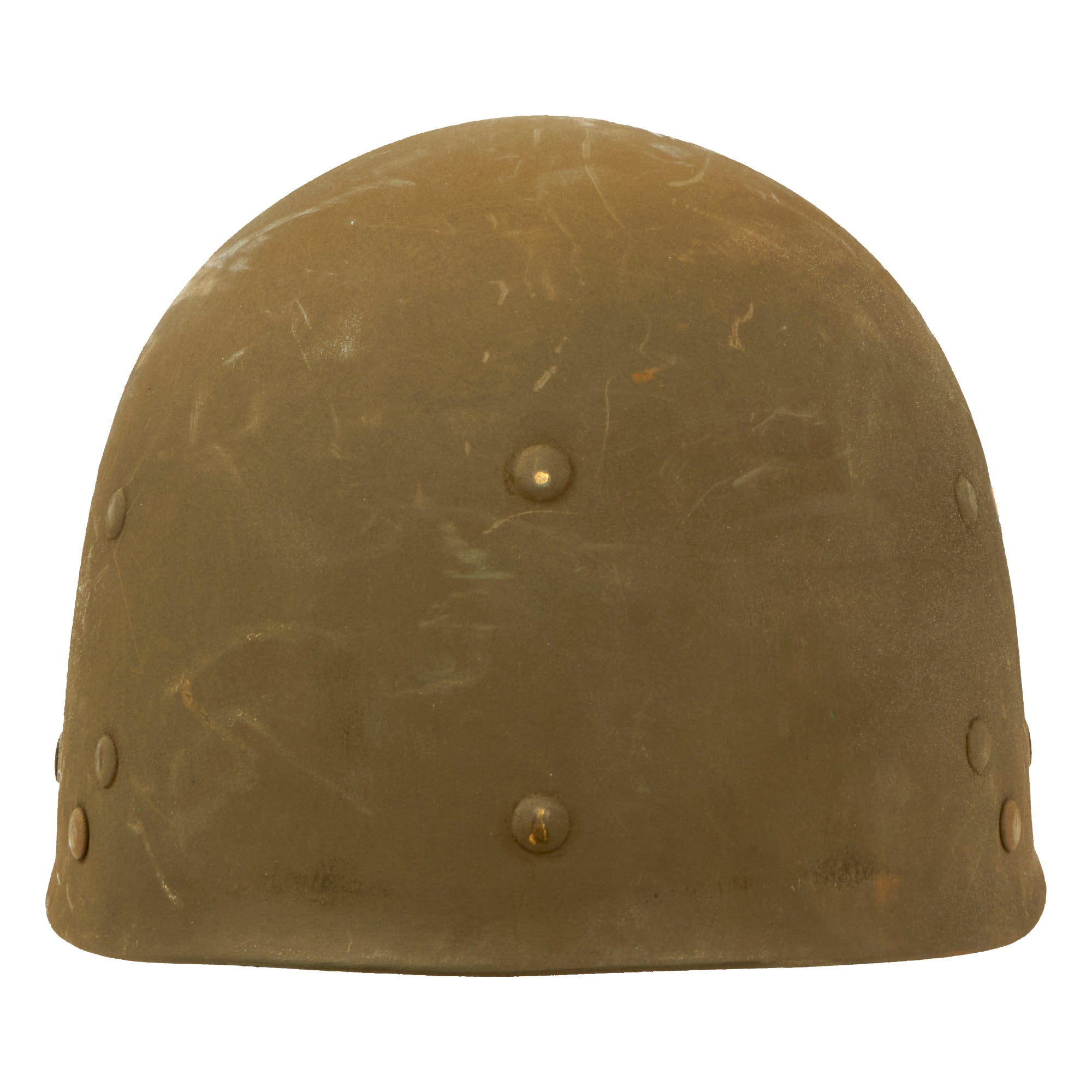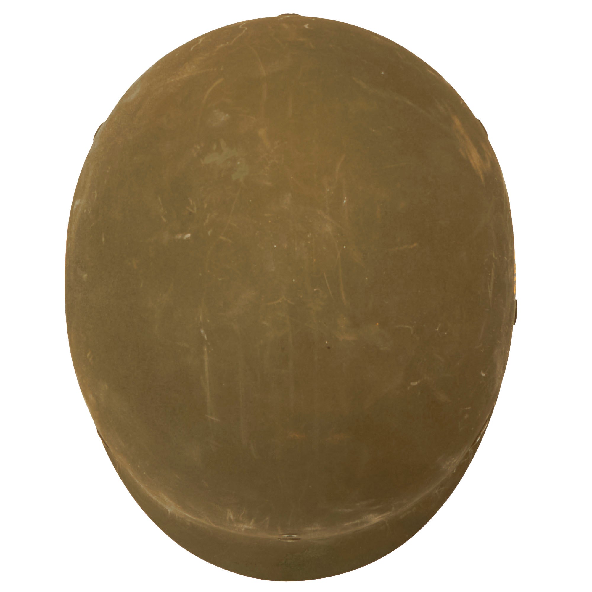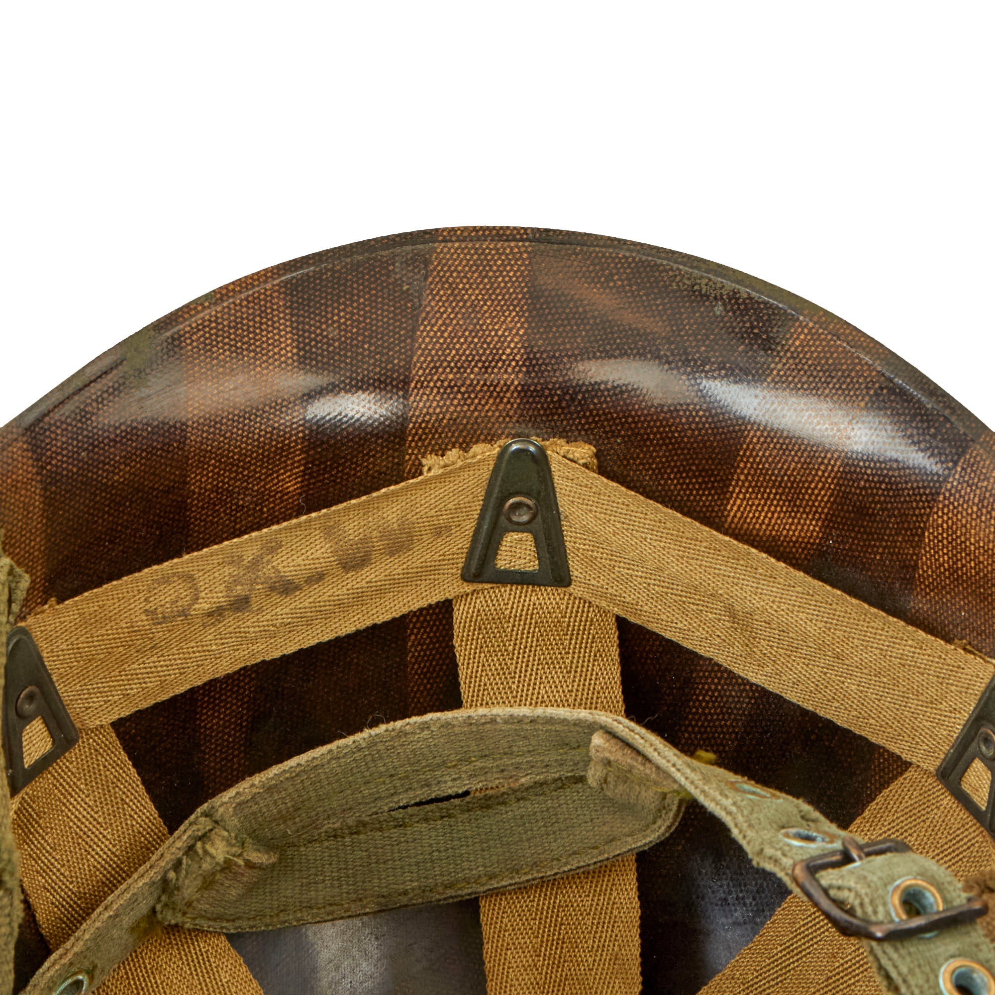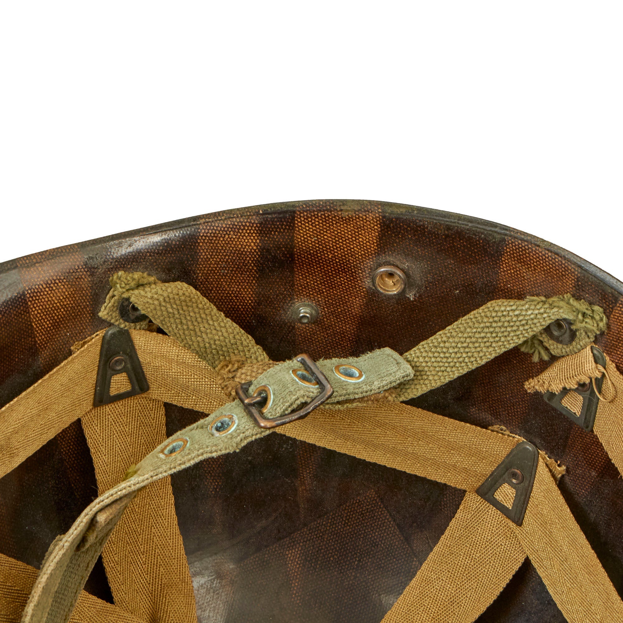 A true US WWII M-1 helmet liner can usually be identified through the frontal eyelet hole. Other correct WW2 features include cotton herringbone twill (HBT) cloth suspension in early ear OD Green #3. This HBT suspension is held tightly within the M-1 helmet liner by rivets and a series of triangular "A" washers. The three upper suspension bands are joined together with a shoestring. This way the wearer could adjust the fit. The original sweatband is missing, most likely removed long ago due to deterioration.