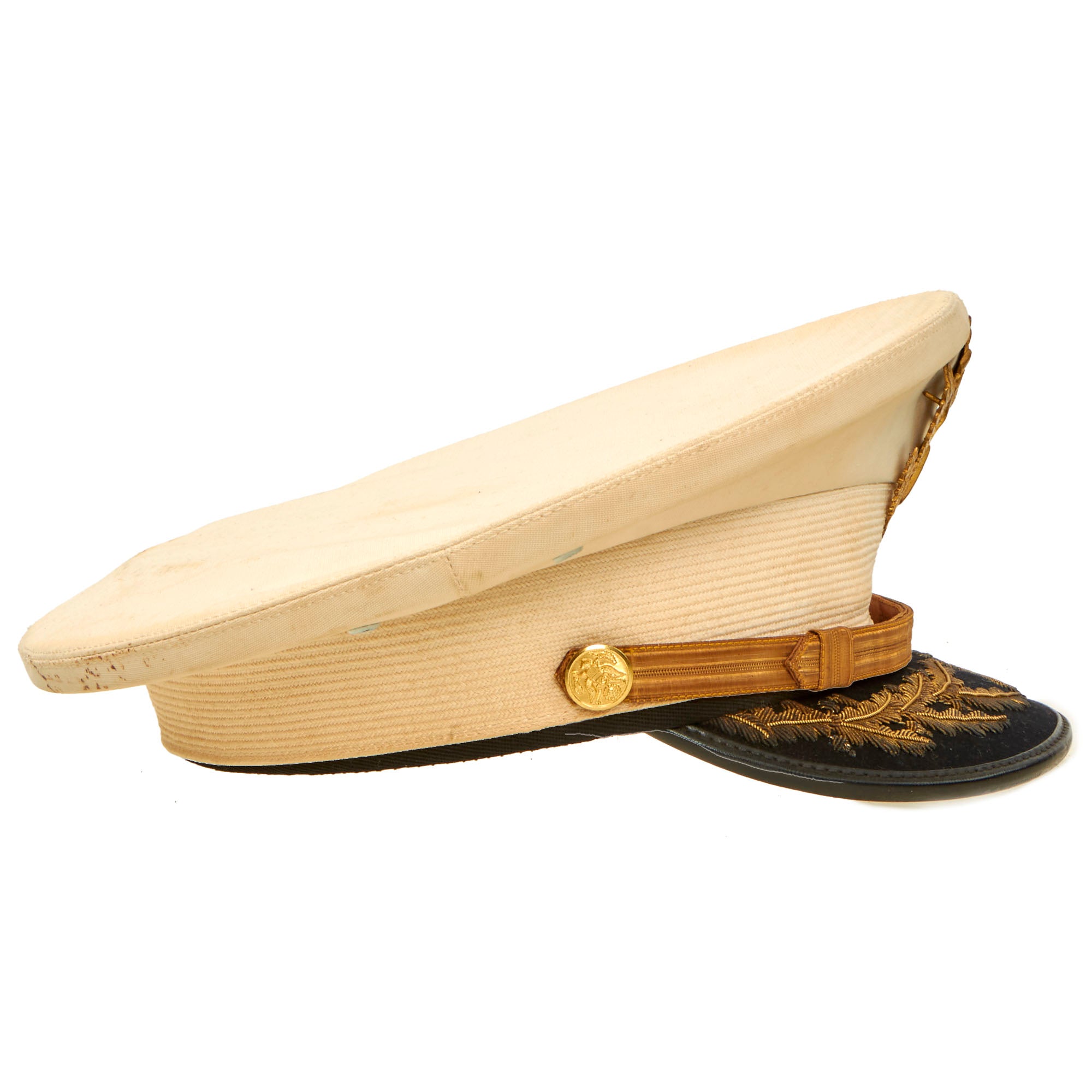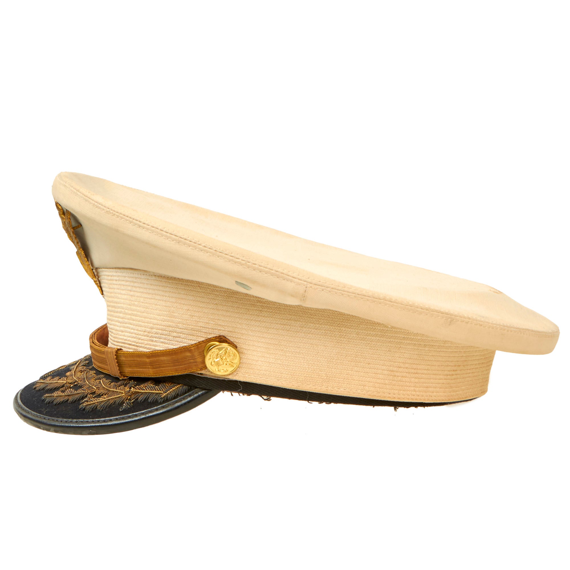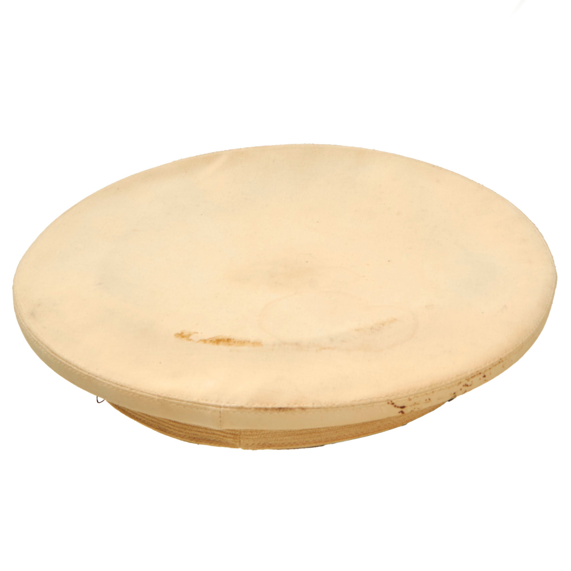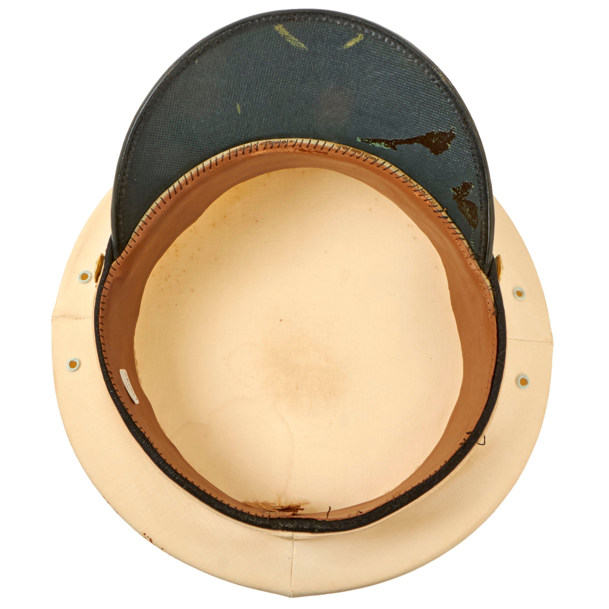 This visor is in wonderful condition, but it does show some signs of age toning, wear, and moderate staining. The age toning is a slight yellowing that occurs on paper or fabric because of exposure to light, air, or environmental pollutants over time. The wear is mostly on the edges, where the visor has rubbed against other surfaces, and the moderate staining is visible on the outer fabric layer. Despite these minor issues, the overall quality of the visor is still very good.