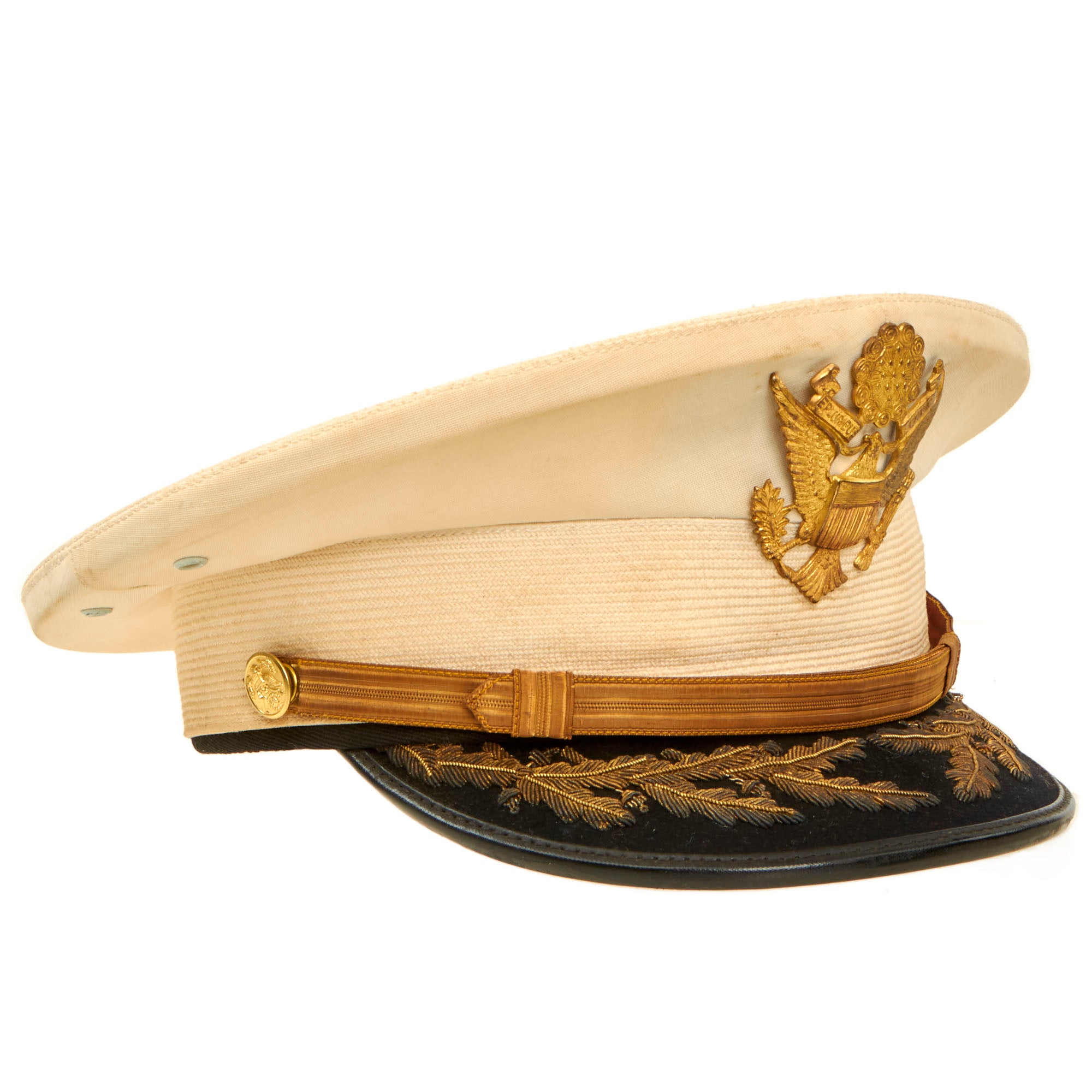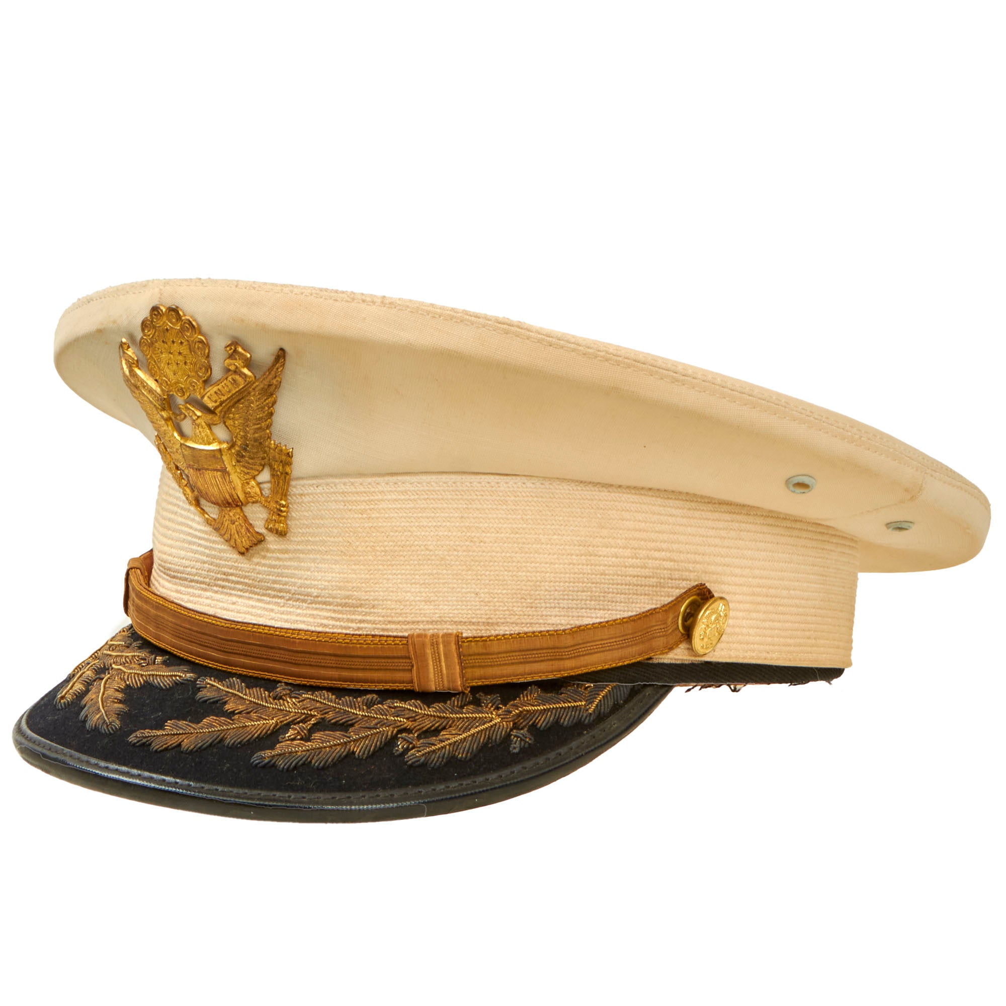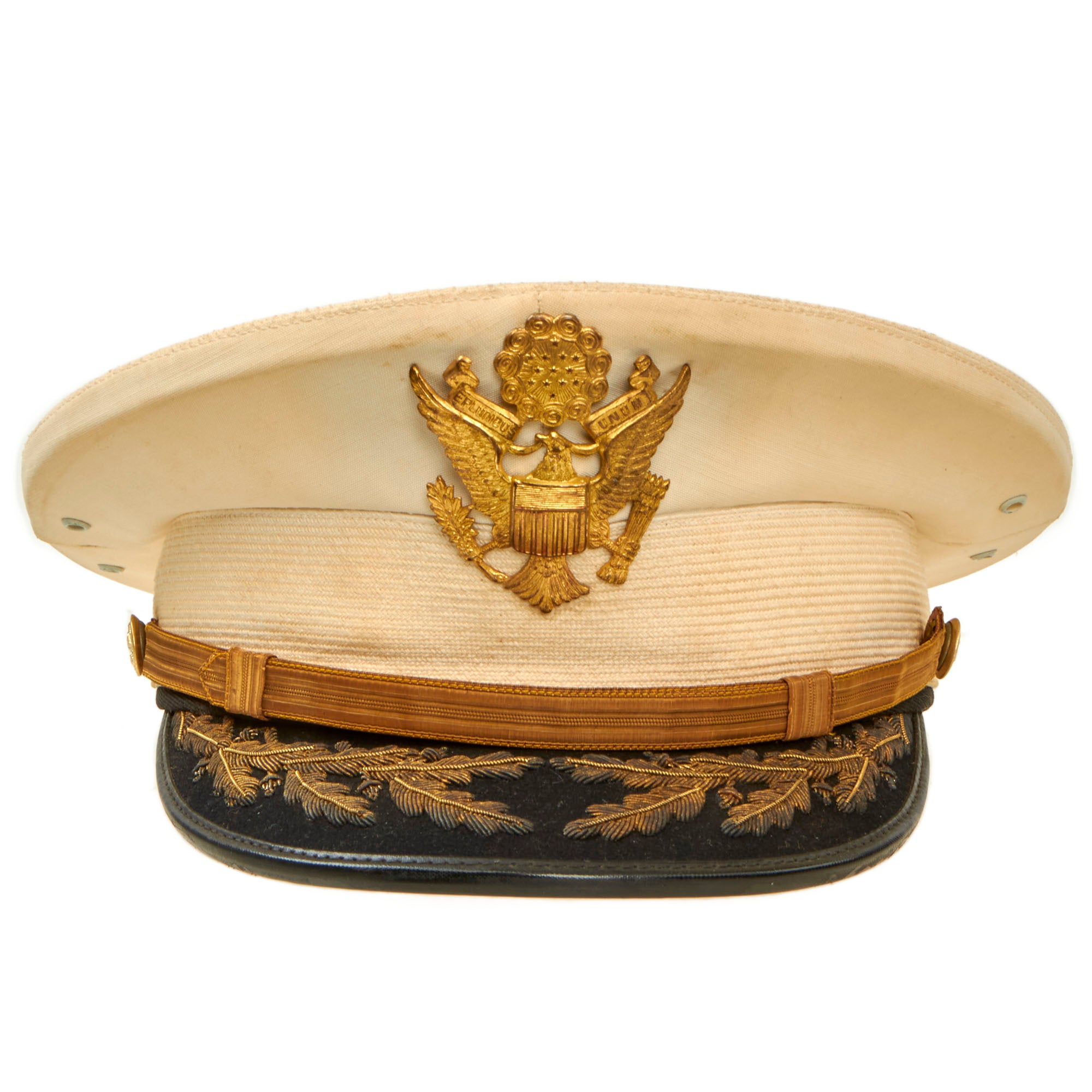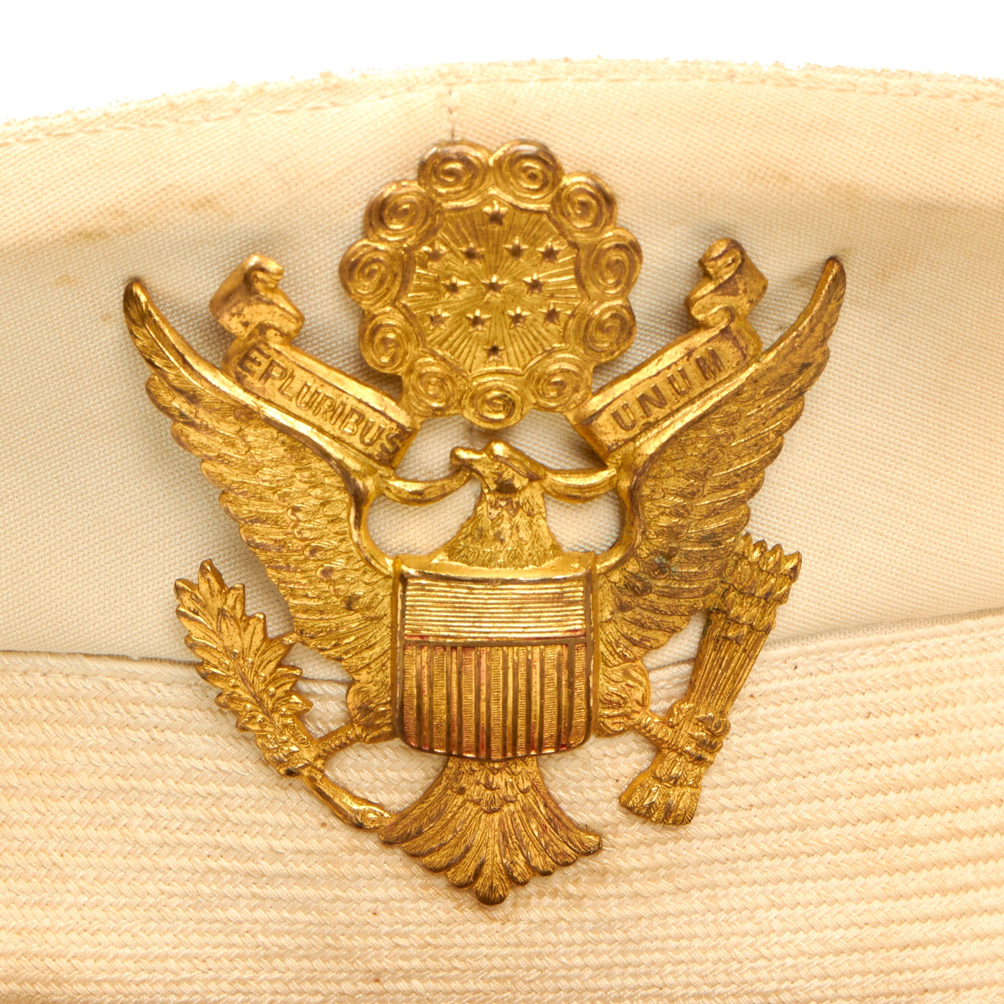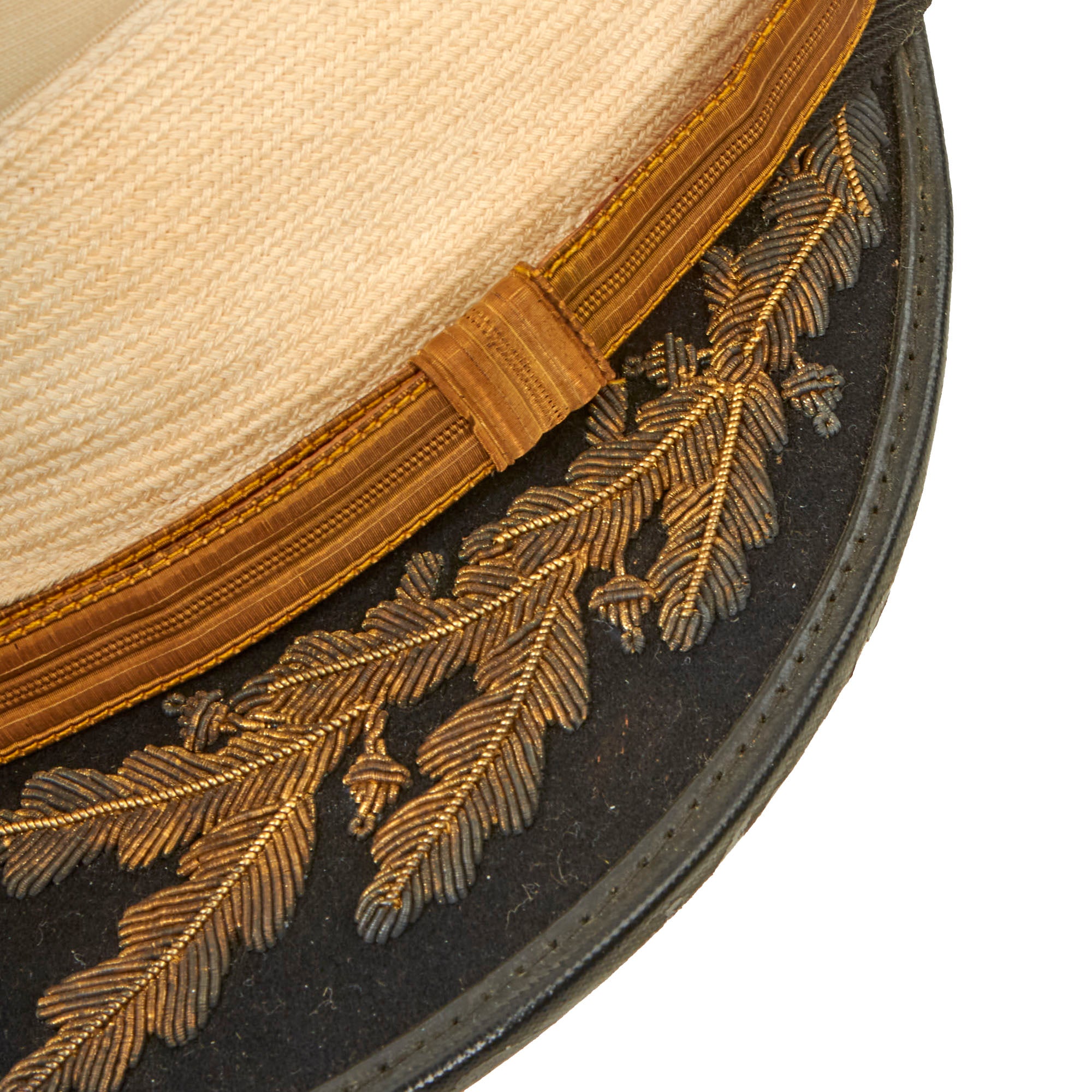 This visor is in wonderful condition, but it does show some signs of age toning, wear, and moderate staining. The age toning is a slight yellowing that occurs on paper or fabric because of exposure to light, air, or environmental pollutants over time. The wear is mostly on the edges, where the visor has rubbed against other surfaces, and the moderate staining is visible on the outer fabric layer. Despite these minor issues, the overall quality of the visor is still very good.