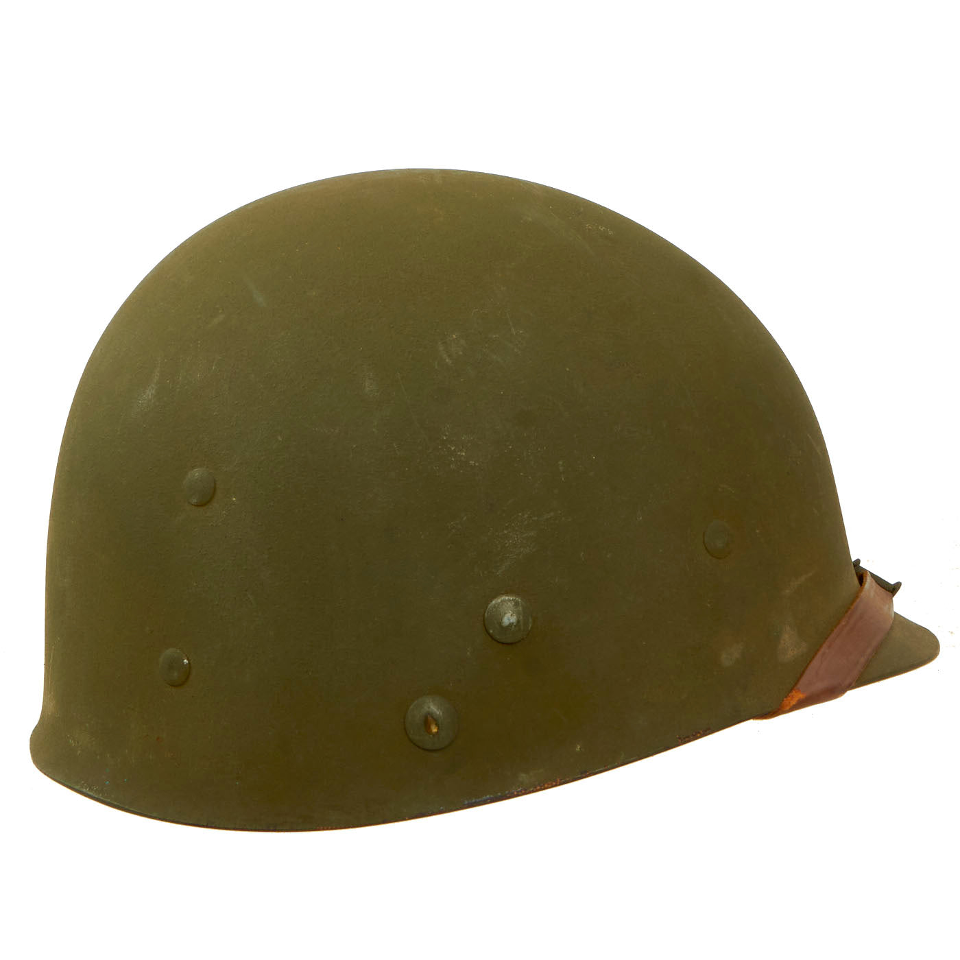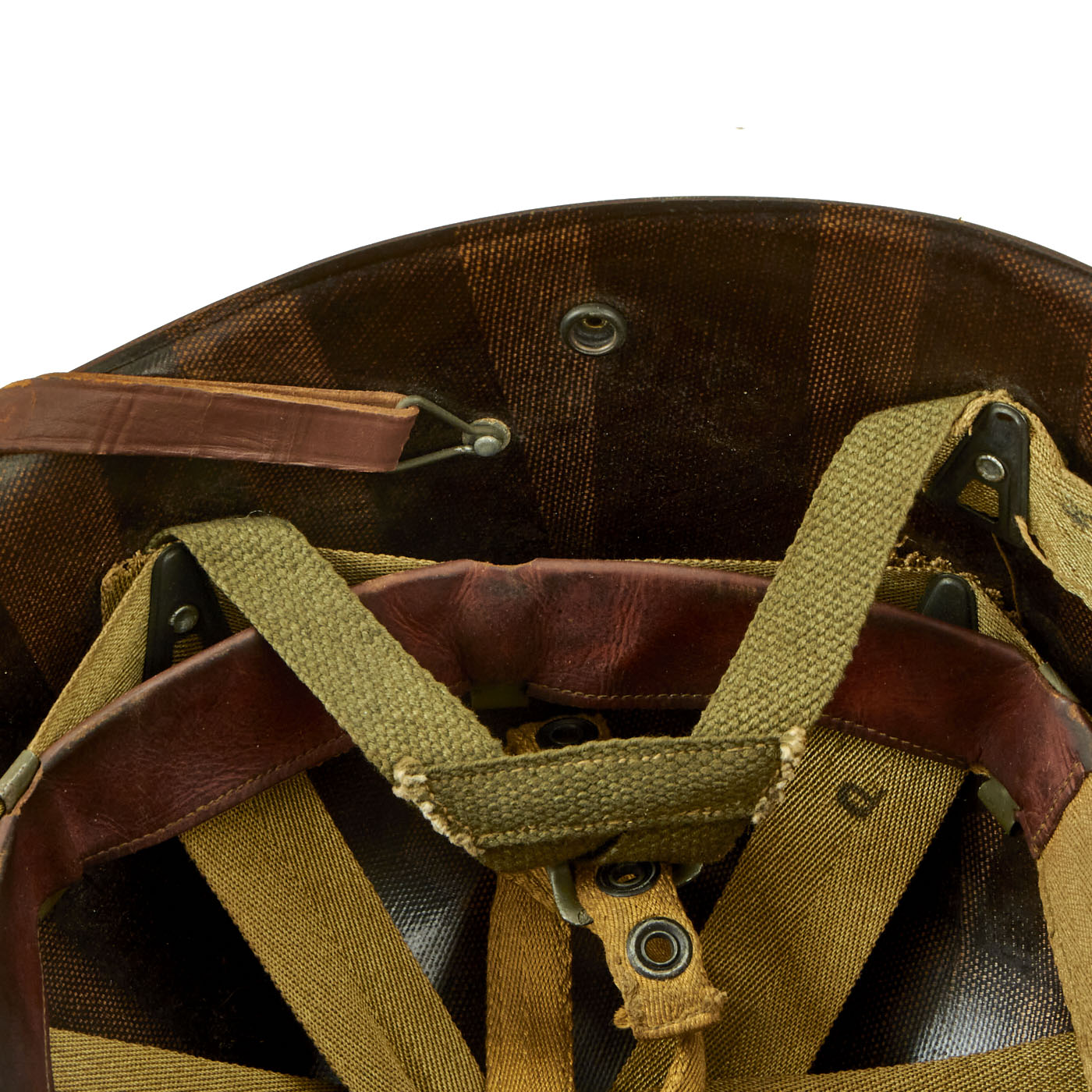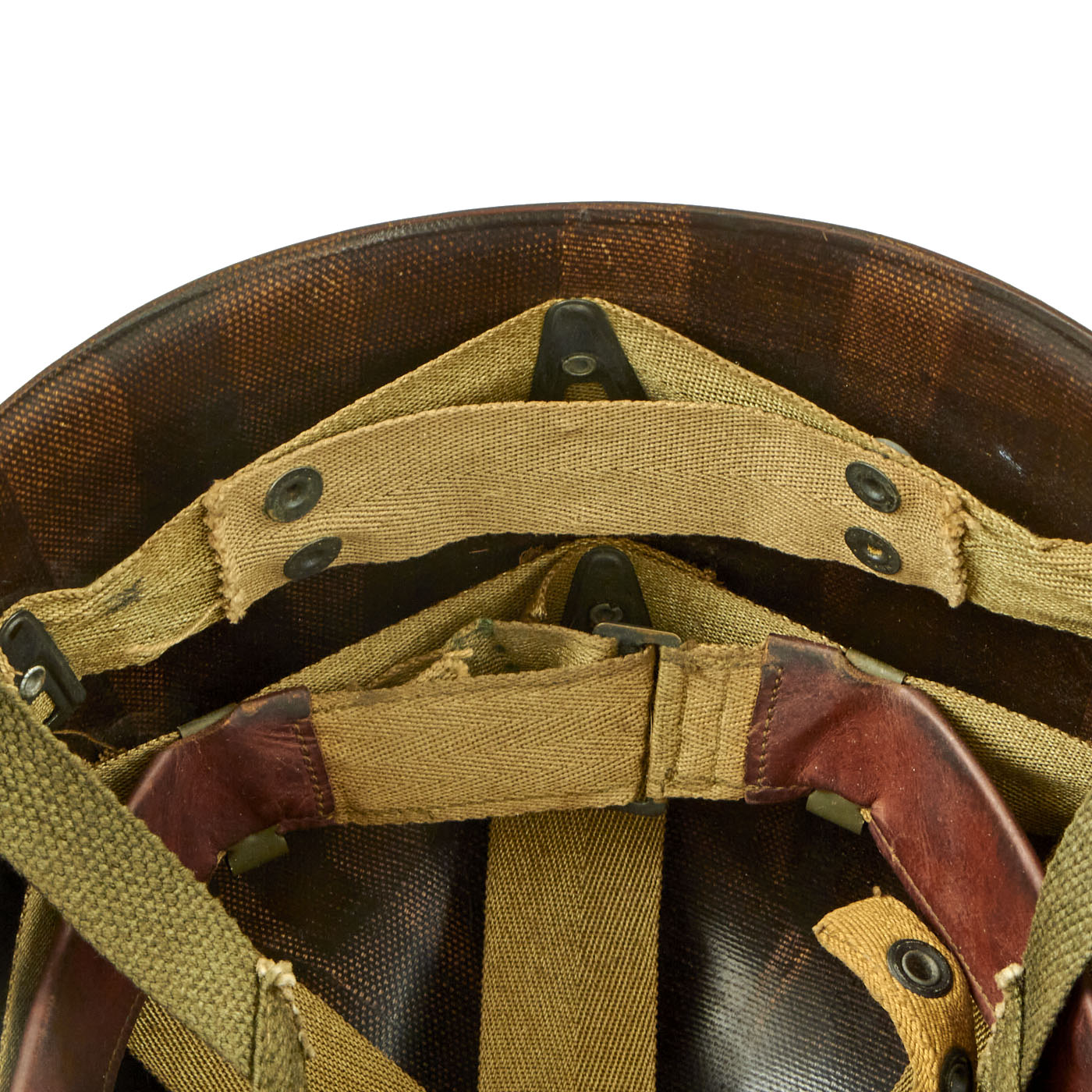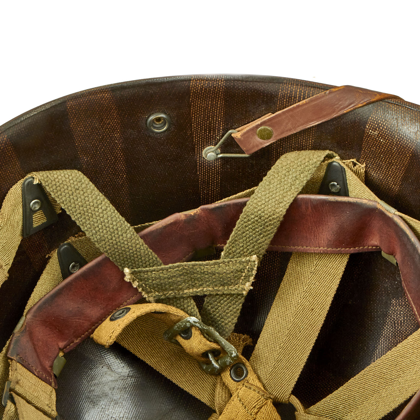 This true M1 liner can be identified through the frontal eyelet hole. Other correct features include OD Green #3 cotton herringbone twill (HBT) cloth suspension liner. This HBT suspension is held tightly within the M-1 helmet liner by rivets and a series of triangular "A" washers. The three upper suspension bands are joined together with the correct tie string. This way the wearer could adjust the fit. The original suspension shows signs of little to no use. The sweatband is present and slightly stained and darkened by sweat. The paratrooper chin strap extensions are both complete with their cast steel buckles, and are in the correct OD Green #3, which matches the aged color of the rigging perfectly.