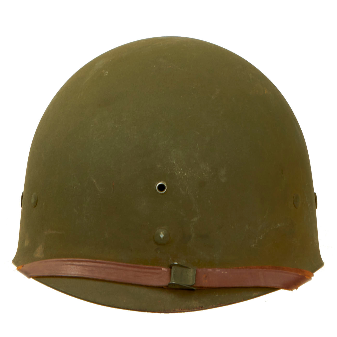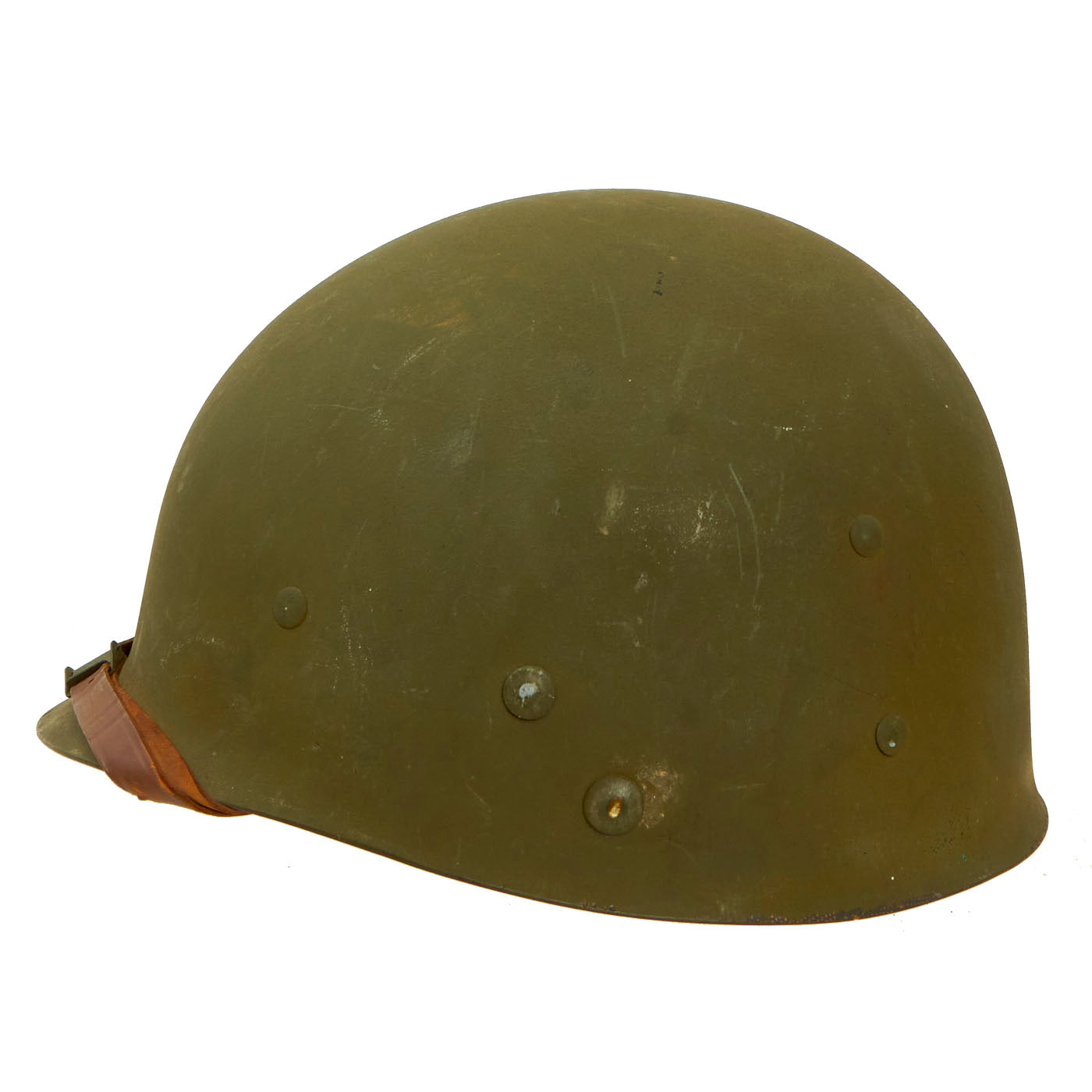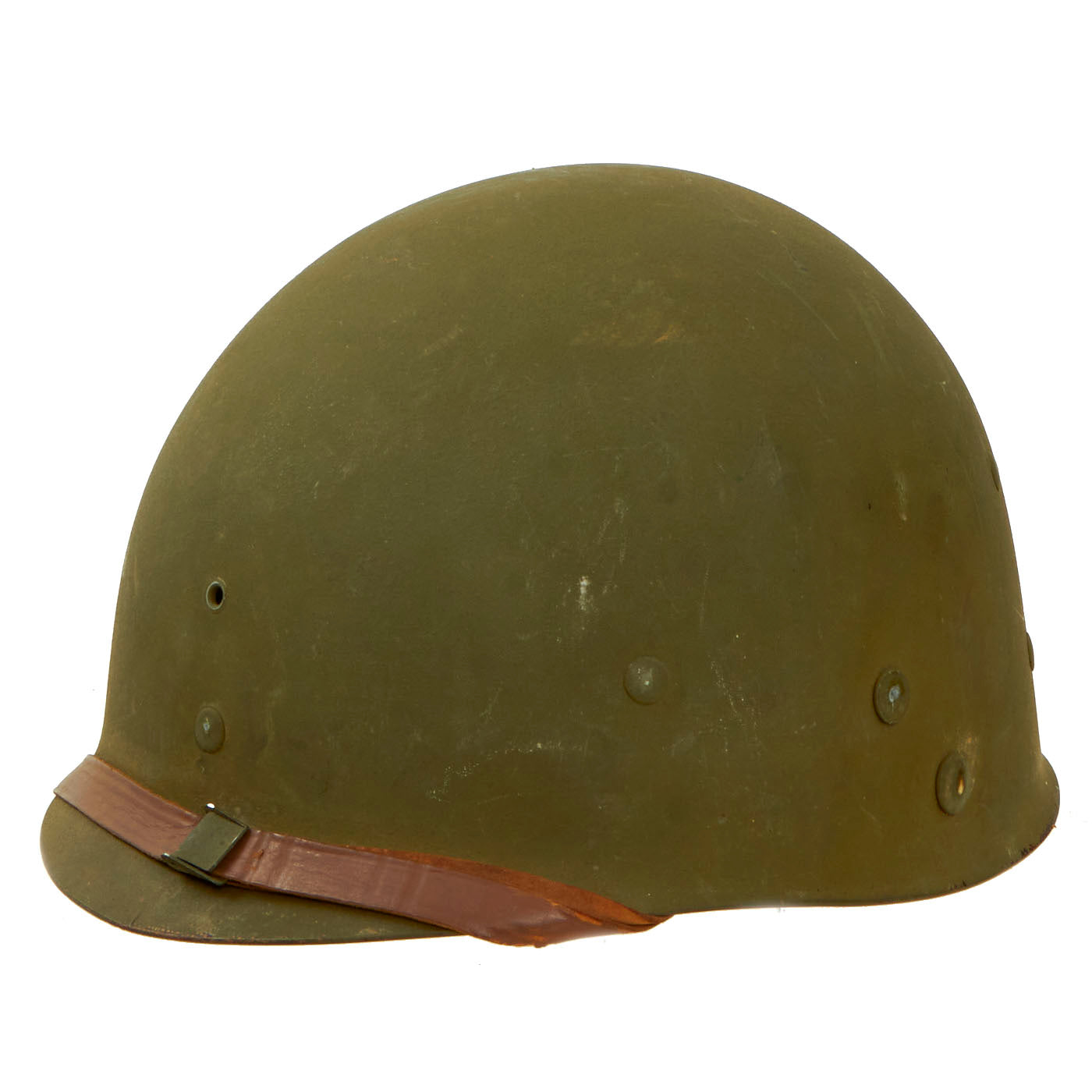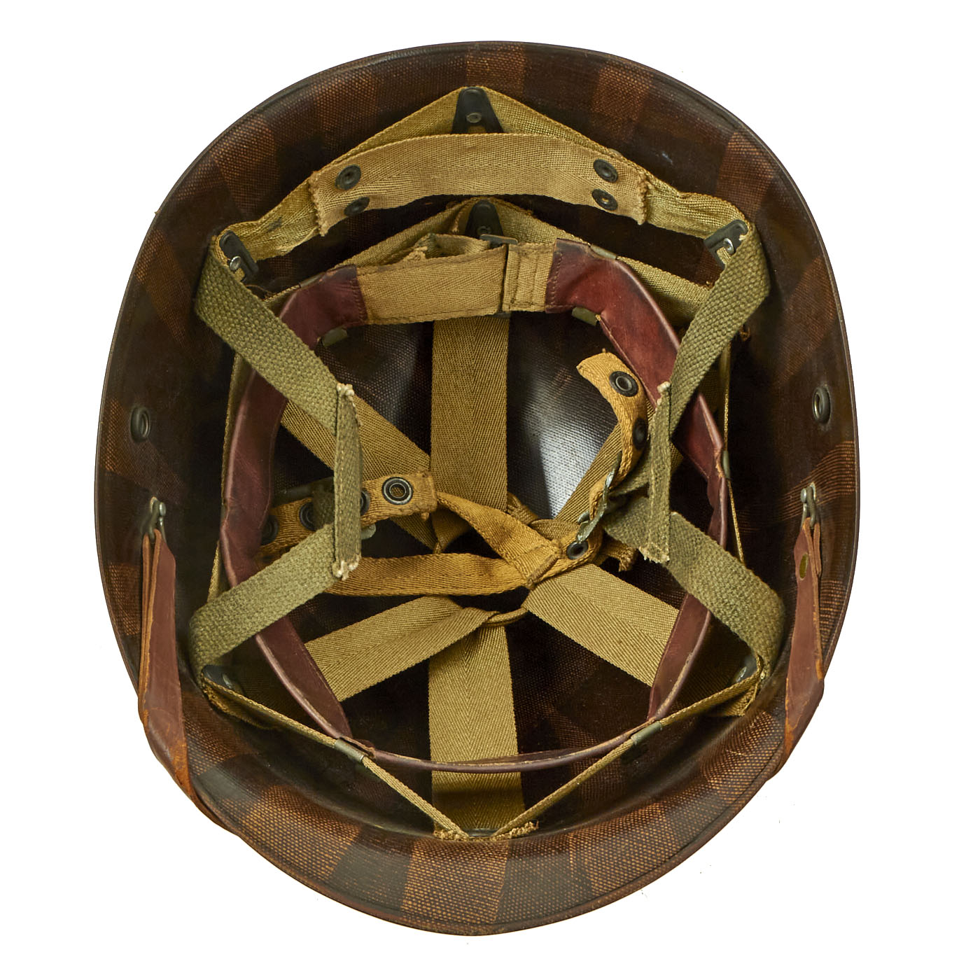 This true M1 liner can be identified through the frontal eyelet hole. Other correct features include OD Green #3 cotton herringbone twill (HBT) cloth suspension liner. This HBT suspension is held tightly within the M-1 helmet liner by rivets and a series of triangular "A" washers. The three upper suspension bands are joined together with the correct tie string. This way the wearer could adjust the fit. The original suspension shows signs of little to no use. The sweatband is present and slightly stained and darkened by sweat. The paratrooper chin strap extensions are both complete with their cast steel buckles, and are in the correct OD Green #3, which matches the aged color of the rigging perfectly.