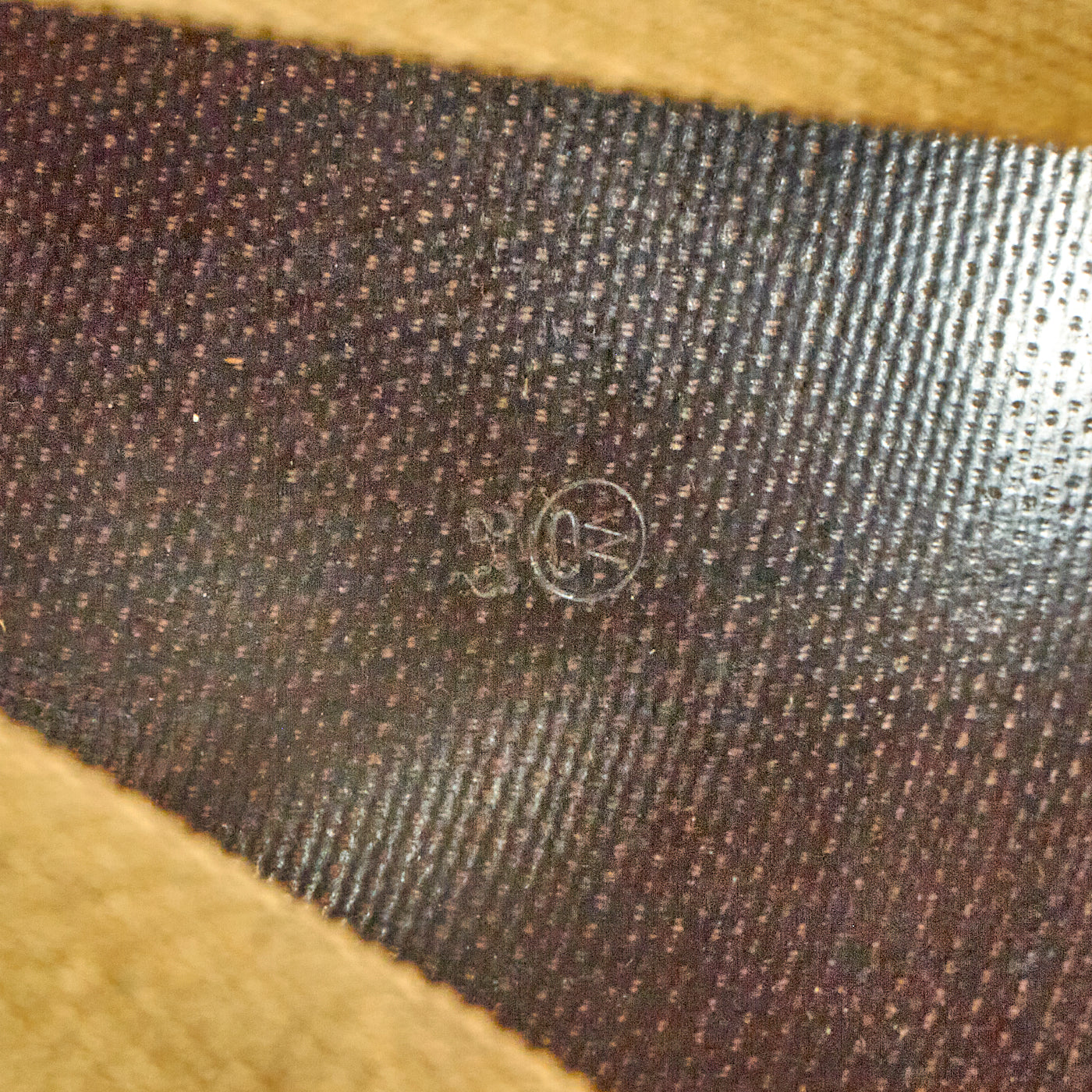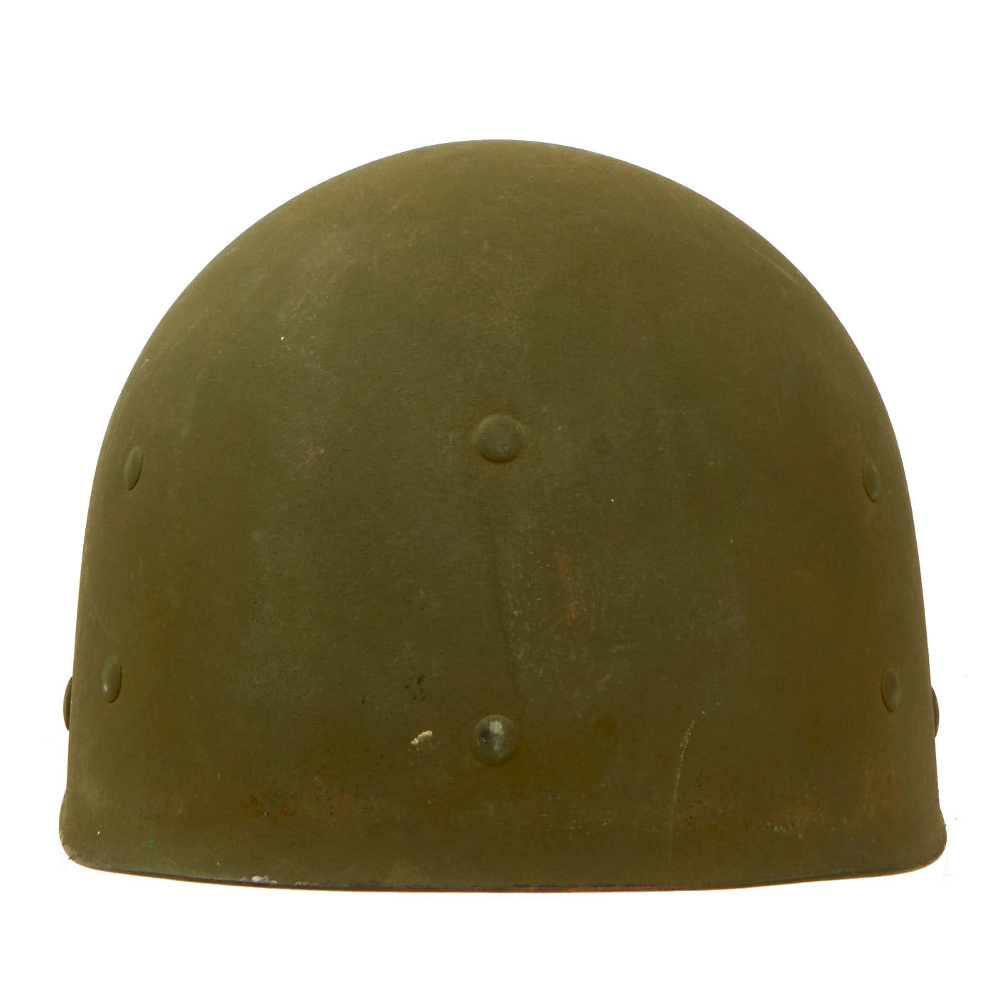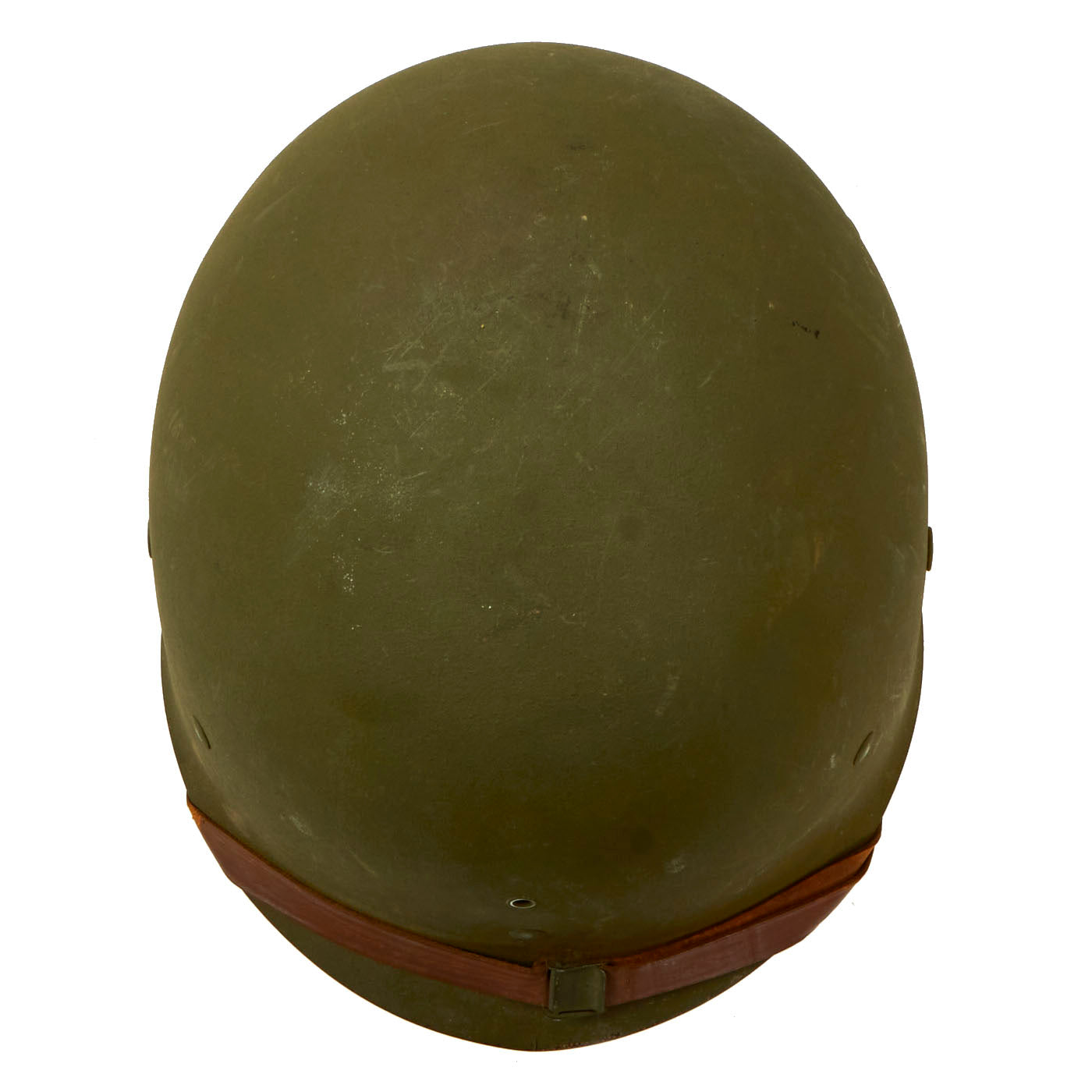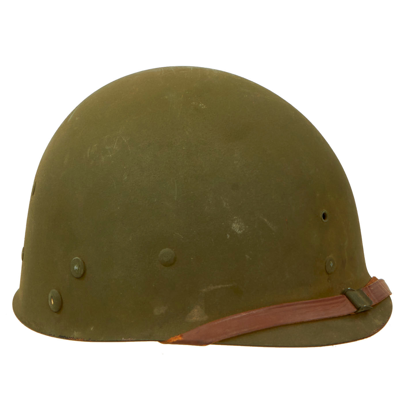 This true M1 liner can be identified through the frontal eyelet hole. Other correct features include OD Green #3 cotton herringbone twill (HBT) cloth suspension liner. This HBT suspension is held tightly within the M-1 helmet liner by rivets and a series of triangular "A" washers. The three upper suspension bands are joined together with the correct tie string. This way the wearer could adjust the fit. The original suspension shows signs of little to no use. The sweatband is present and slightly stained and darkened by sweat. The paratrooper chin strap extensions are both complete with their cast steel buckles, and are in the correct OD Green #3, which matches the aged color of the rigging perfectly.