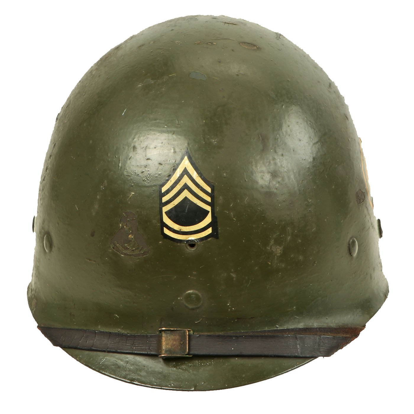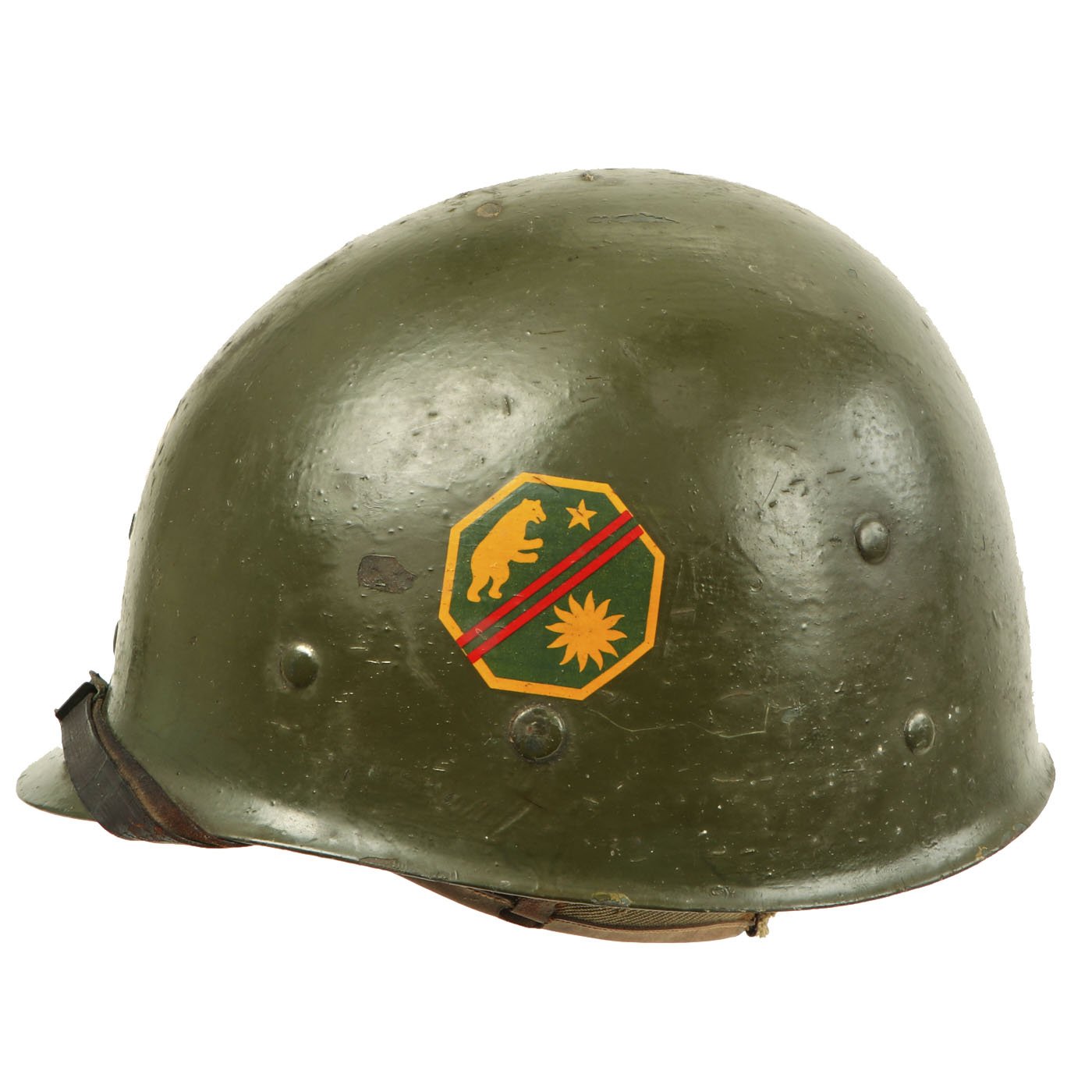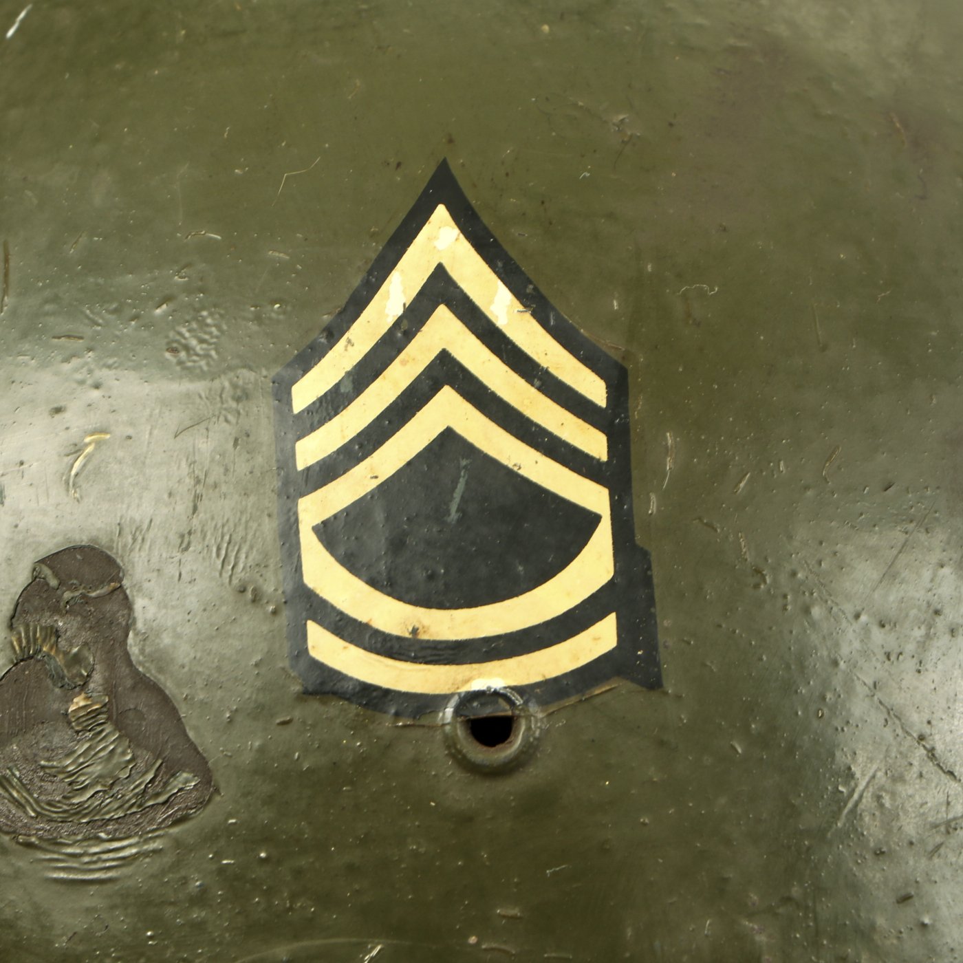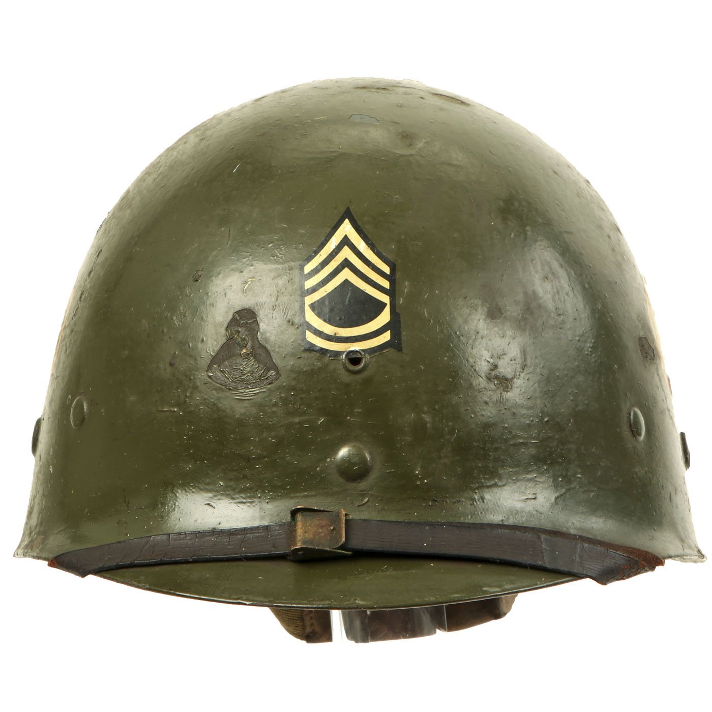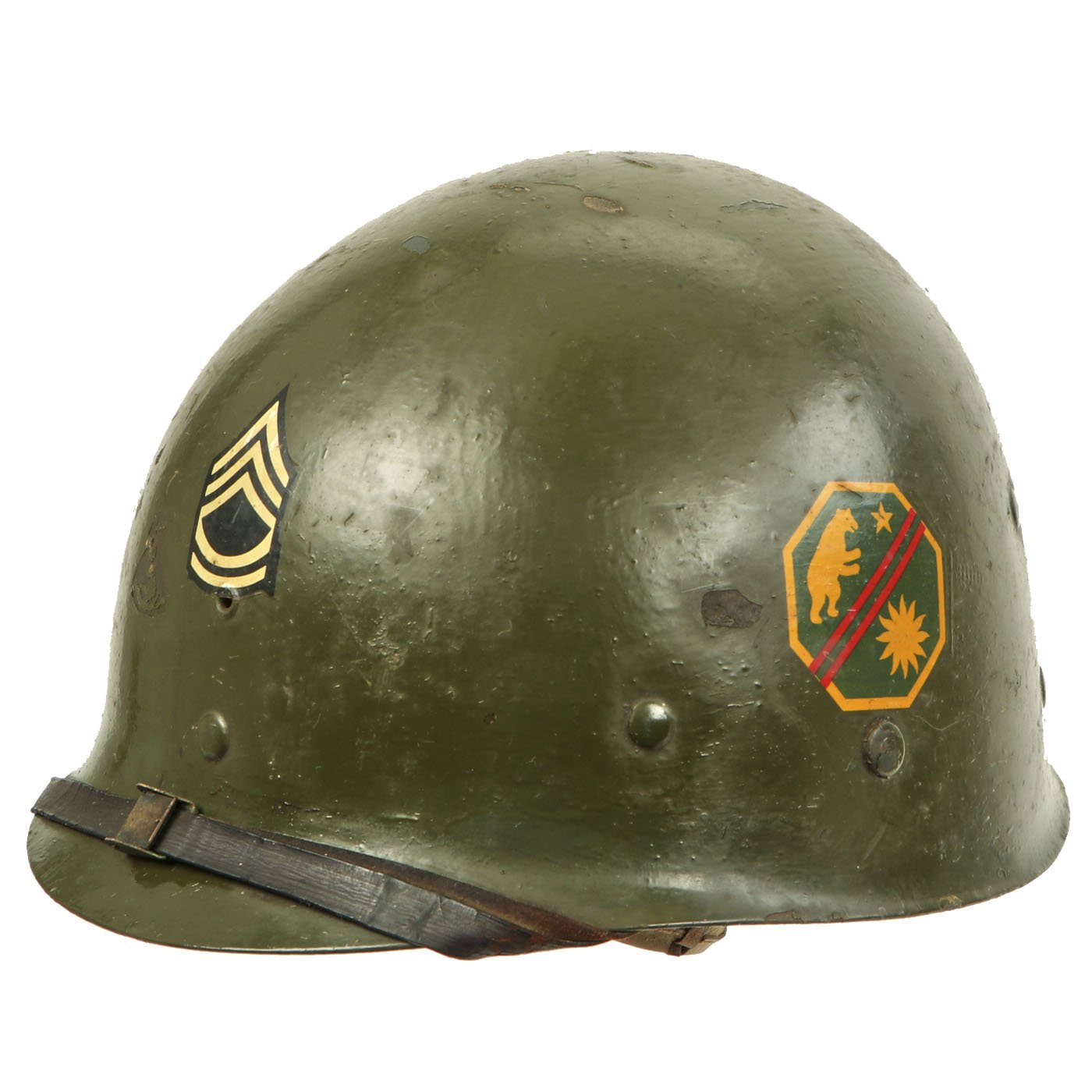 The liner is marked on both sides with the unit insignia of the Korean War Era California National Guard Reserve - 1st Division, which existed 1951-1963. This unit was originally known as the California Defense and Security Corps - 1st Security Zone during 1950-1951. Additionally, the front of the helmet has a Sergeant First Class insignia on the front. Helmet liners such as these were often worn during training, as the steel helmets were not required, an could be heavy and cumbersome at times.