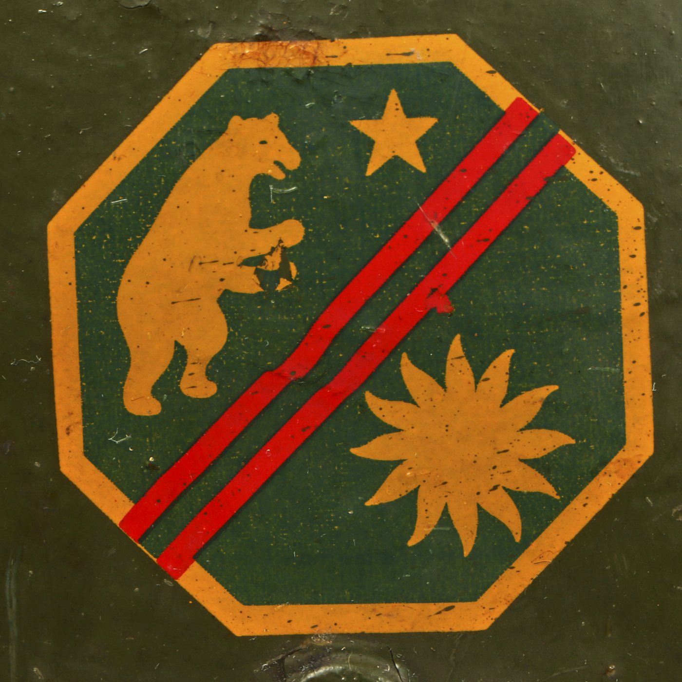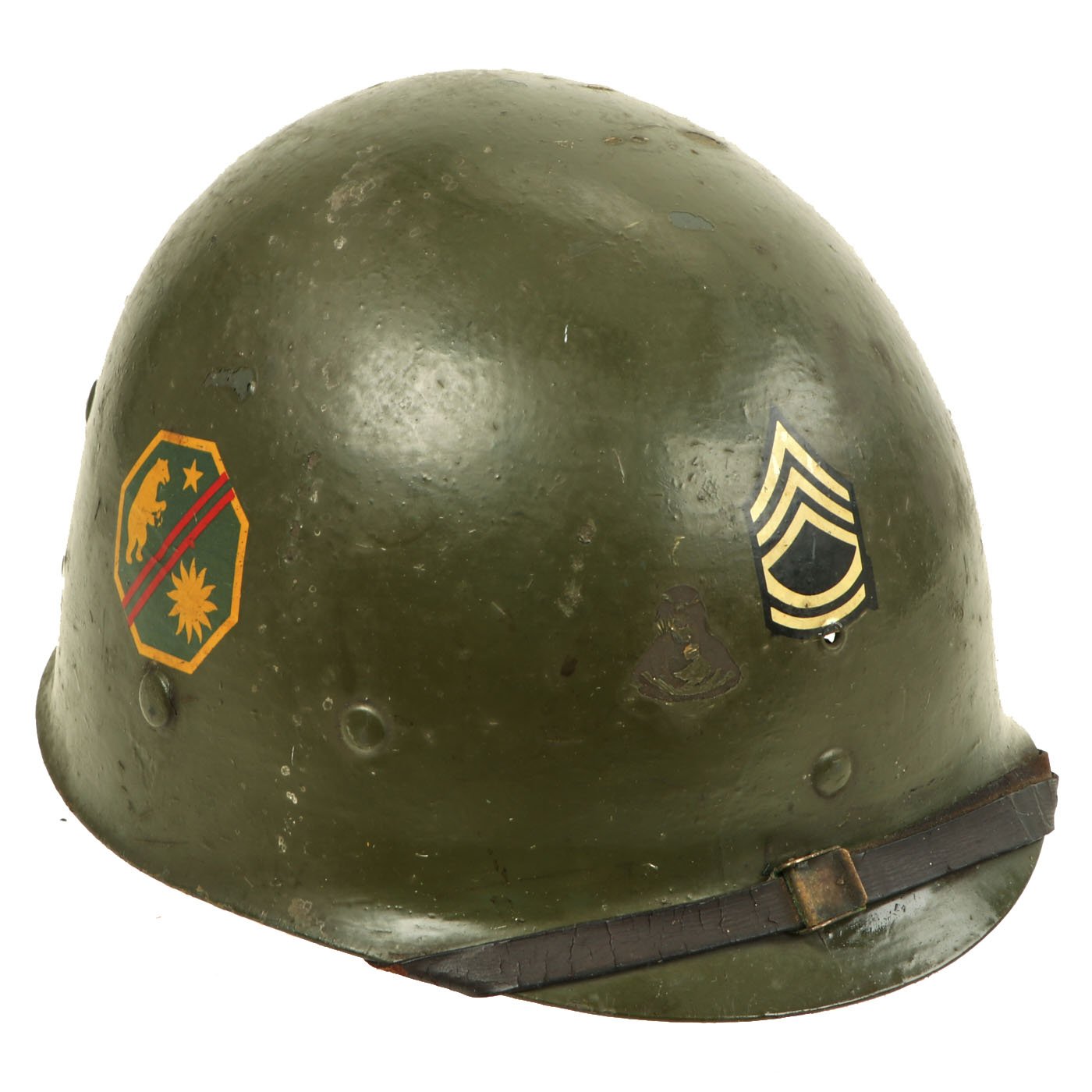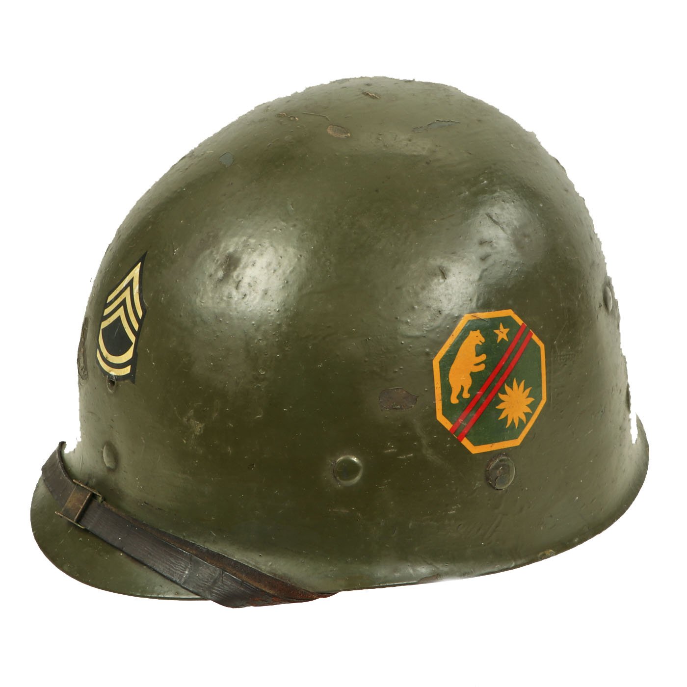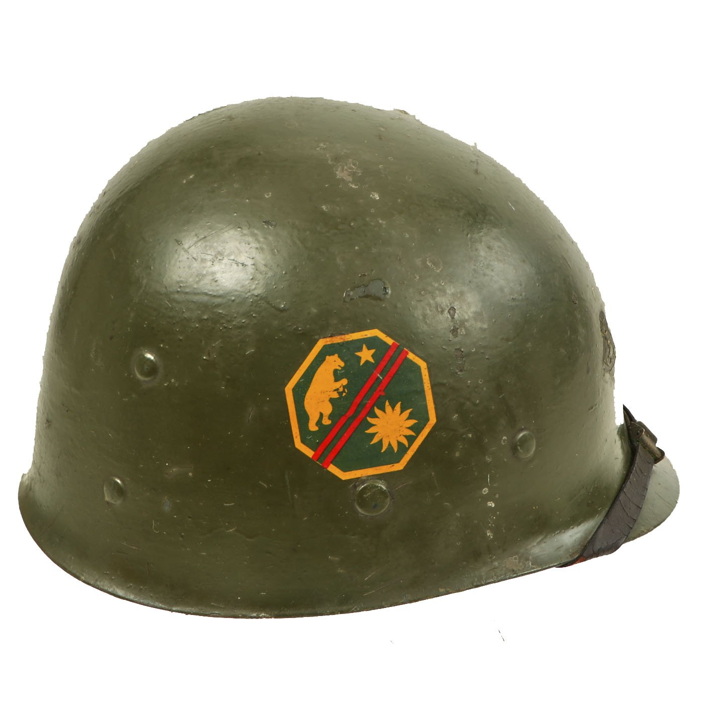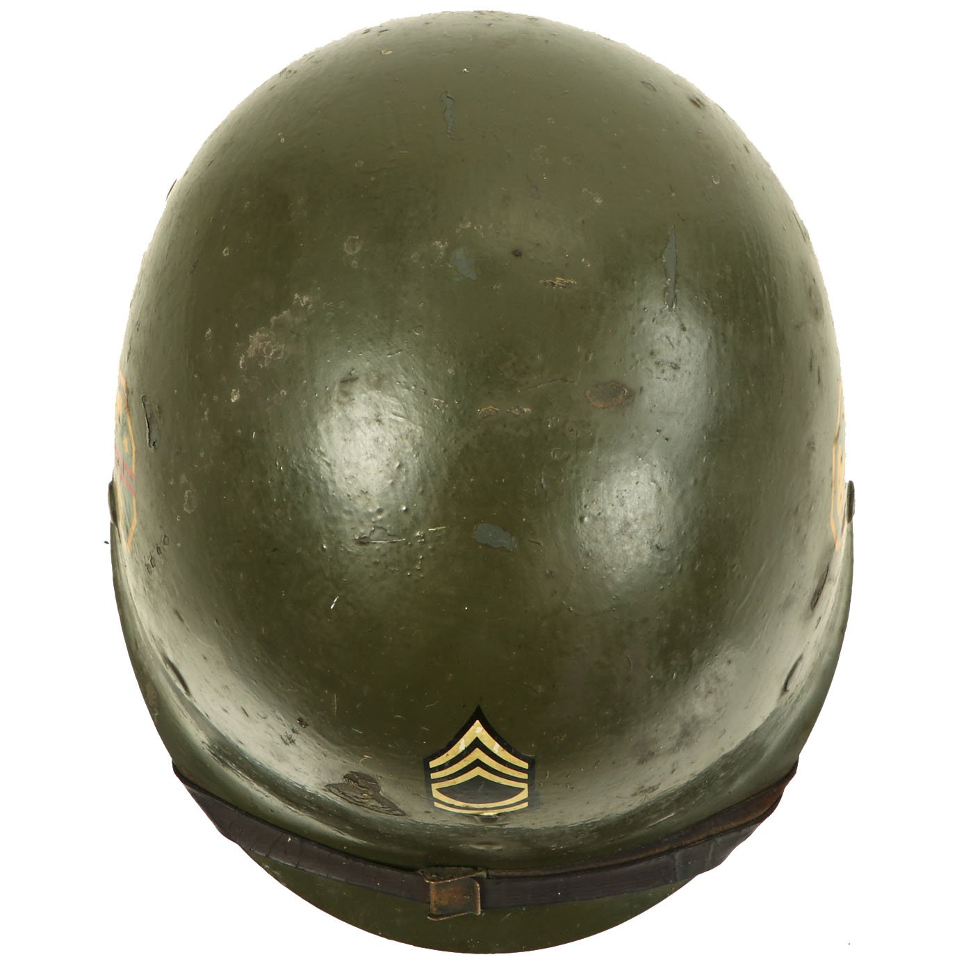 The liner is marked on both sides with the unit insignia of the Korean War Era California National Guard Reserve - 1st Division, which existed 1951-1963. This unit was originally known as the California Defense and Security Corps - 1st Security Zone during 1950-1951. Additionally, the front of the helmet has a Sergeant First Class insignia on the front. Helmet liners such as these were often worn during training, as the steel helmets were not required, an could be heavy and cumbersome at times.
