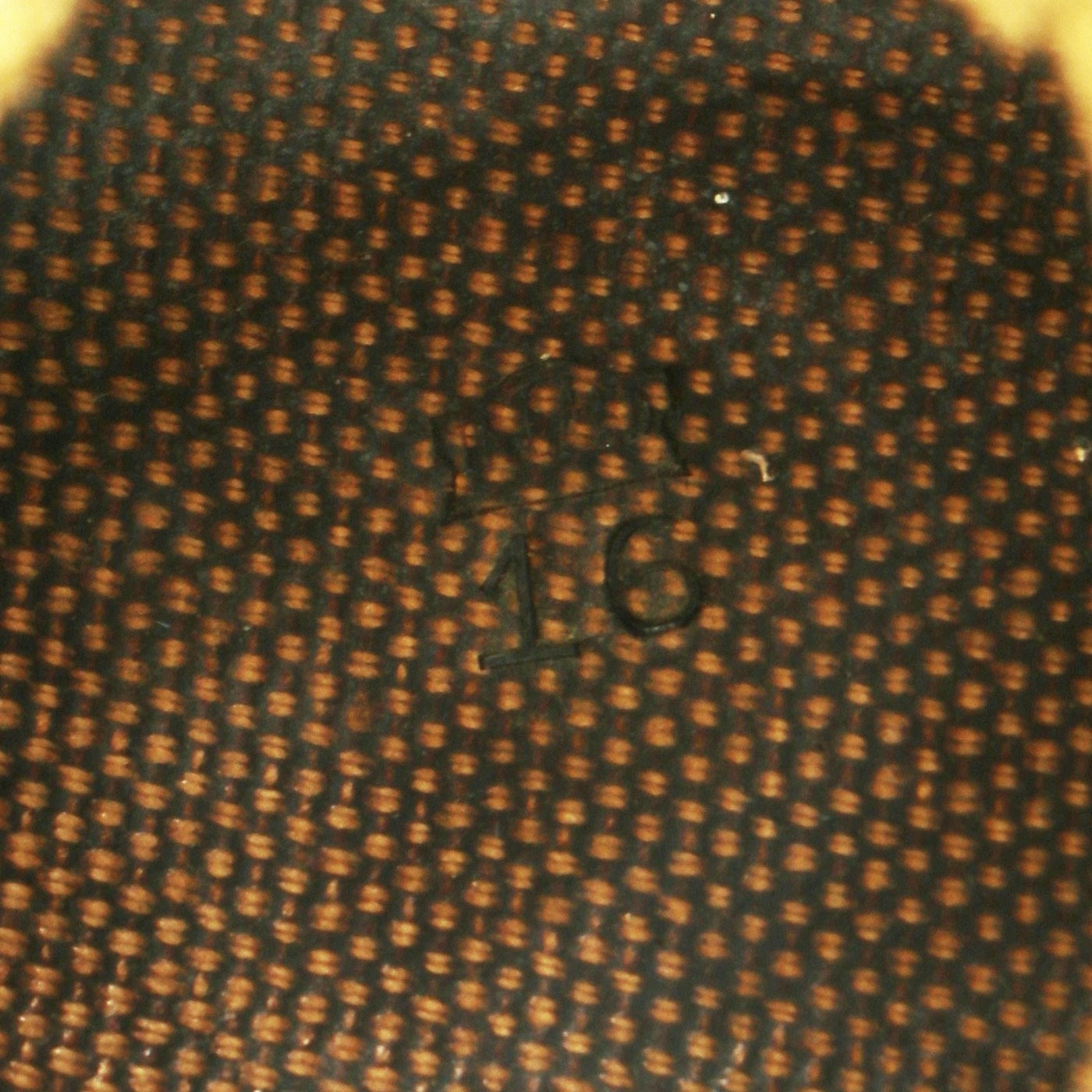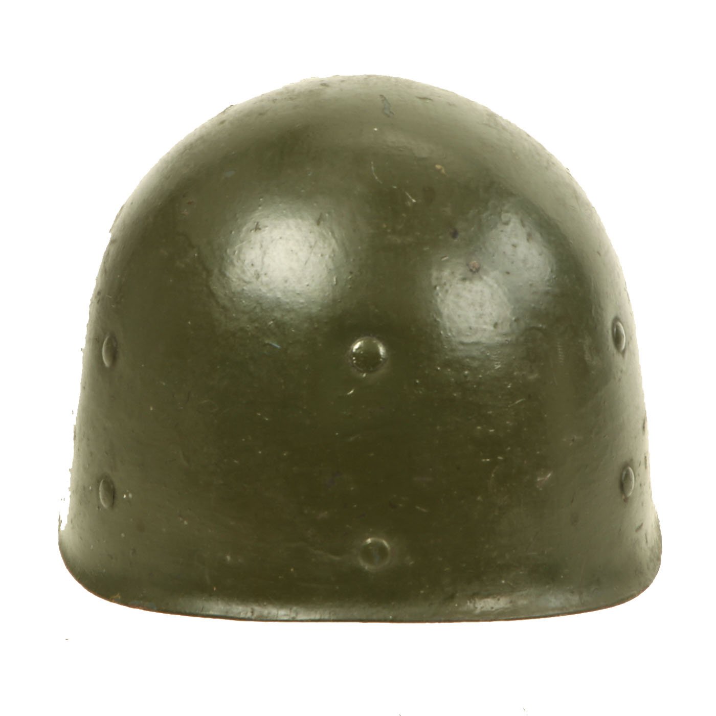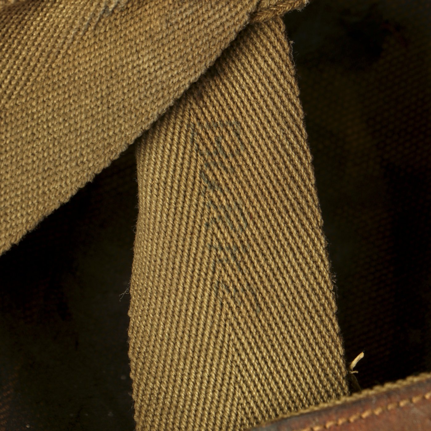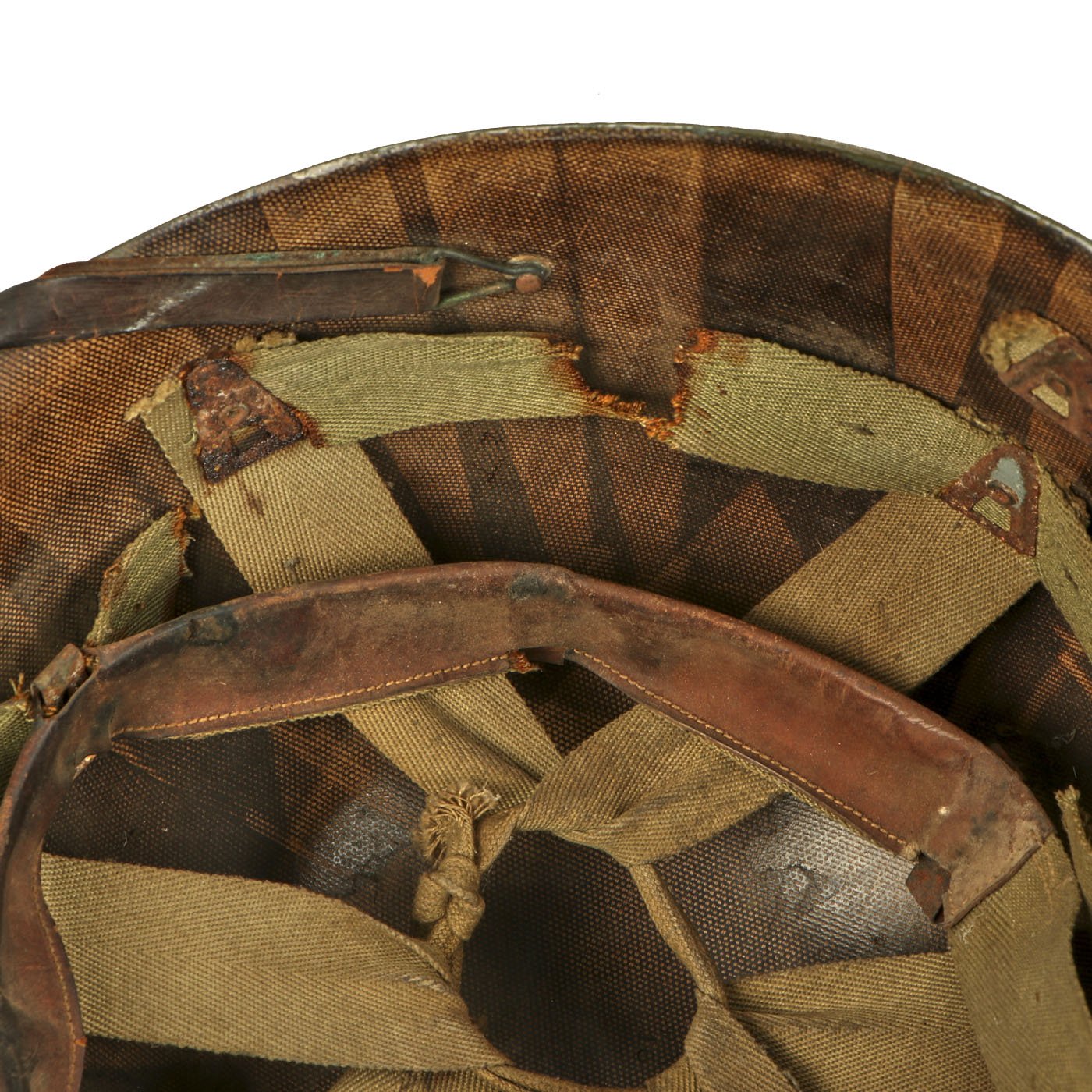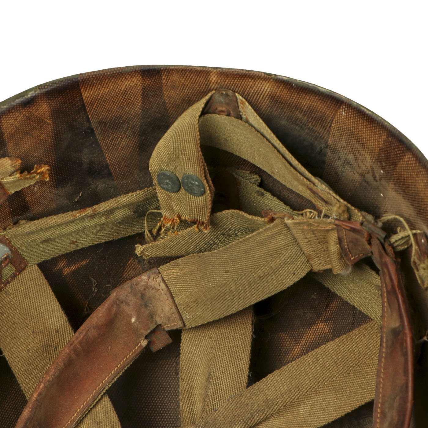 This true US WWII M-1 helmet liner be identified through the frontal eyelet hole, which has the rank insignia installed. Other correct WWII features include cotton OD Green #3 herringbone twill (HBT) cloth suspension liner, with the webbing in good condition with some tearing. This HBT suspension is held within the M-1 helmet liner by rivets and a series of triangular "A" washers, and the three upper suspension bands are joined together with the correct OD green string. This way the wearer could adjust the fit. The sweatband is complete, has torn through the rigging as shown. The shell chin strap is present, but has shrunken in place over the front visor.