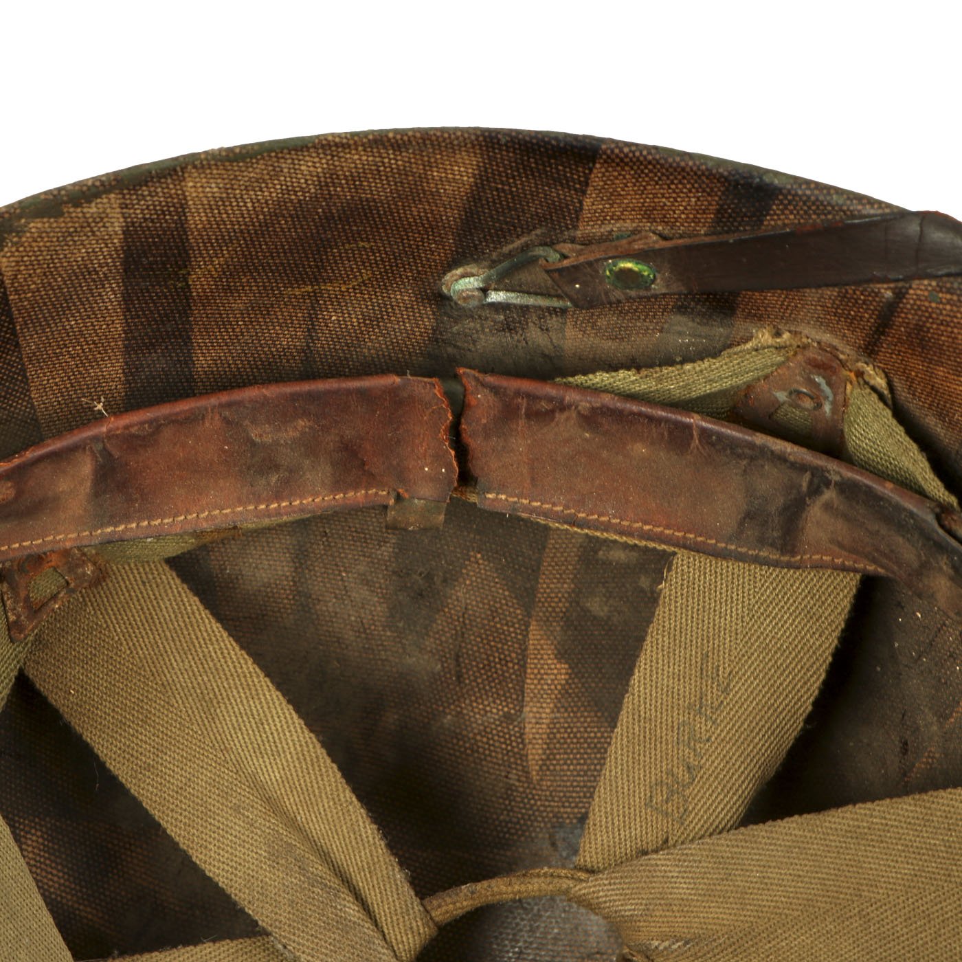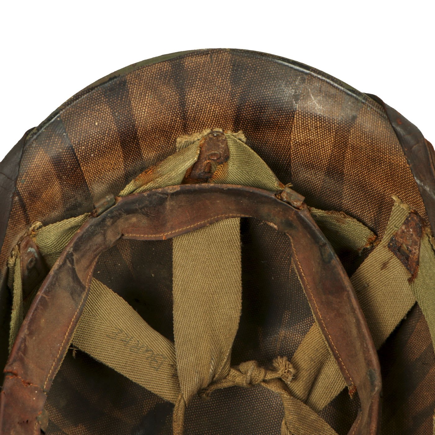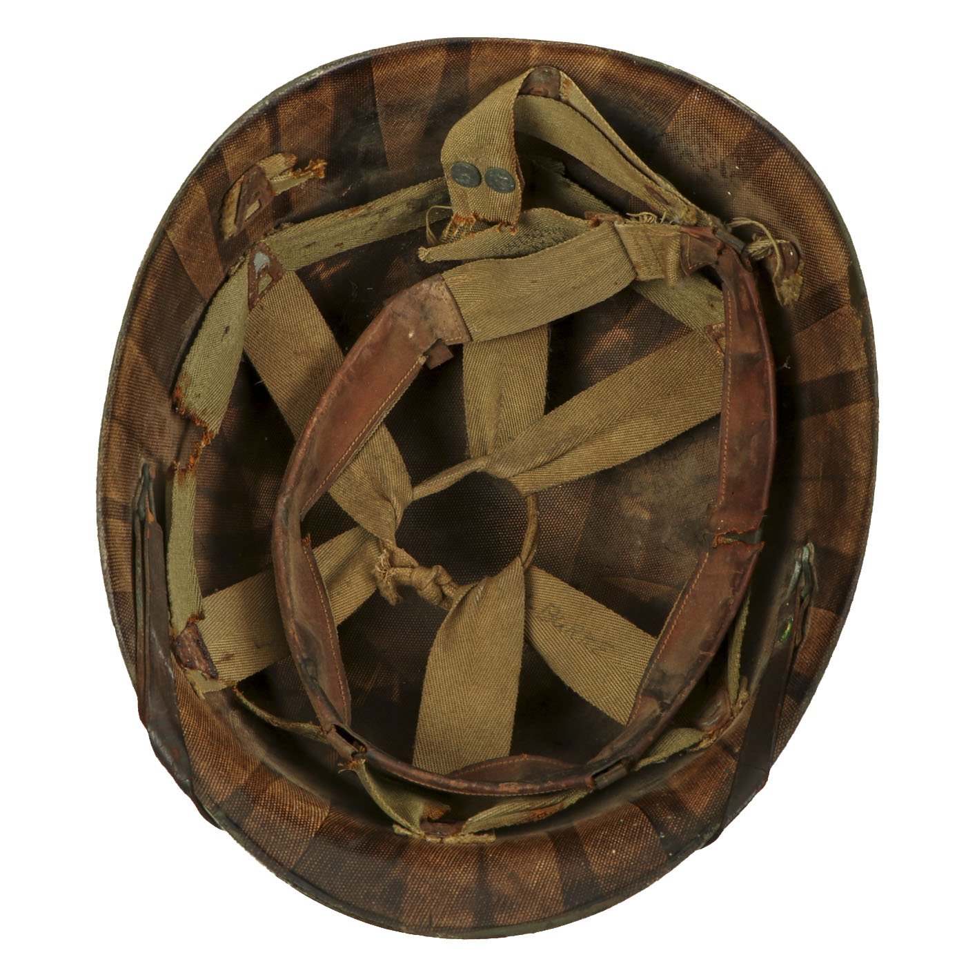 The liner is correct “high pressure” WWII issue with an INLAND logo over 16 inside the crown, for the Inland Manufacturing Division of General Motors. Inland started M-1 helmet liner delivery to the US Army in September 1942. They produced approximately 1,900,000 M-1 helmet liners and converted about 75,000 liners to airborne configuration. Inland Manufacturing discontinued M-1 helmet liner production in 1943 when their manufacturing services were deemed better used elsewhere.