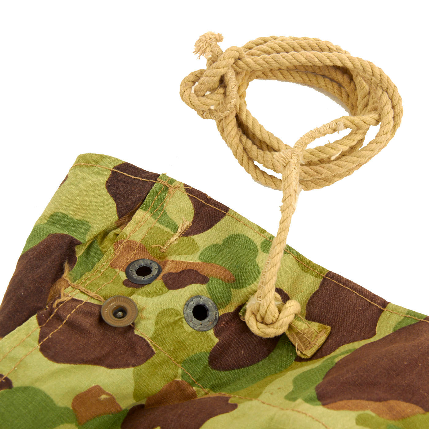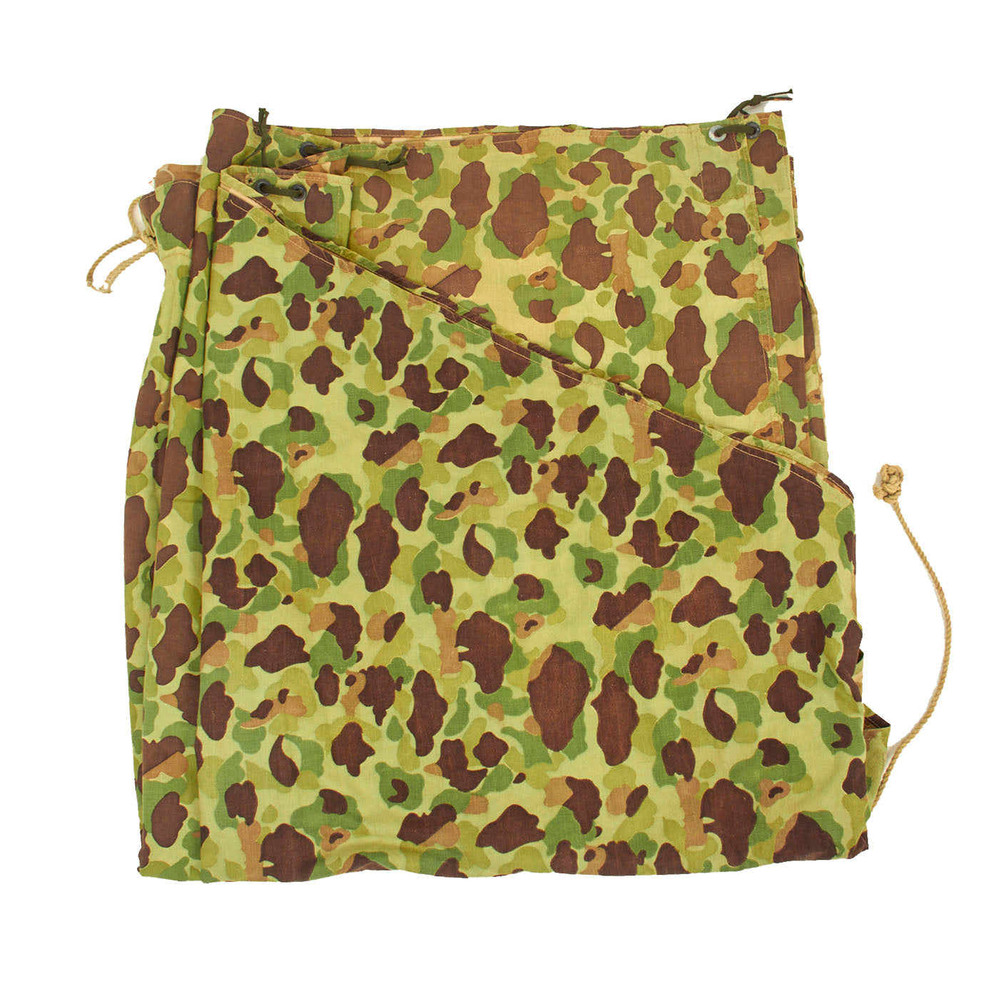 Original Item: Only One Available. The fundamental unit of shelter for the U.S. Army/Marine Corps in the field -- since the Civil War -- is the two-man pup tent. Each pup tent is made up of two shelter half pieces that fasten together with a row of buttons (up to late World War II) or snaps along the ridge line and, with poles, ropes and stakes, make up one pup tent. The buttons are matched to a row of button holes. The snaps are two sided. With either system, any pair of shelter half pieces can be fastened together with a watertight closure along the top line. The shelter half is approximately 7' long by 5' wide, double sided, rectangular panel with a pointed end on each side. Two Marines could button the sections together in order to make a tent. The colors are vibrant with minor staining to the fabric.