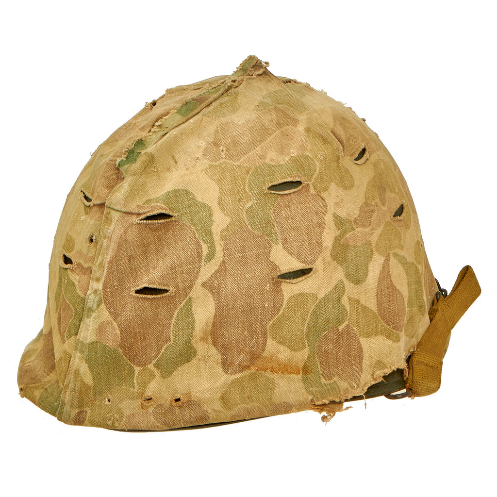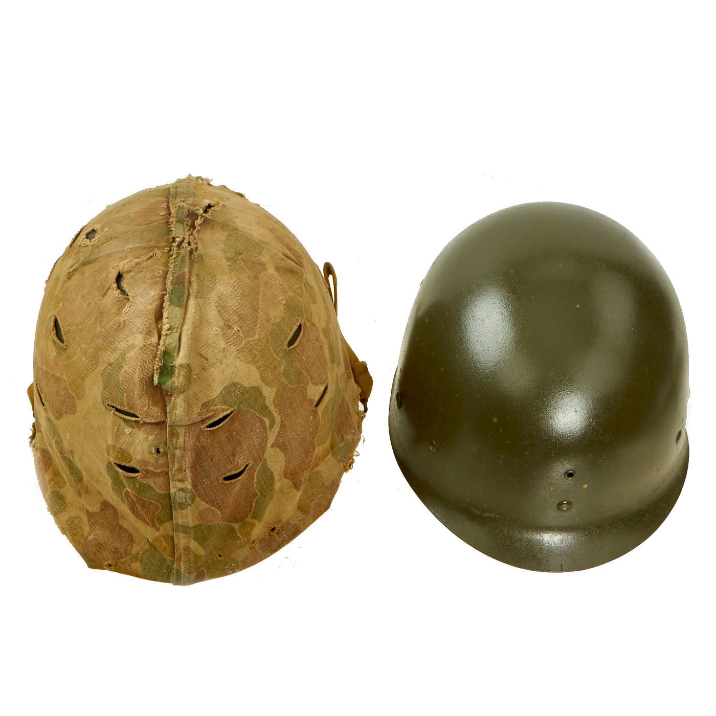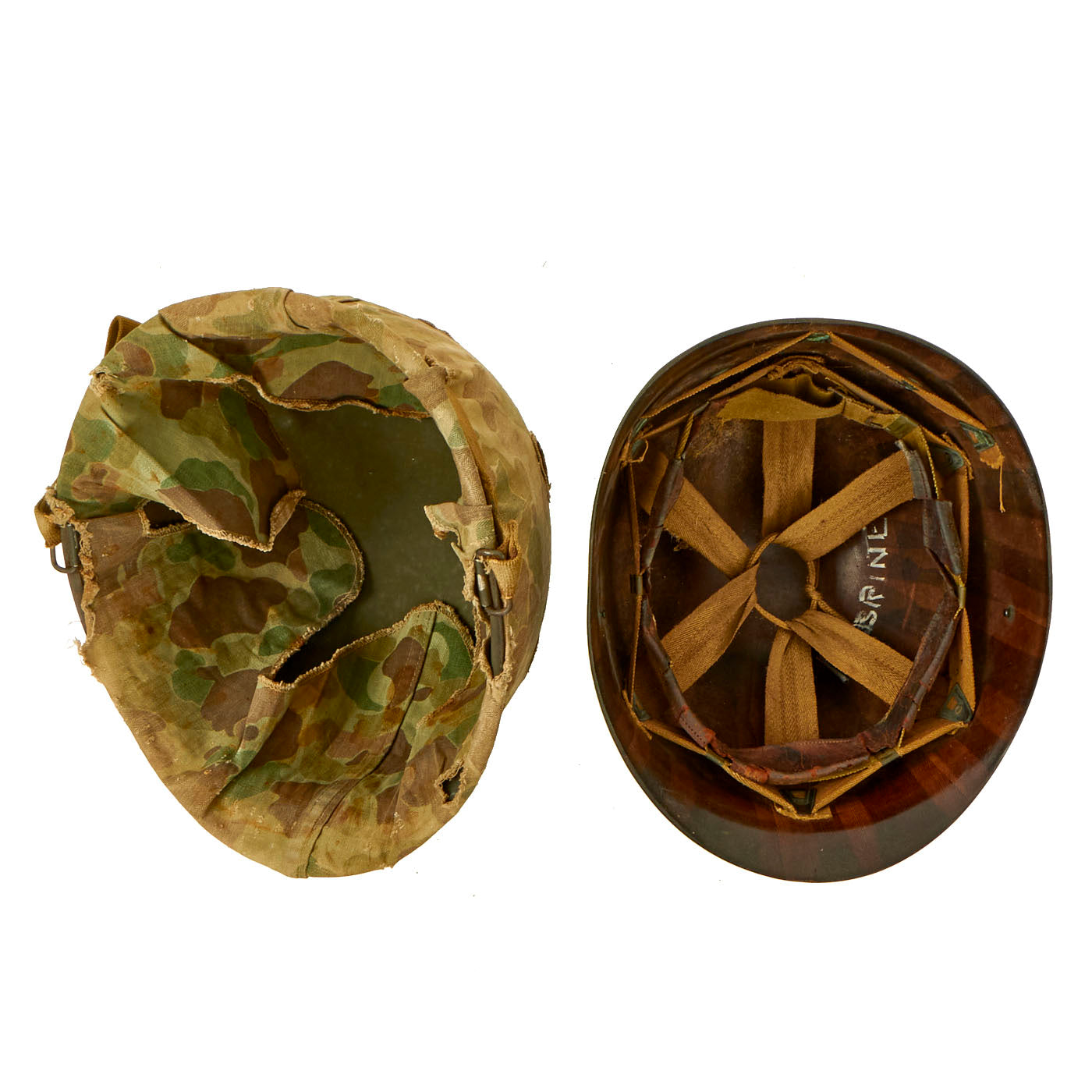 Original Item: Only One Available. This is a very nice example of a Korean War Era U.S. Marine Corps Issue M1 Helmet as used during the Korean War Era and into the early Vietnam Conflict. The shell is a late WWII Produced M1 Helmet, with a rear seam swivel bale made by McCord, heat stamp indicating early 1945 production. The Helmet comes with an excellent, service worn condition U.S. Marine Corps Reversible Camouflage Cover by Blue Anchor Coveralls and dated 1953. The helmet is complete with a late issue, WWII / Korean War Era, "High Pressure" Firestone liner with a lovely worn leather sweatband that does have cracking present as well as stitching loss. The complete set is in lovely, service used condition, it does show signs of honest wear, storage age, and handling over the decades.