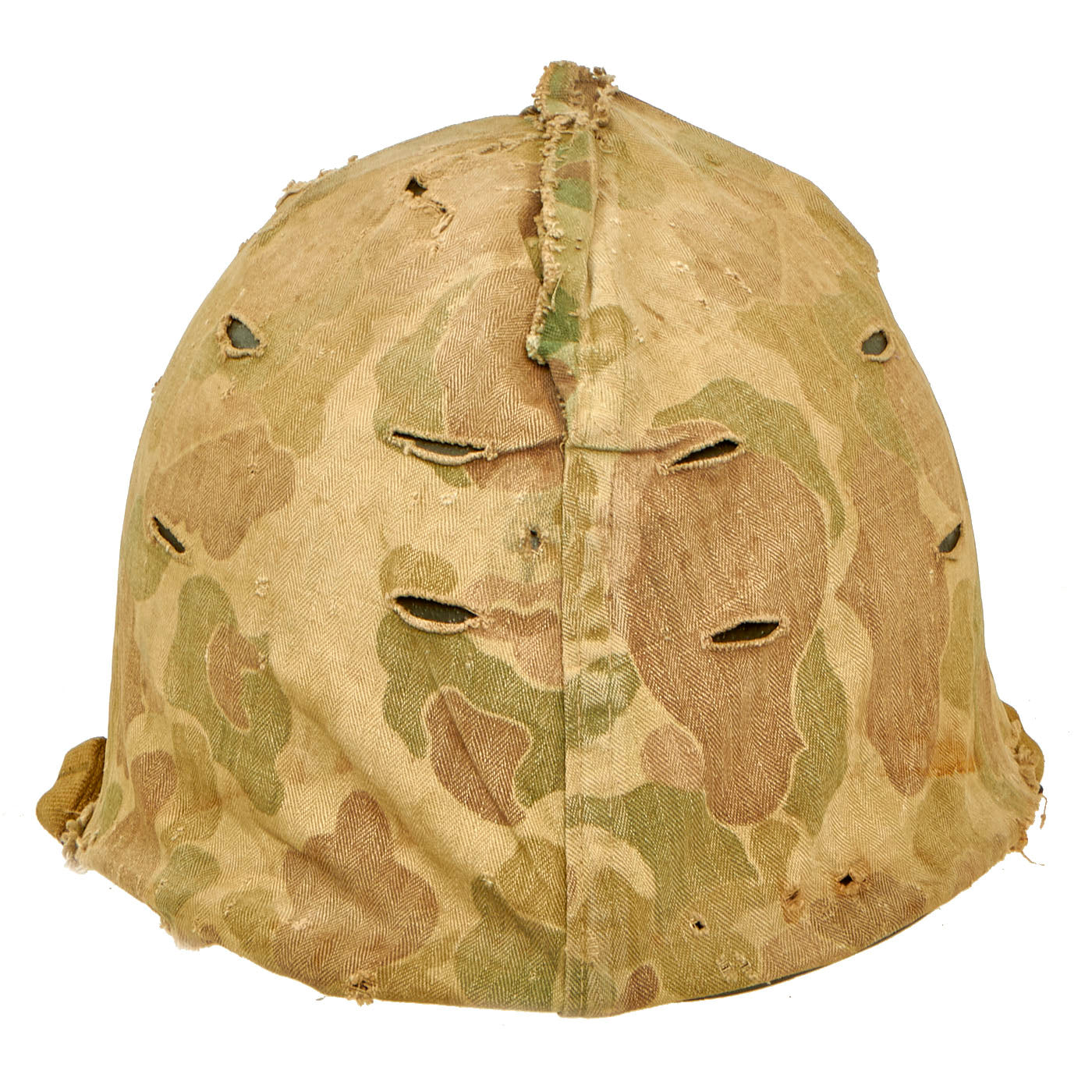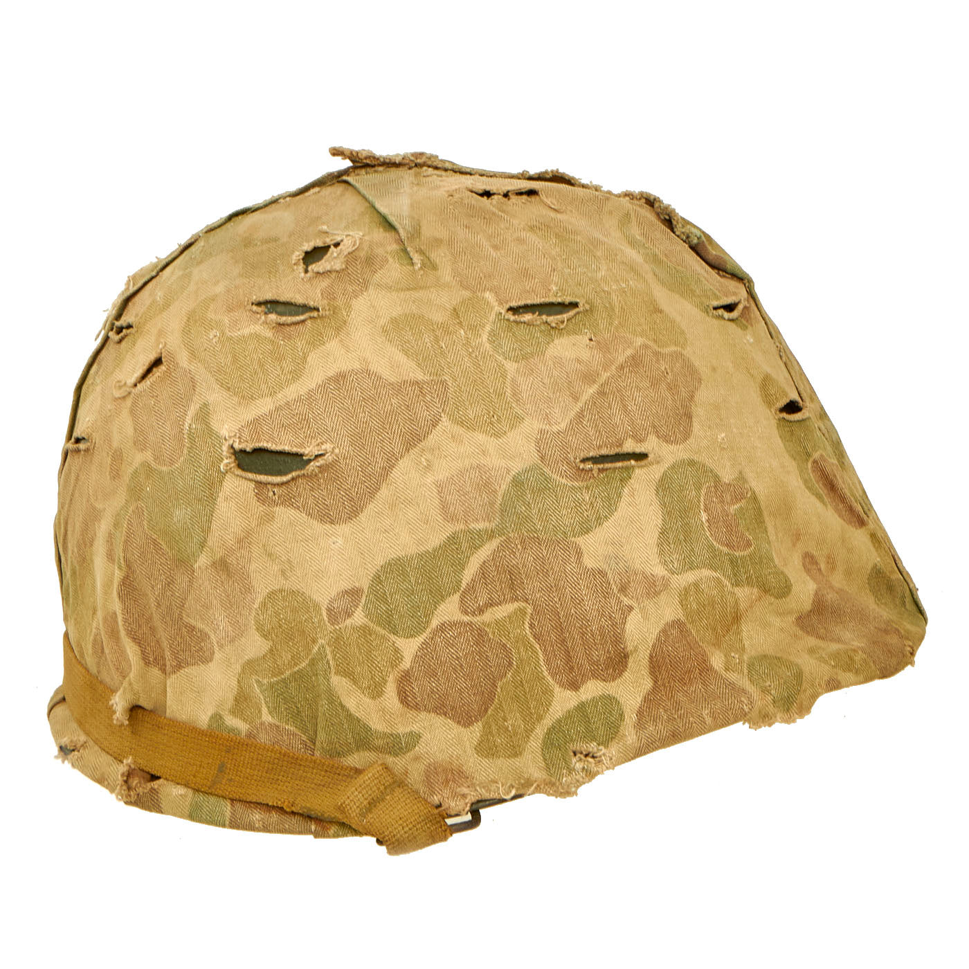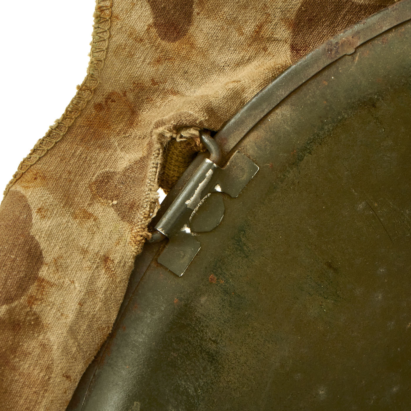 Original Item: Only One Available. This is a very nice example of a Korean War Era U.S. Marine Corps Issue M1 Helmet as used during the Korean War Era and into the early Vietnam Conflict. The shell is a late WWII Produced M1 Helmet, with a rear seam swivel bale made by McCord, heat stamp indicating early 1945 production. The Helmet comes with an excellent, service worn condition U.S. Marine Corps Reversible Camouflage Cover by Blue Anchor Coveralls and dated 1953. The helmet is complete with a late issue, WWII / Korean War Era, "High Pressure" Firestone liner with a lovely worn leather sweatband that does have cracking present as well as stitching loss. The complete set is in lovely, service used condition, it does show signs of honest wear, storage age, and handling over the decades.