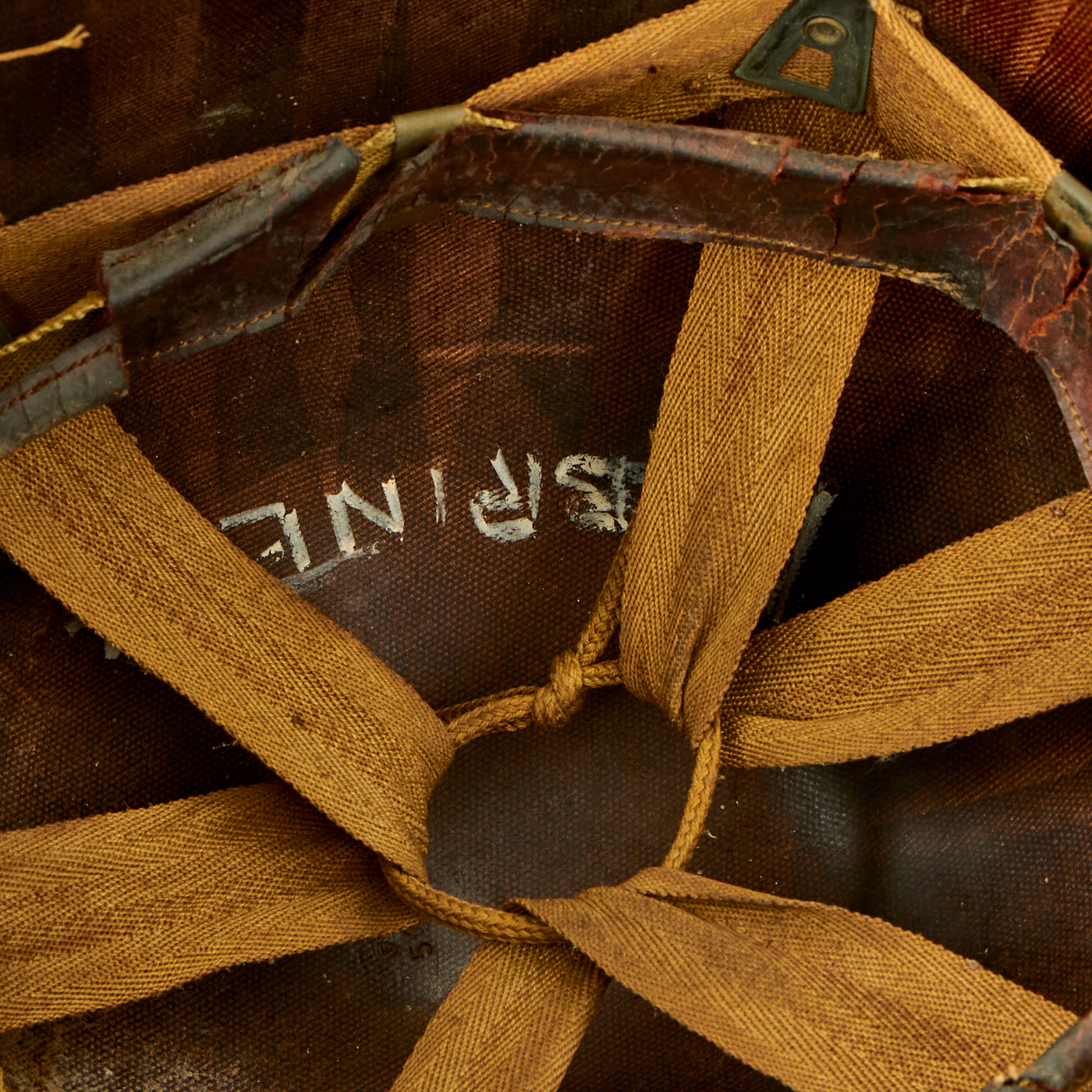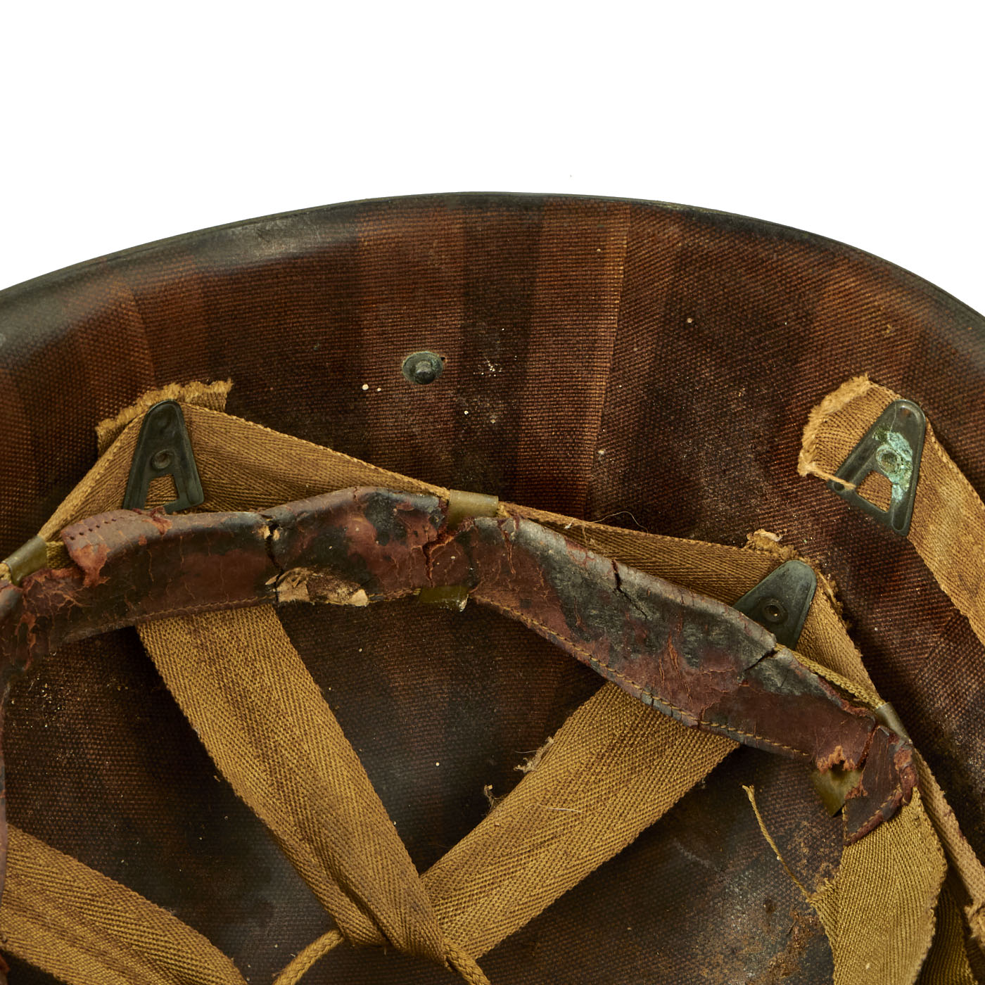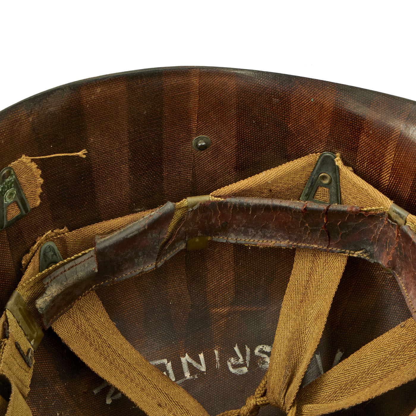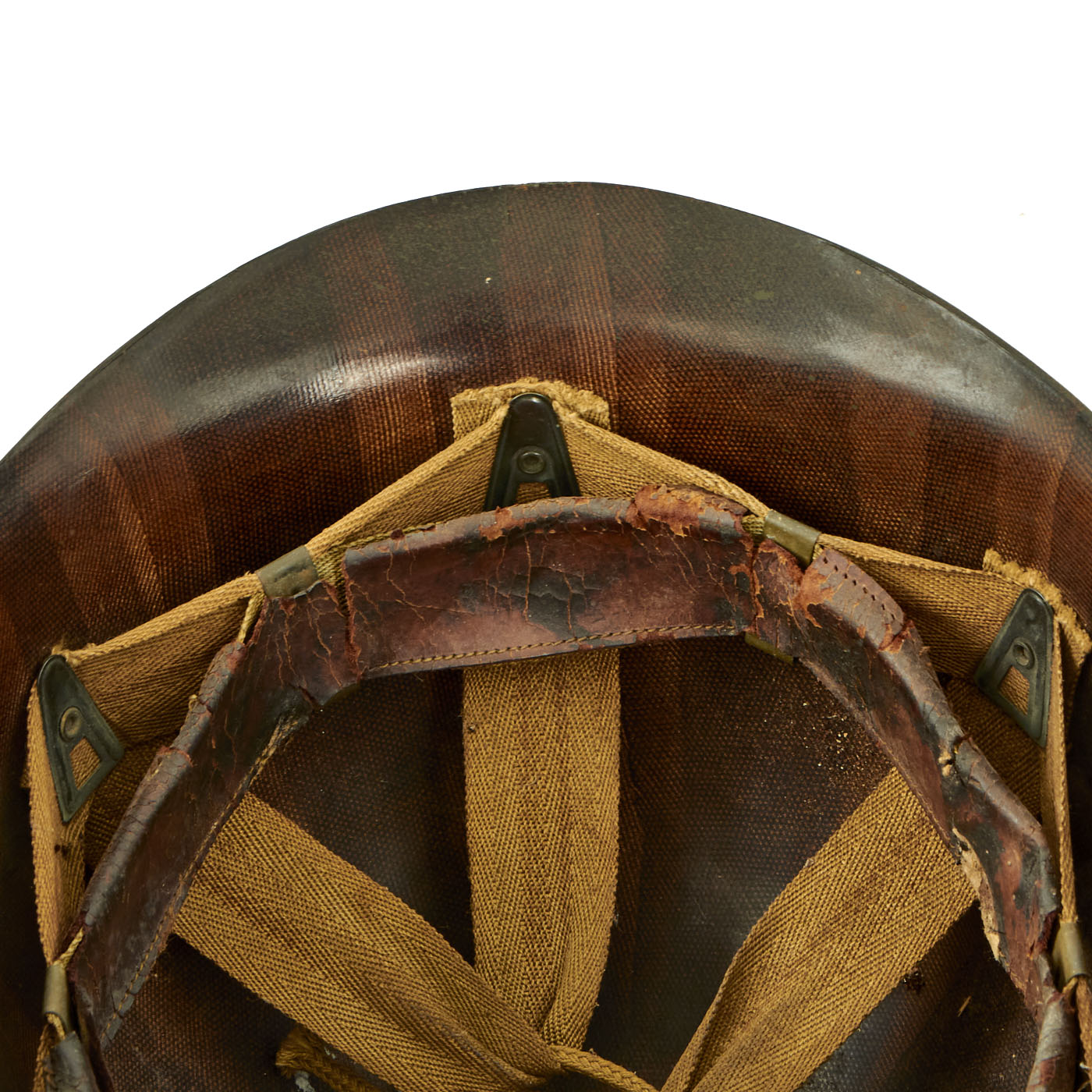 The liner exhibits an excellent amount of original paint, with worn Olive Drab Webbing secured by “A”-Washers with 1 missing. The nape strap is not present.