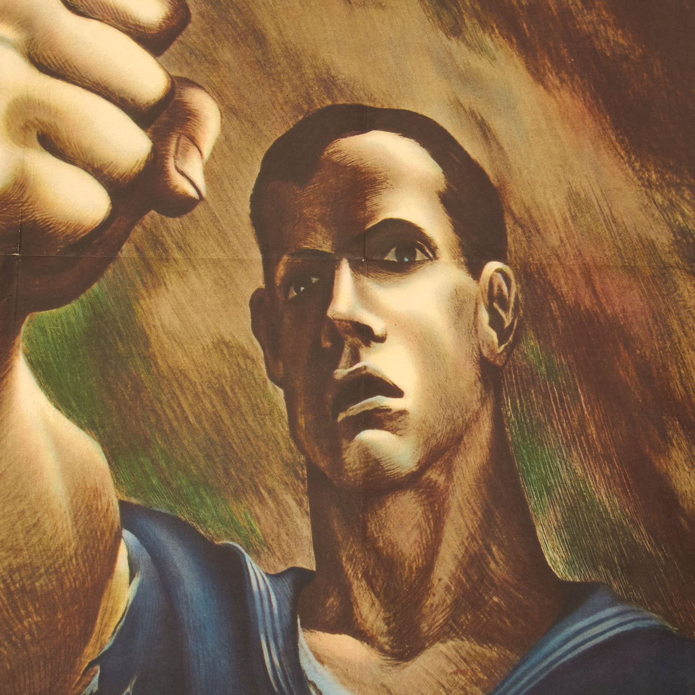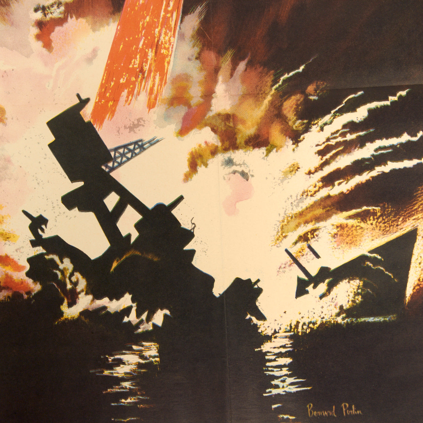 Original Item: Only One Available. "AVENGE DECEMBER 7" A dramatic World War II poster by Bernard Perlin. Washington, D.C. Office of War Information, 1942. Original full-color poster measuring 28 x 40 inches. This moving image depicts a sailor with his fist raised, standing above a scene of an exploding battleship, with the words "Avenge December 7" in red across the middle of the poster. With America's entrance into WWII after Pearl Harbor, the Office of War Information quickly coordinated efforts to generate support for the war effort. This striking image on OWI "Poster No. 15," memorializing the events of December 7, 1941, was painted by Virginia-born artist Bernard Perlin, a Guggenheim fellow and respected painter who was a well-known illustrator for Life and Fortune.