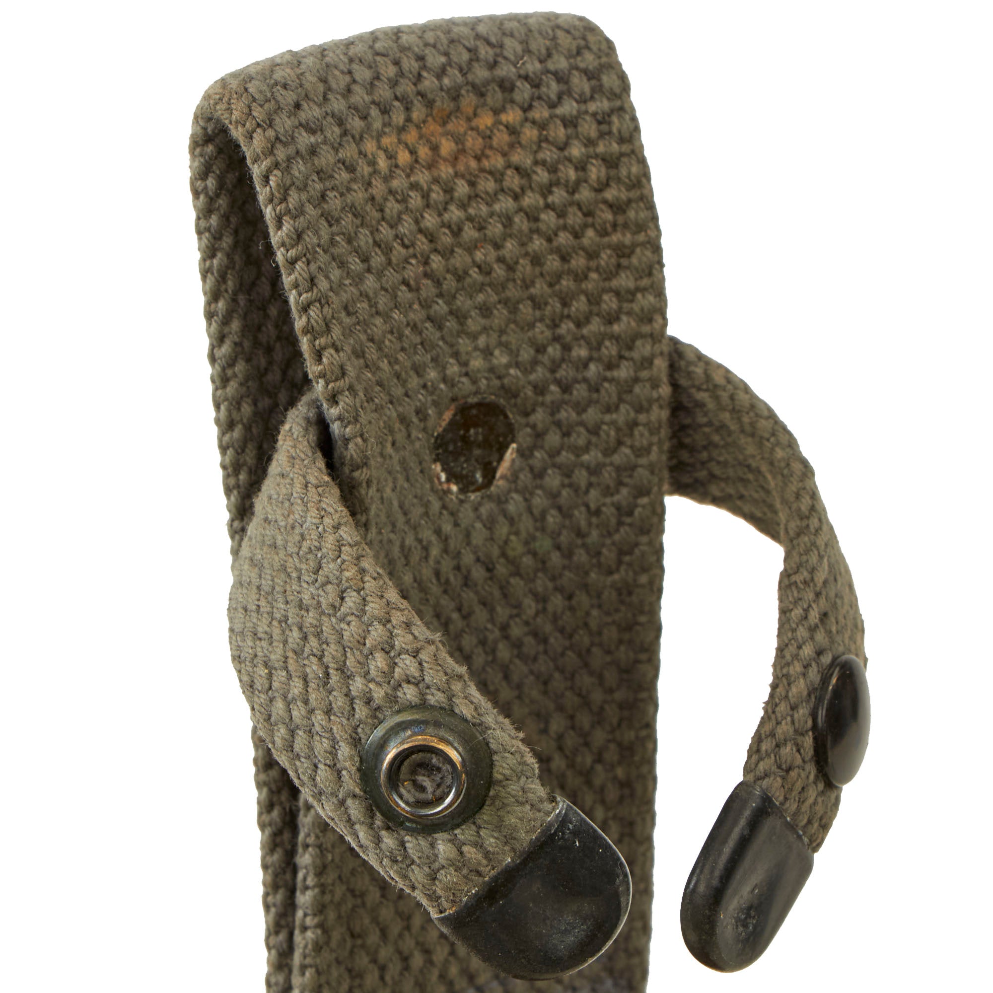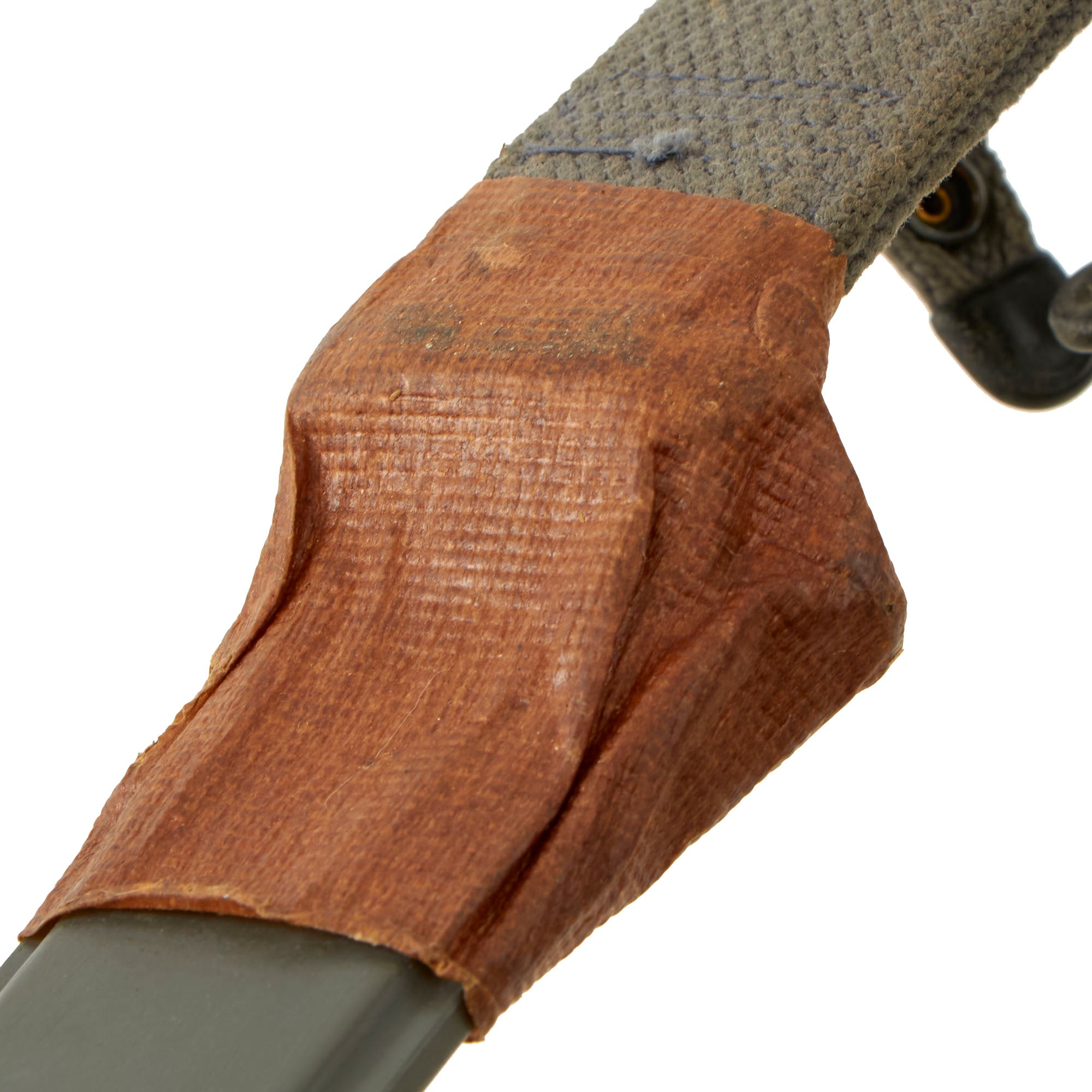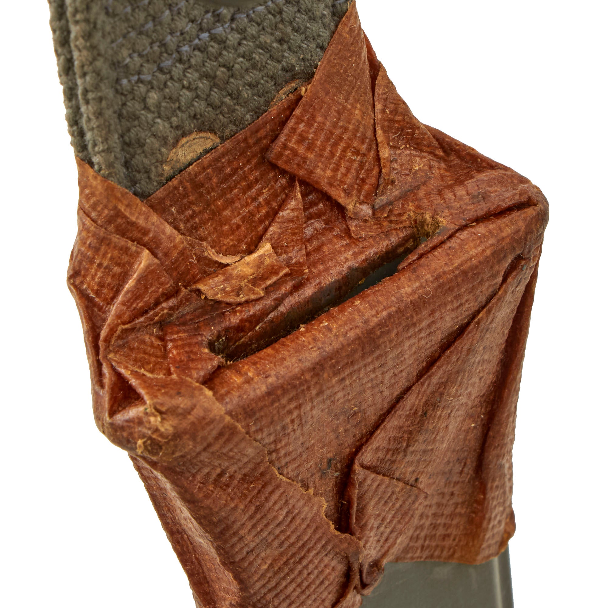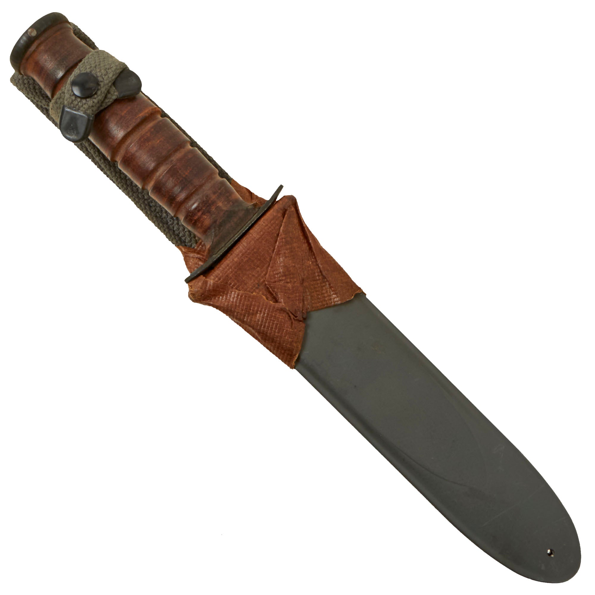 The scabbard is the Navy Mk2 version, very similar in construction to the M8 scabbard for the M3 fighting knife, with a thermoplastic impregnated cotton fabric body, metal throat, and canvas frog and securing strap. This example still has some of the original packaging wrap around the scabbard throat and belt loop. It is near flawless. Due to the wrapping, we can’t see if the back has the markings.