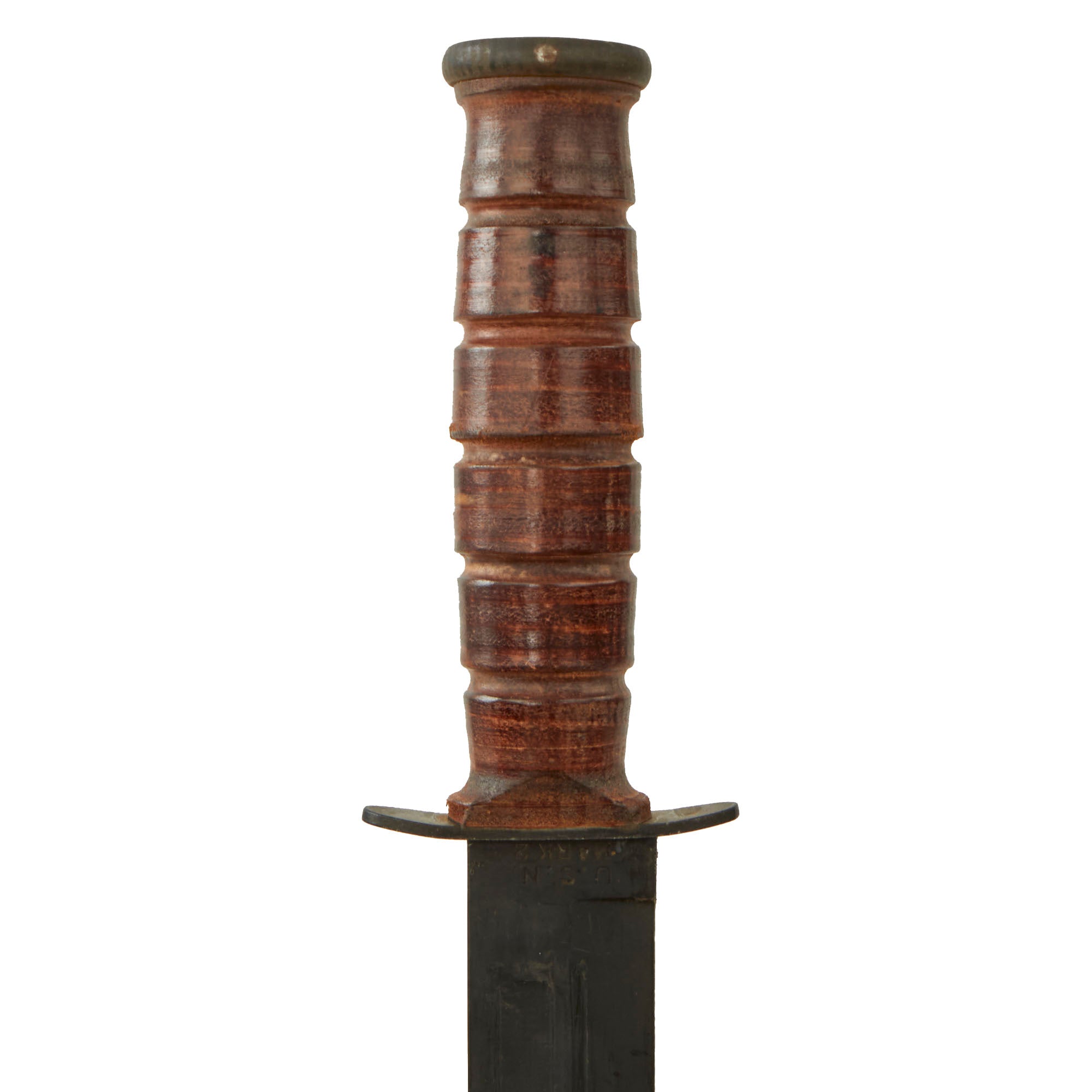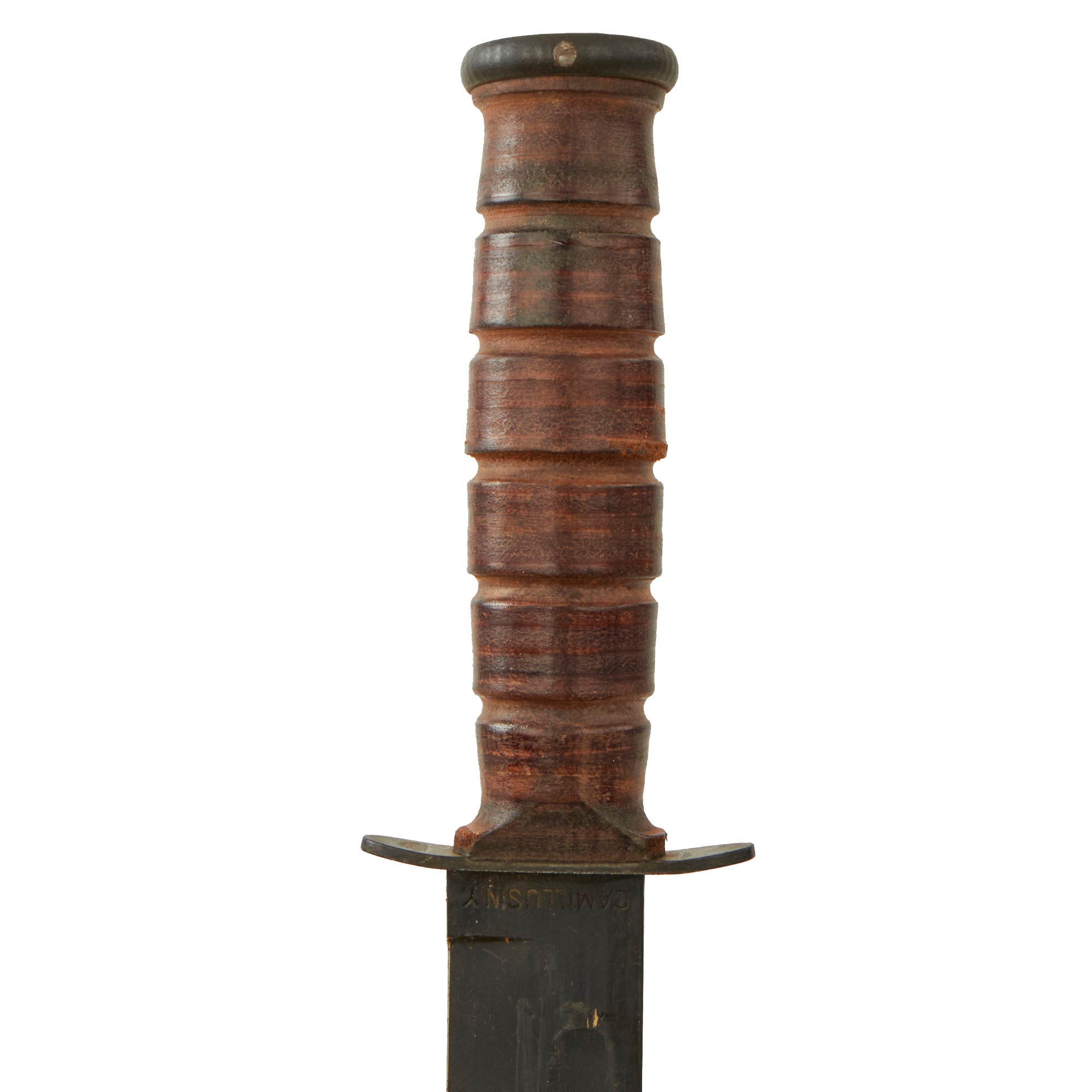 Working with Union Cutlery, USMC Colonel John M. Davis and Major Howard E. America contributed several important changes, including a longer, stronger blade, the introduction of a small fuller to lighten the blade, a peened pommel (later replaced by a pinned pommel), a straight (later, slightly curved) steel crossguard, and a stacked leather handle for better grip.