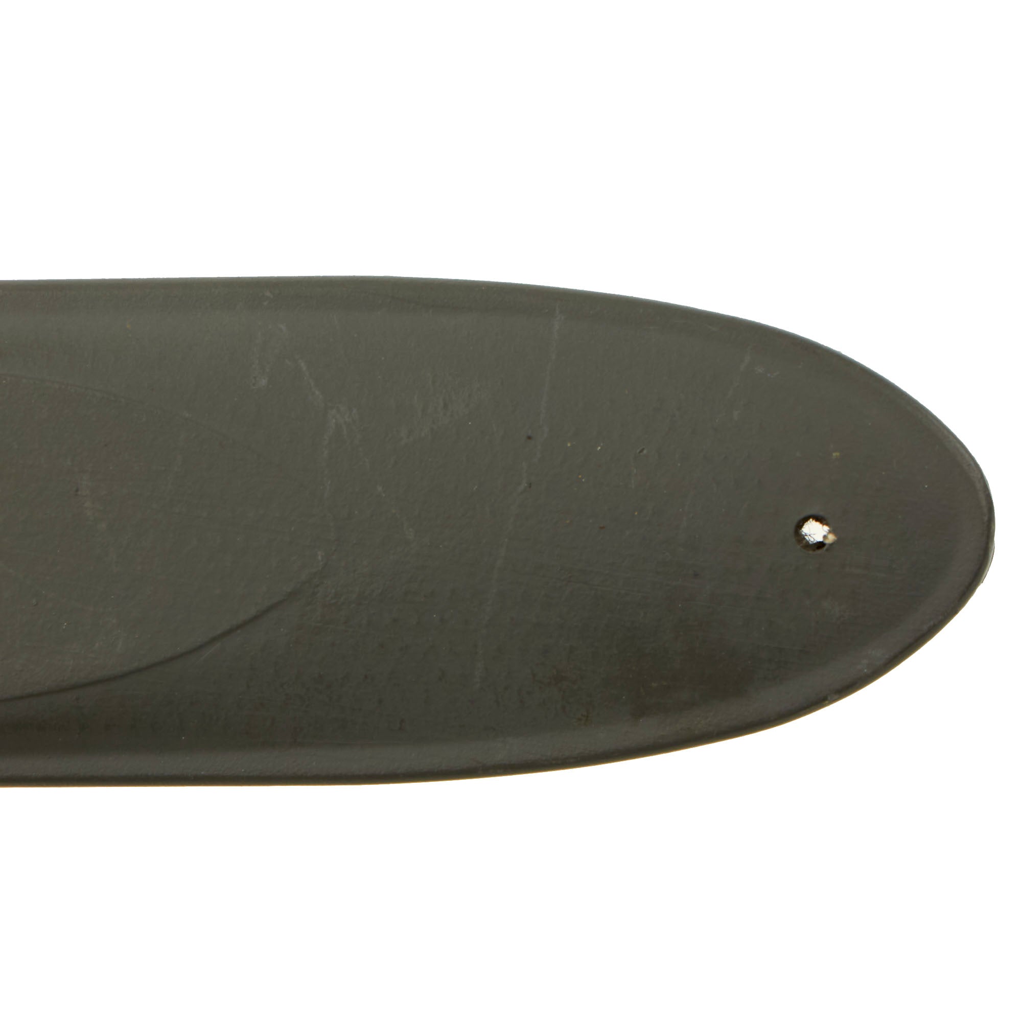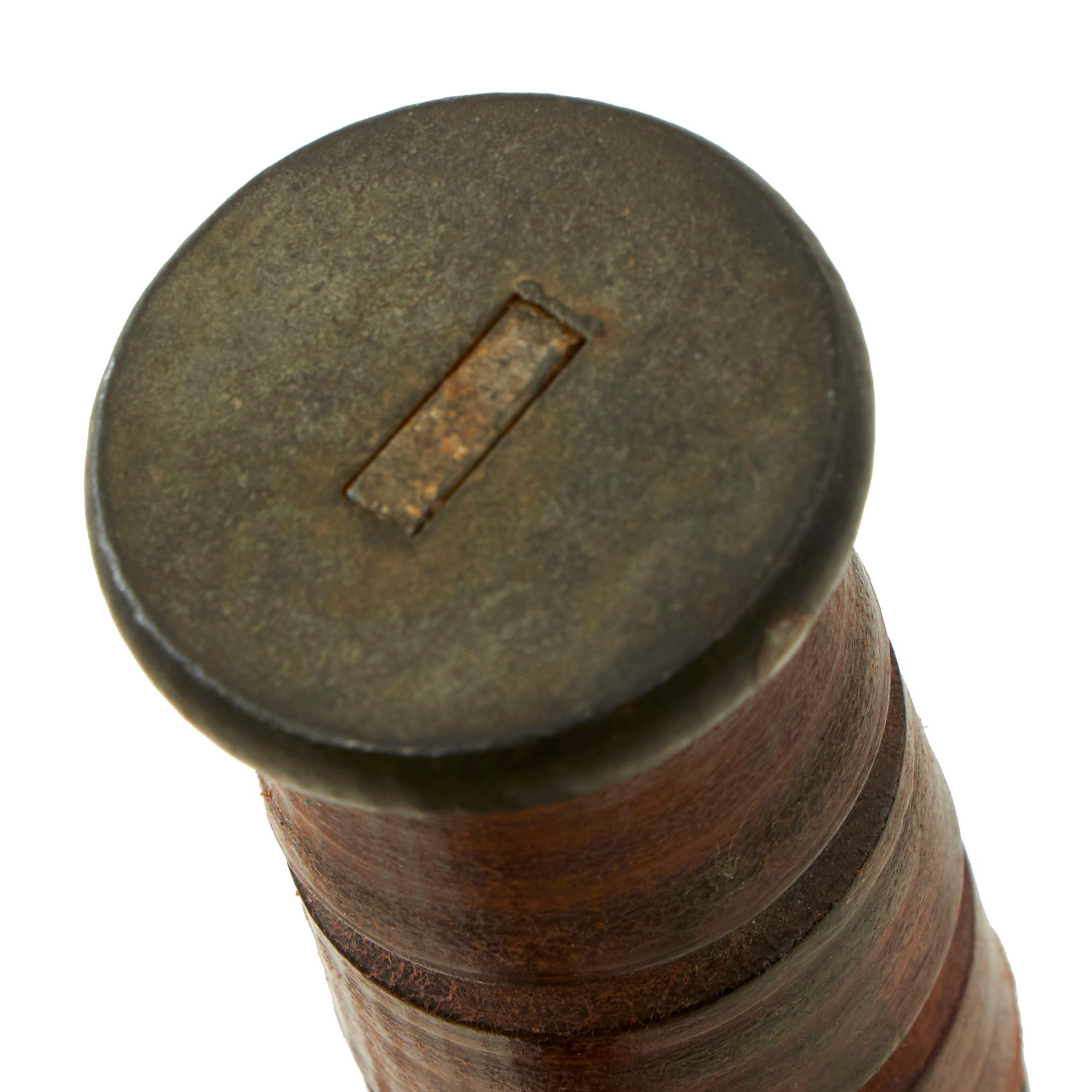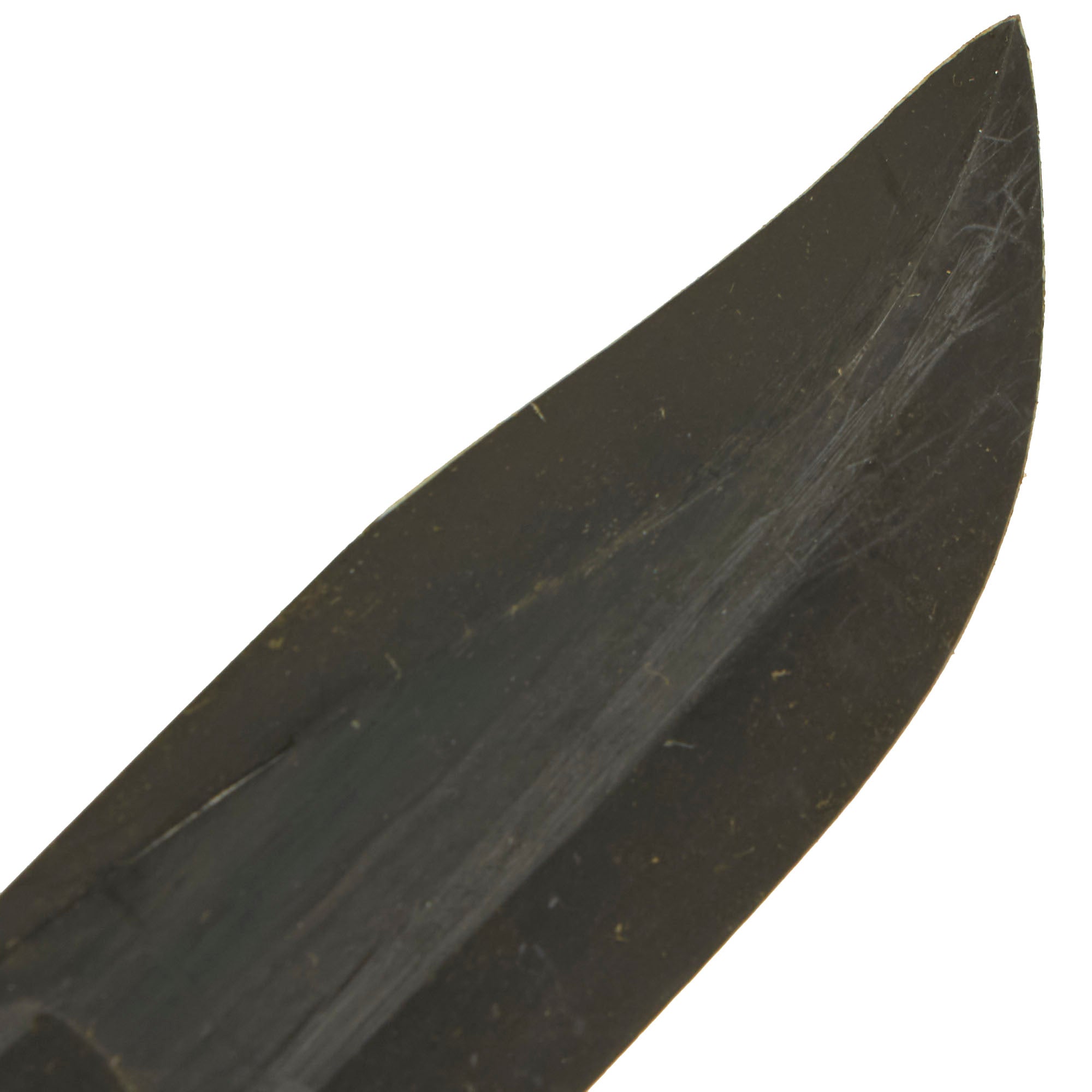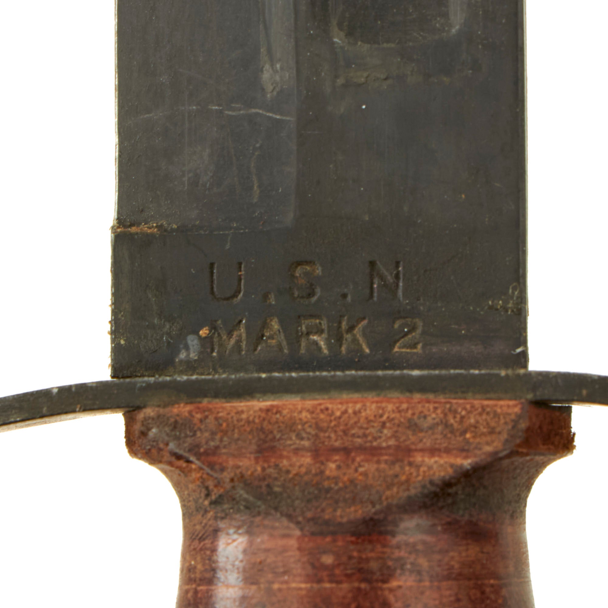 In 1944, the US Navy put through a change order to have the markings moved from the blade to the cross guard, so this knife was produced before that change. The cross guard is slightly curved back, as on the mid war issue knives. It features original leather washer grip, which is in great shape with no cracks or splitting. It also does not have much wear, just a bit of rounding, indicating this knife did not see much use. Over 80% of the original blade finish is still present, with just in and out wear from the scabbard and some edge wear. It has a heavy steel pommel with cross pinned tang. The blade is in very good to excellent condition, and is still somewhat sharp, with just a bit of post factory sharpening. Just a few small edge dents, which would easily sharpen out.