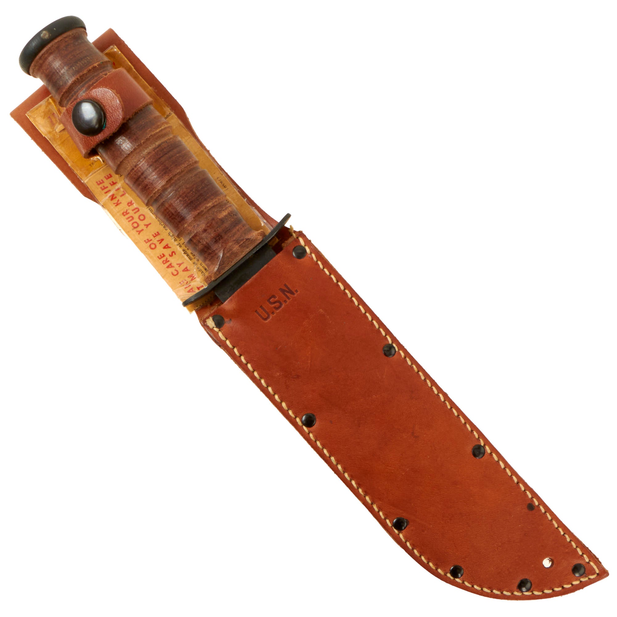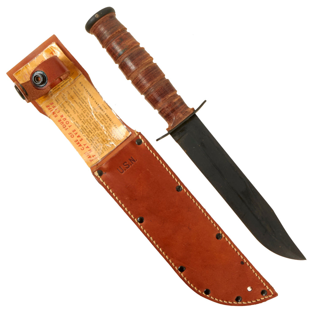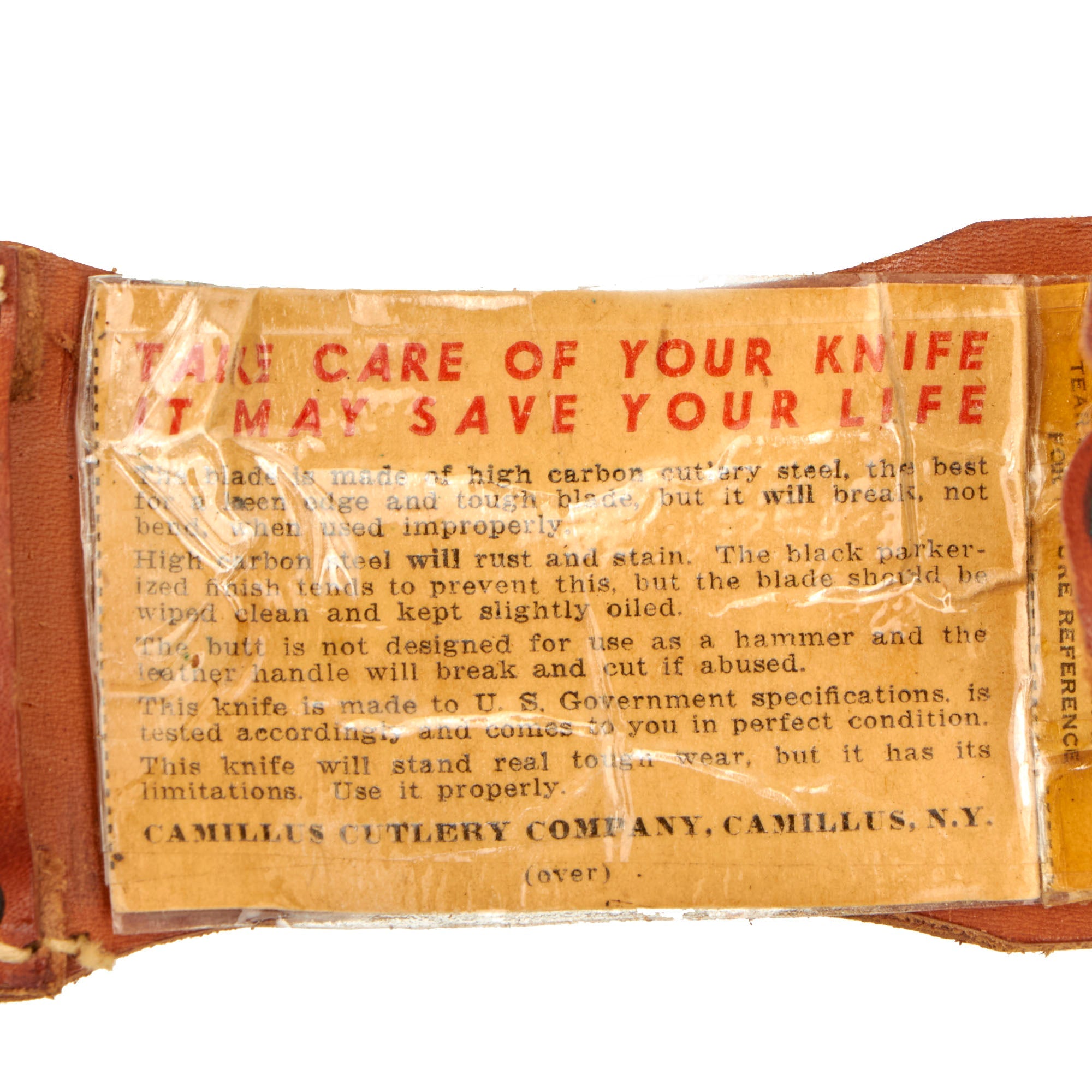 Original Item: Only One Available. This is a great example of the legendary WWII Production USN Mark 2 "Ka-Bar" fighting knife with a leather scabbard. Overall length of this Mk2 is 12 inches, with a 7 inch clip-point blade. Of particular note is an original paper Camillus Cutlery Kabar “Care Card”.