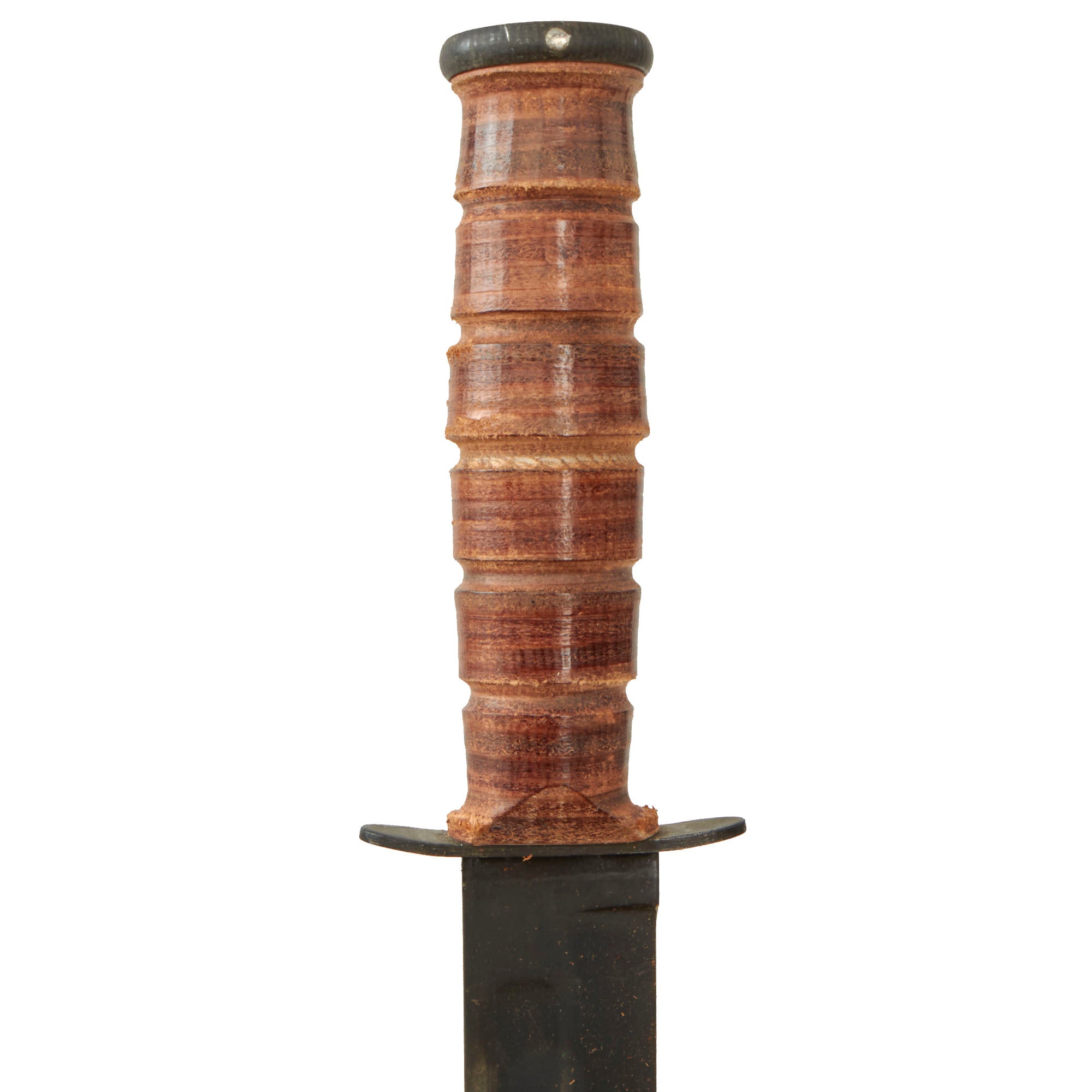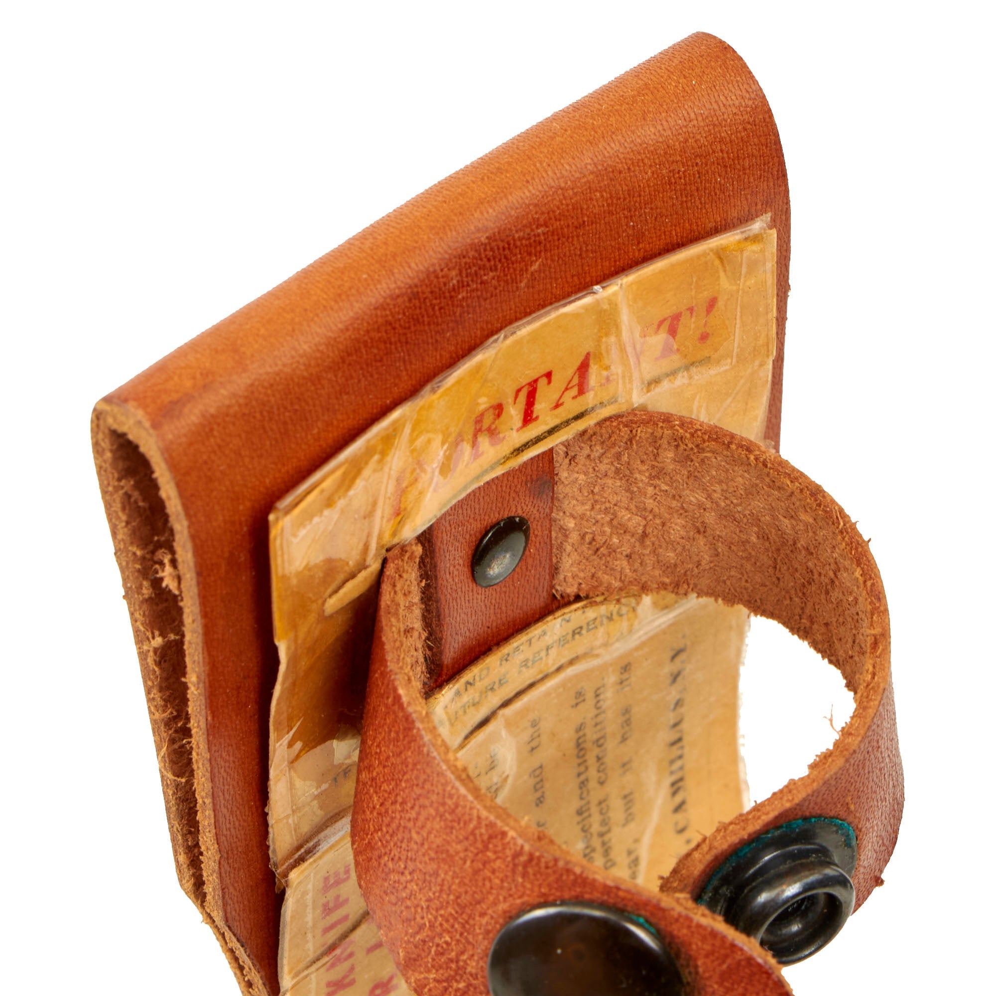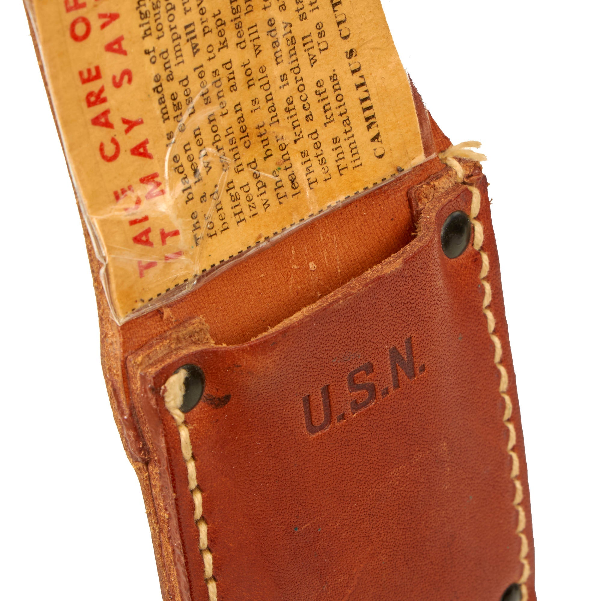 Original Item: Only One Available. This is a great example of the legendary WWII Production USN Mark 2 "Ka-Bar" fighting knife with a leather scabbard. Overall length of this Mk2 is 12 inches, with a 7 inch clip-point blade. Of particular note is an original paper Camillus Cutlery Kabar “Care Card”.