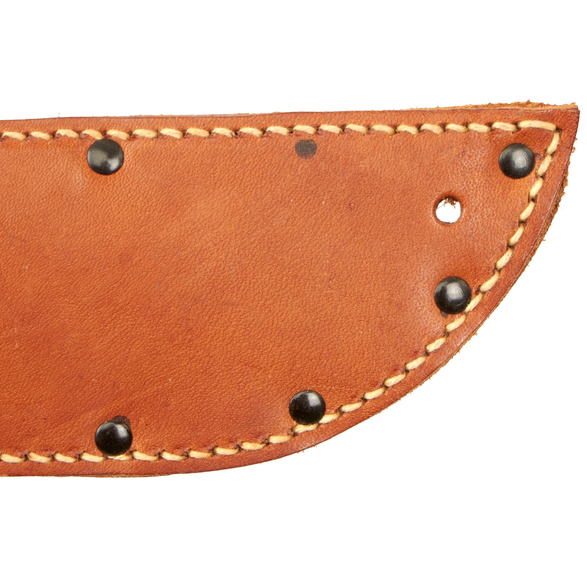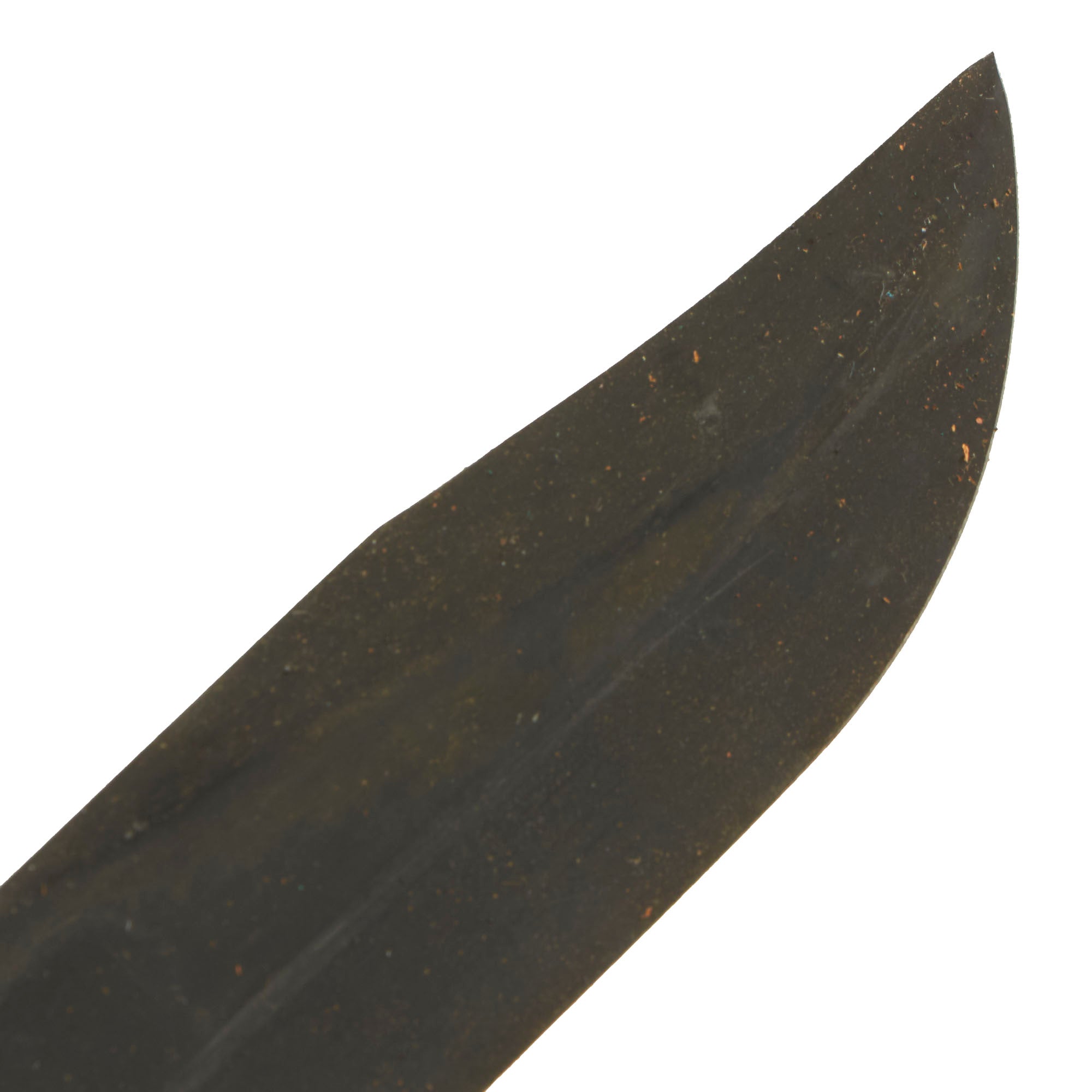 The blade of this example is in great condition, with the original factory grind showing honest use, and still showing a bright steel machined edge on most areas. The original finish is retained at almost 90%. The leather sheath is the standard type used with the Mark 2, and is in very good used condition, marked U.S.N. The leather is in fantastic shape and retains its original color. All of the stitching and staples are still intact, and it is structurally very sound. The securing strap is intact, and the snap is still functional, with a faded finish. There is a care card attached to the belt loop which was more than likely added for display purposes. The metal fittings of the sheath have a small bit of verdigris.