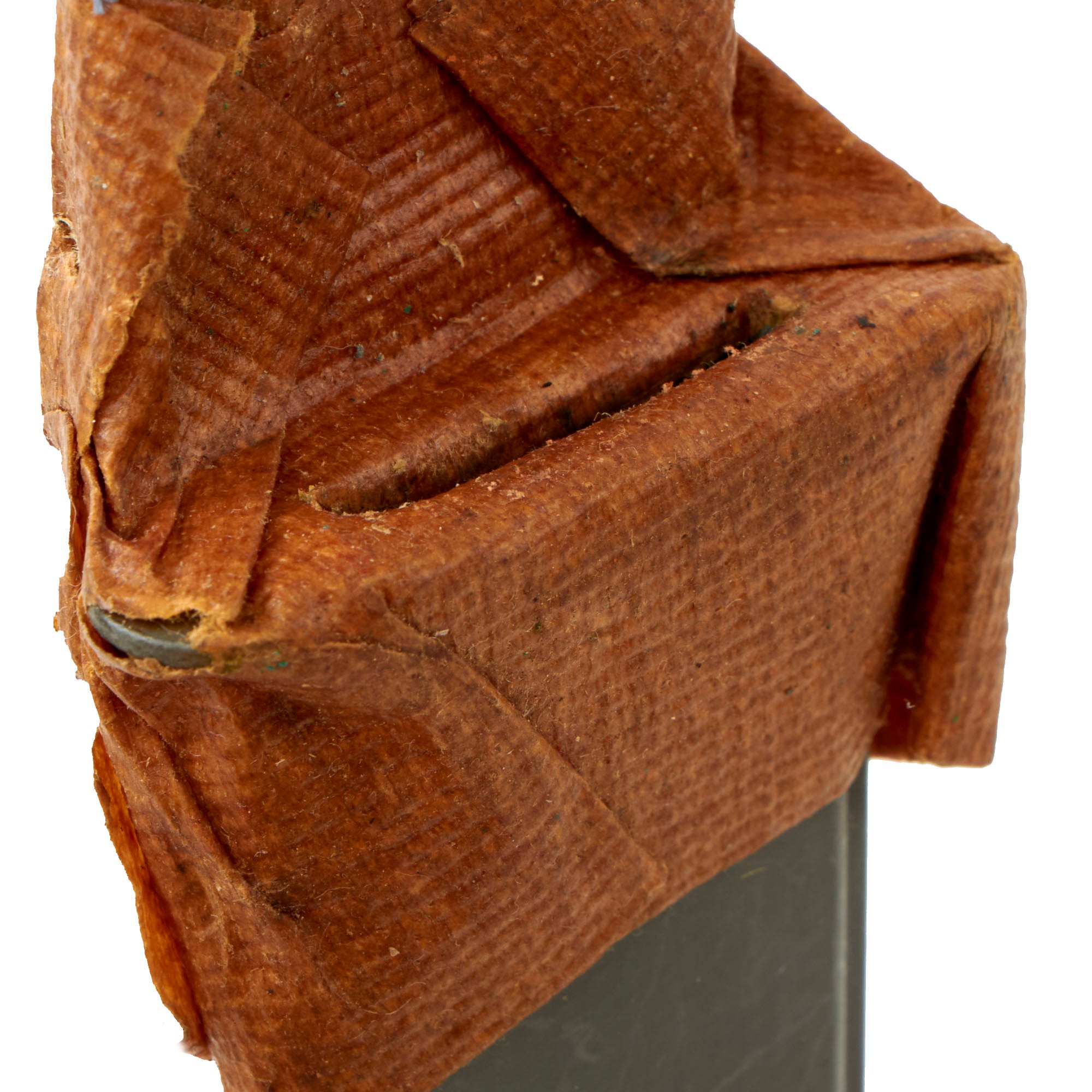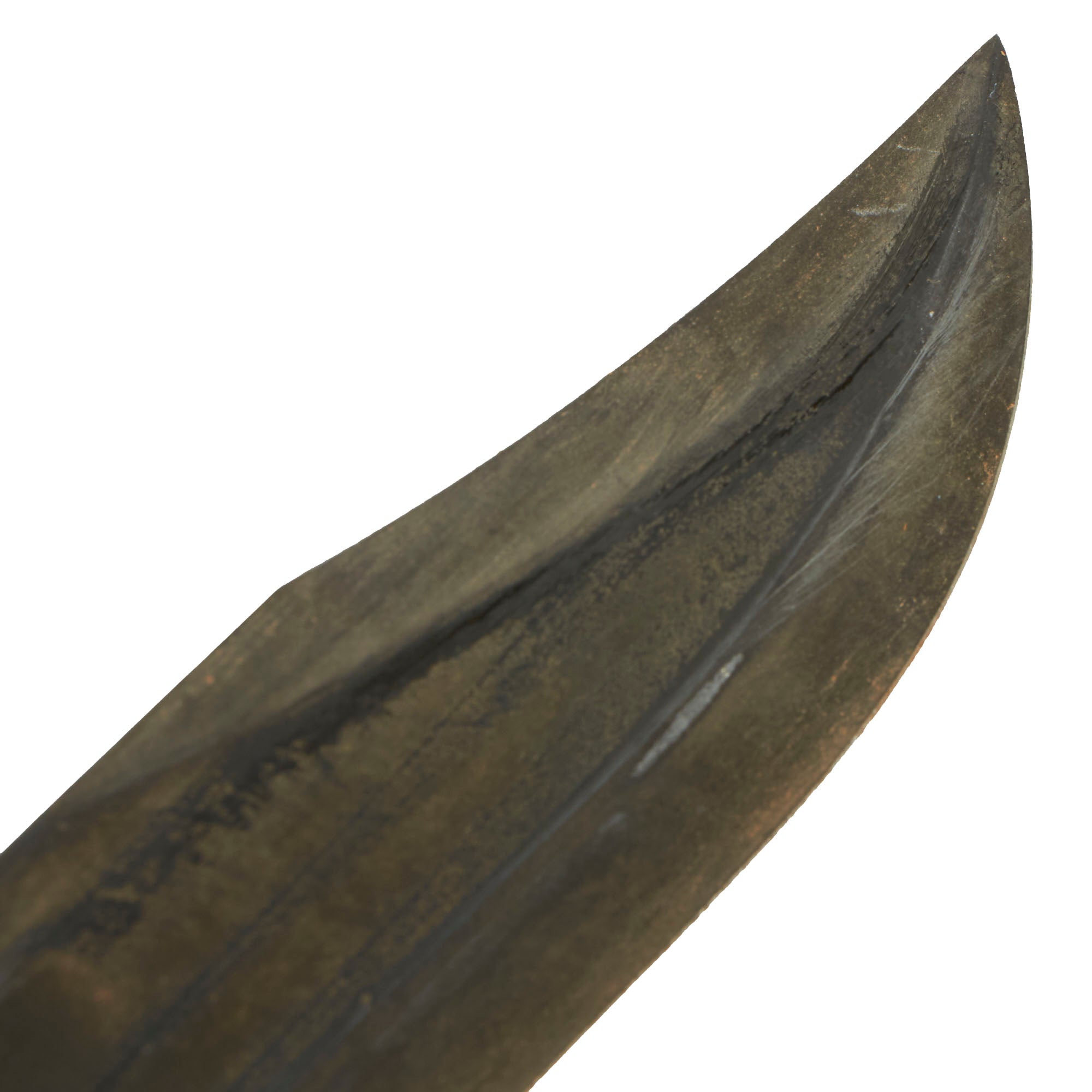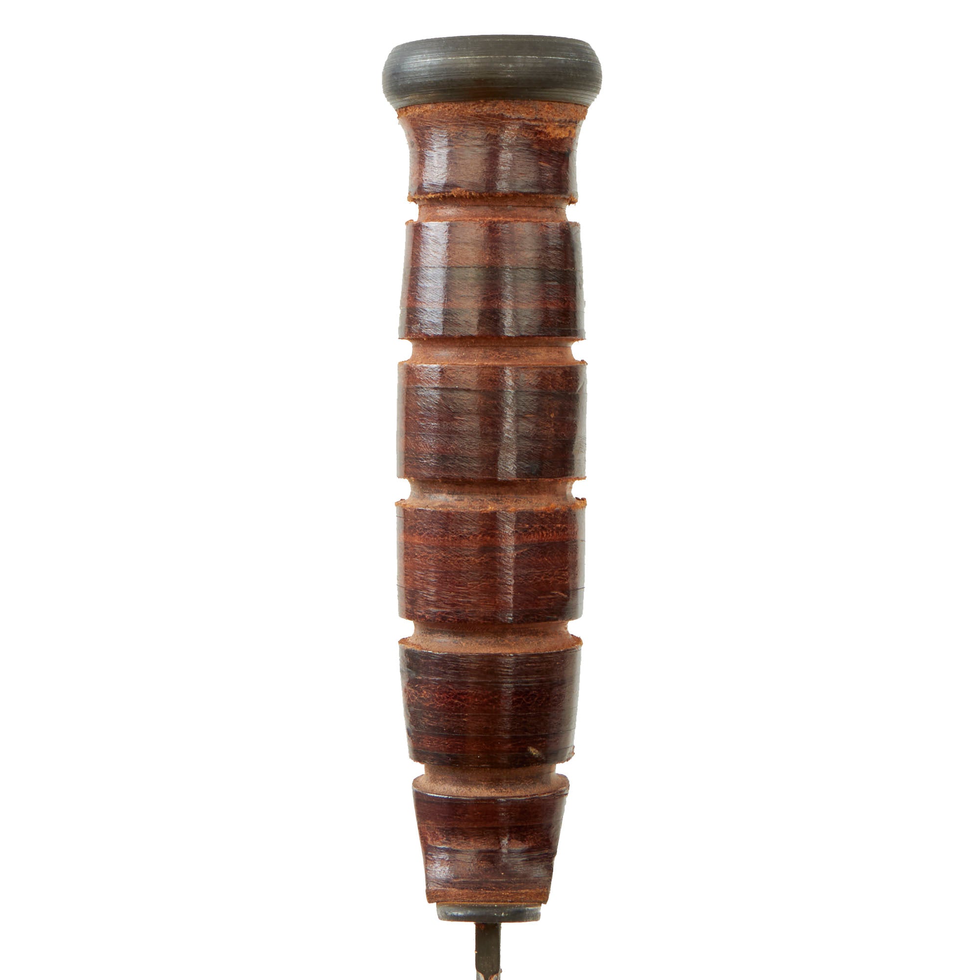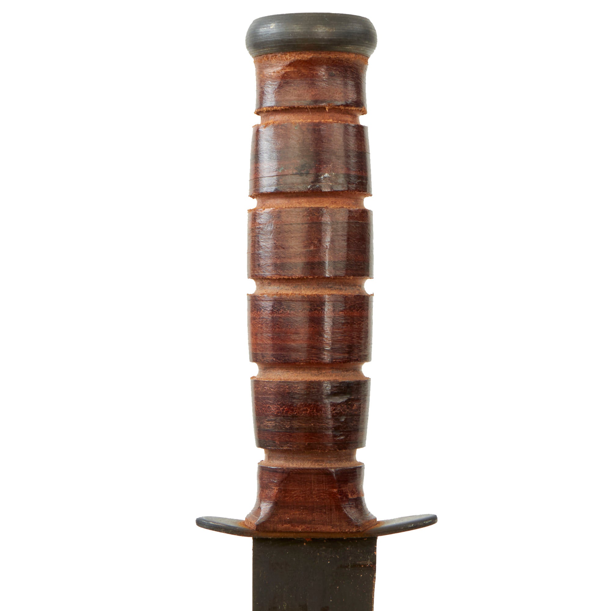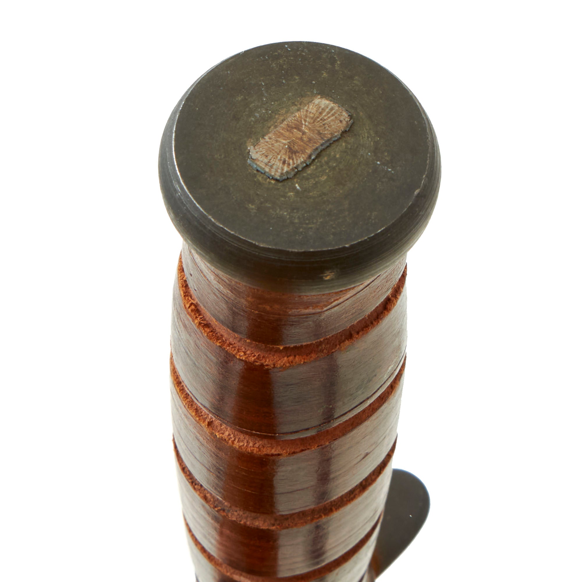 In 1944, the US Navy put through a change order to have the markings moved from the blade to the cross guard, so this knife was produced after that change. The cross guard is slightly swept back, indicating later war production. It features original stacked leather washer grip, which is in very good condition with no cracks or splitting. There is some light wear and staining, but it still has much of the original "polished" finish. It has a 3/8" steel pommel with a rectangular tang, correct for circa 1944 manufacture. The handle, pommel, and cross guard are all mostly tight to the blade, with some oxidation on the cross guard due to moisture exposure.