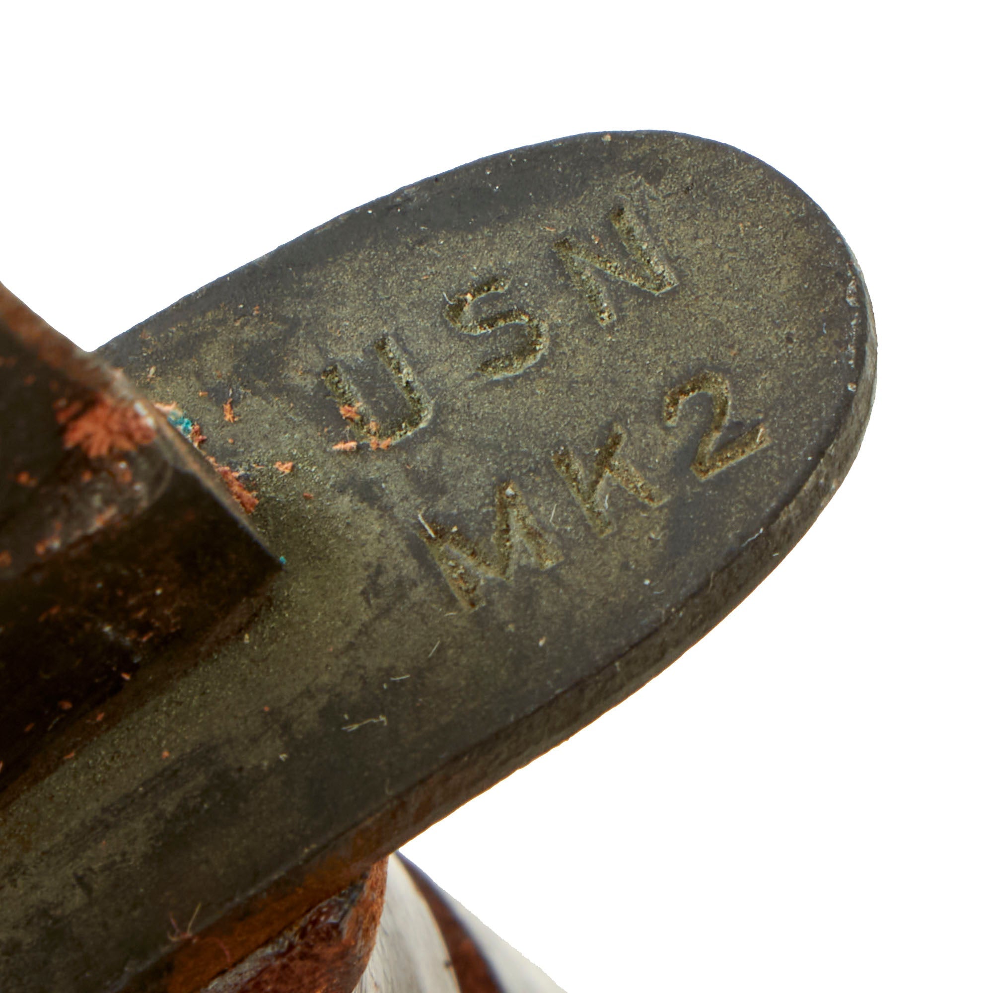 This is a great example of the legendary WWII Production USN Mark 2 "Ka-Bar" fighting knife with a near unissued condition MK2 Fiberglass Scabbard. Overall length of this Mk2 is 12 inches, with a 7 inch clip-point blade. The markings on the crossguard are as follows: