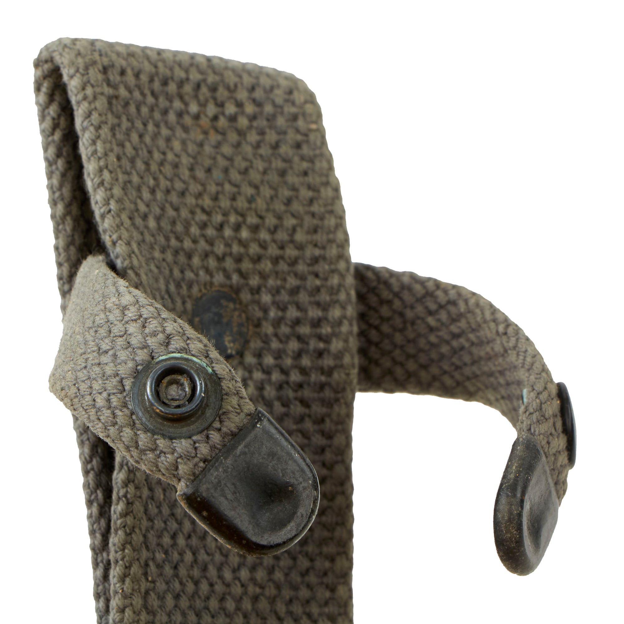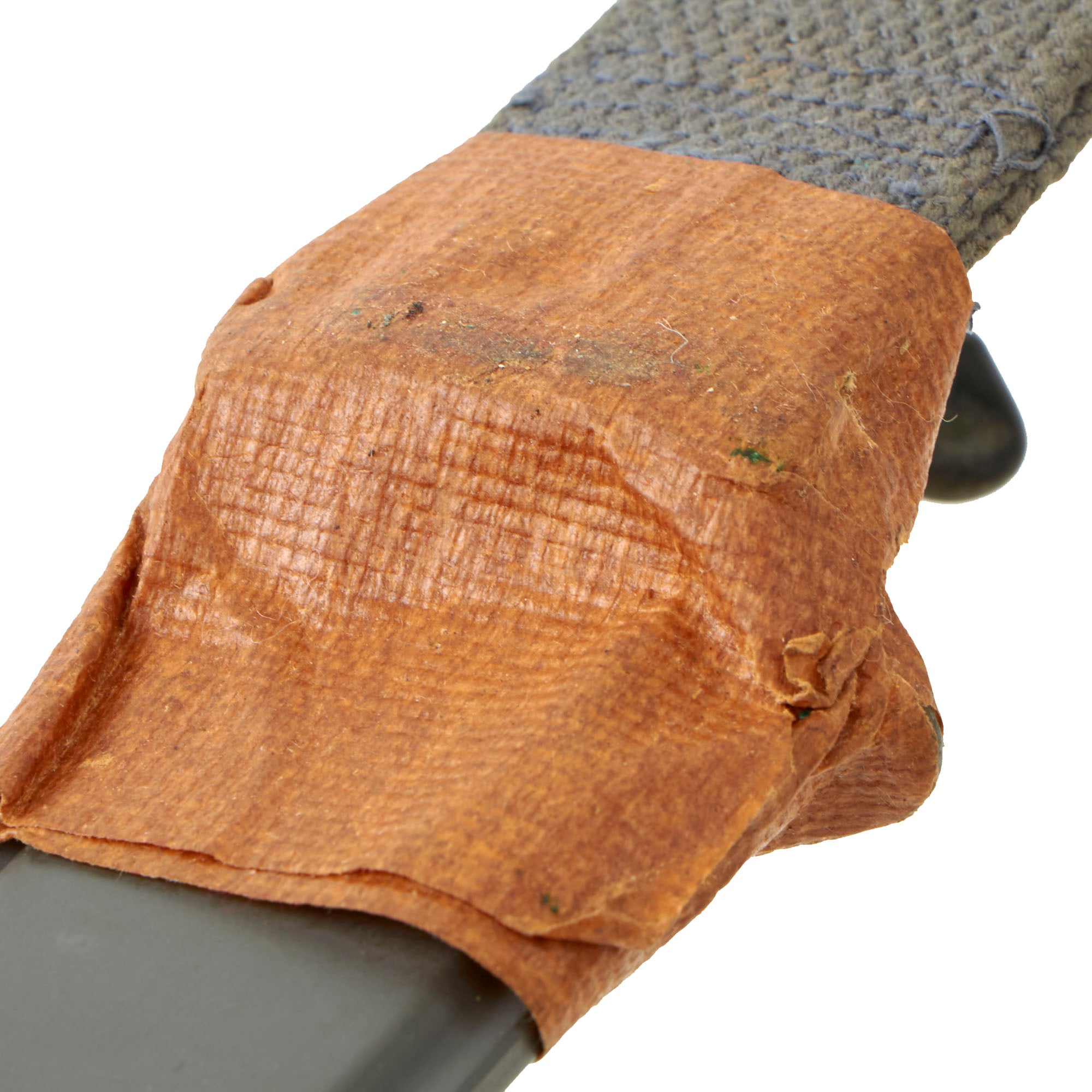 The scabbard is the Mk2 version, very similar in construction to the M8 scabbard for the M3 fighting knife, with a thermoplastic impregnated cotton fabric body, metal throat, and canvas frog and securing strap. The front of the throat is marked U.S.N. / MK 2, and the rear is marked NORD - 8114 / B.M. Co. with a stylized V P logo. The NORD number is for the US Navy contract it was produced under, which was delivered between March 1945 and May 1945. It was manufactured by Beckwith Mfg Co., a division of Victory Plastics. The scabbard is in very good lightly used condition, with just some oxidation near the throat area and on the rivets due to moisture exposure. The securing strap is fully functional, with a functional snap.