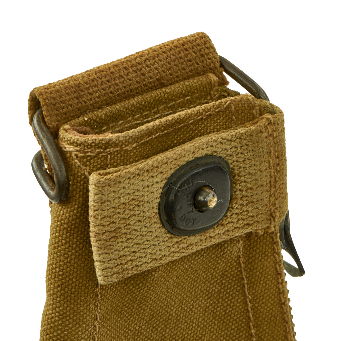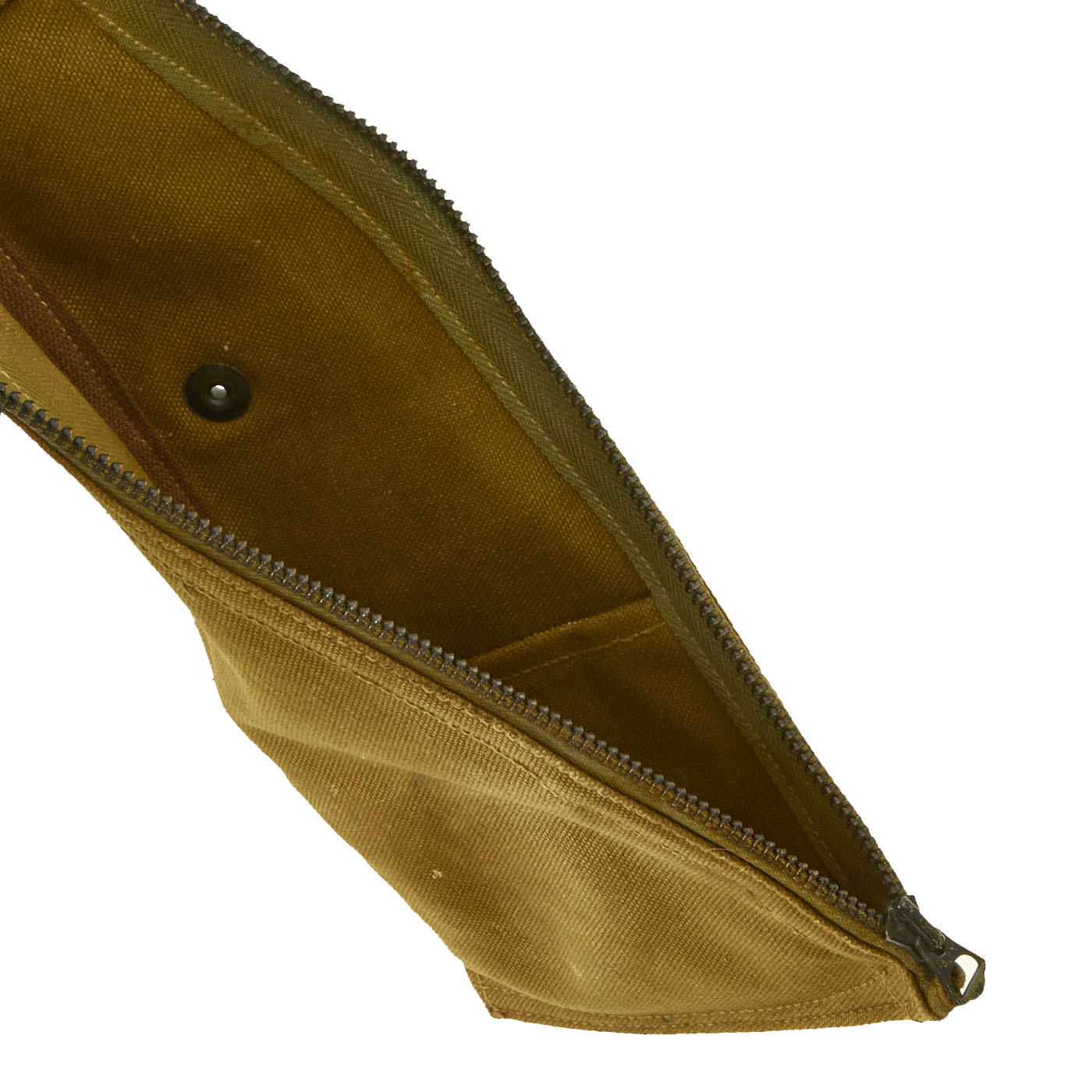 The scabbard is fully functional, with all snaps and the zipper still intact. There is some wear on the canvas, as expected of any item that was used in service and in long time storage. still retains the OD Green color well. The sharpening stone is present and the interior pockets still contain three small manuals (reprinted): CARE, USE AND SHARPENING OF KNIFE LC-14-B, FIGHTING WITH U.S.A. KNIFE LC-14-B (THE WOODMAN'S PAL) and the missing book is LIVING IN THE JUNGLE WITH THE U.S. ARMY KNIFE LC-14-B(THE WOODMAN’S PAL), all three written by Frederick Ehrsam, C.E., and copyrighted 1942. The booklets are in great condition and are completely legible.