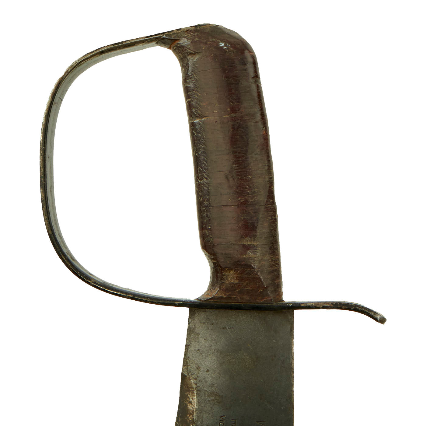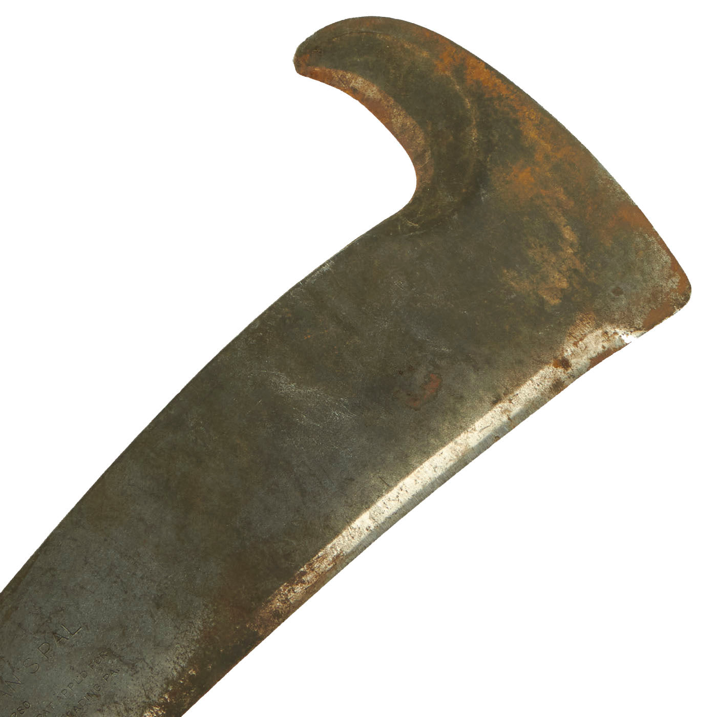 The LC-14-B Woodman's Pal served through the Vietnam War and is still part of the military inventory of edged tools in the 21st Century. This example is in great unused condition, with little wear and corrosion from long storage. The edges are all still solid, with no chipping. The stacked leather handle is intact, and in great shape.
