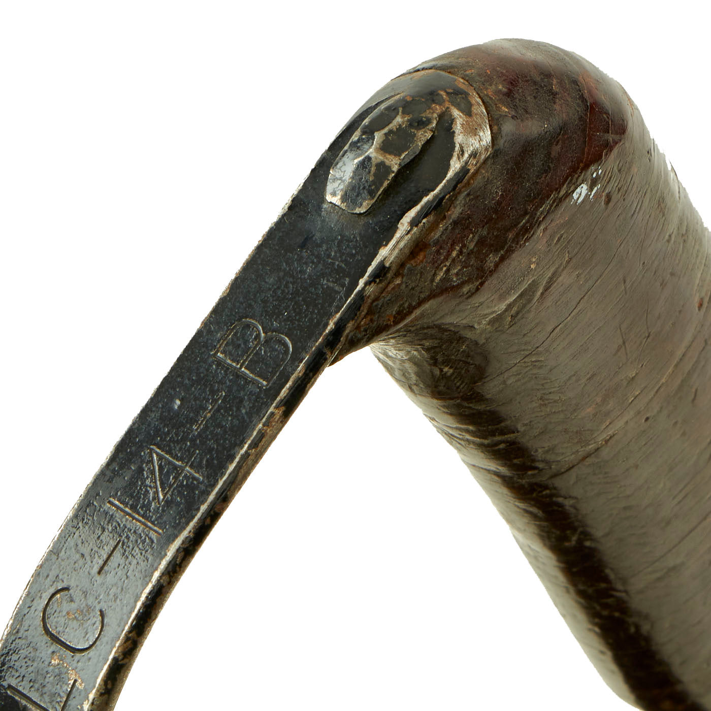 It is further marked on the outside of the handguard with LC-14-B. No presence of a patent number on the blade indicates production before 11-30-1943, when the patent was approved. The belt scabbard is also marked on the interior: